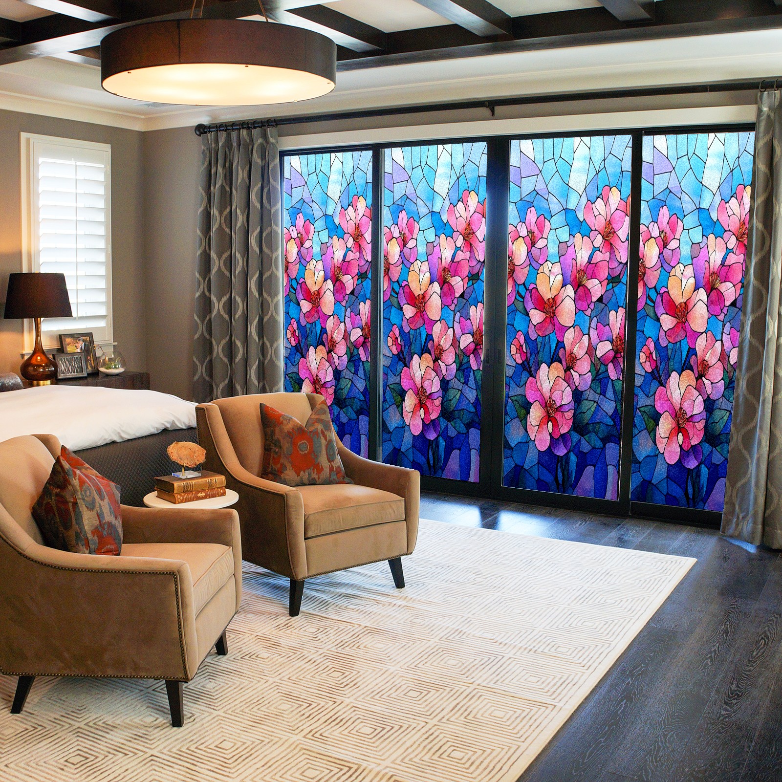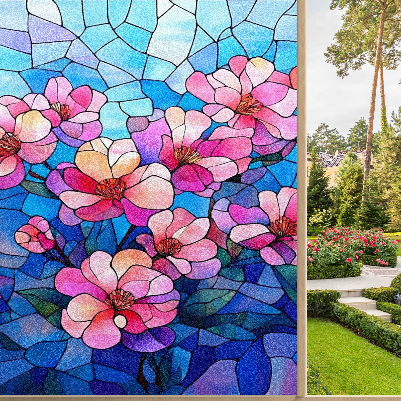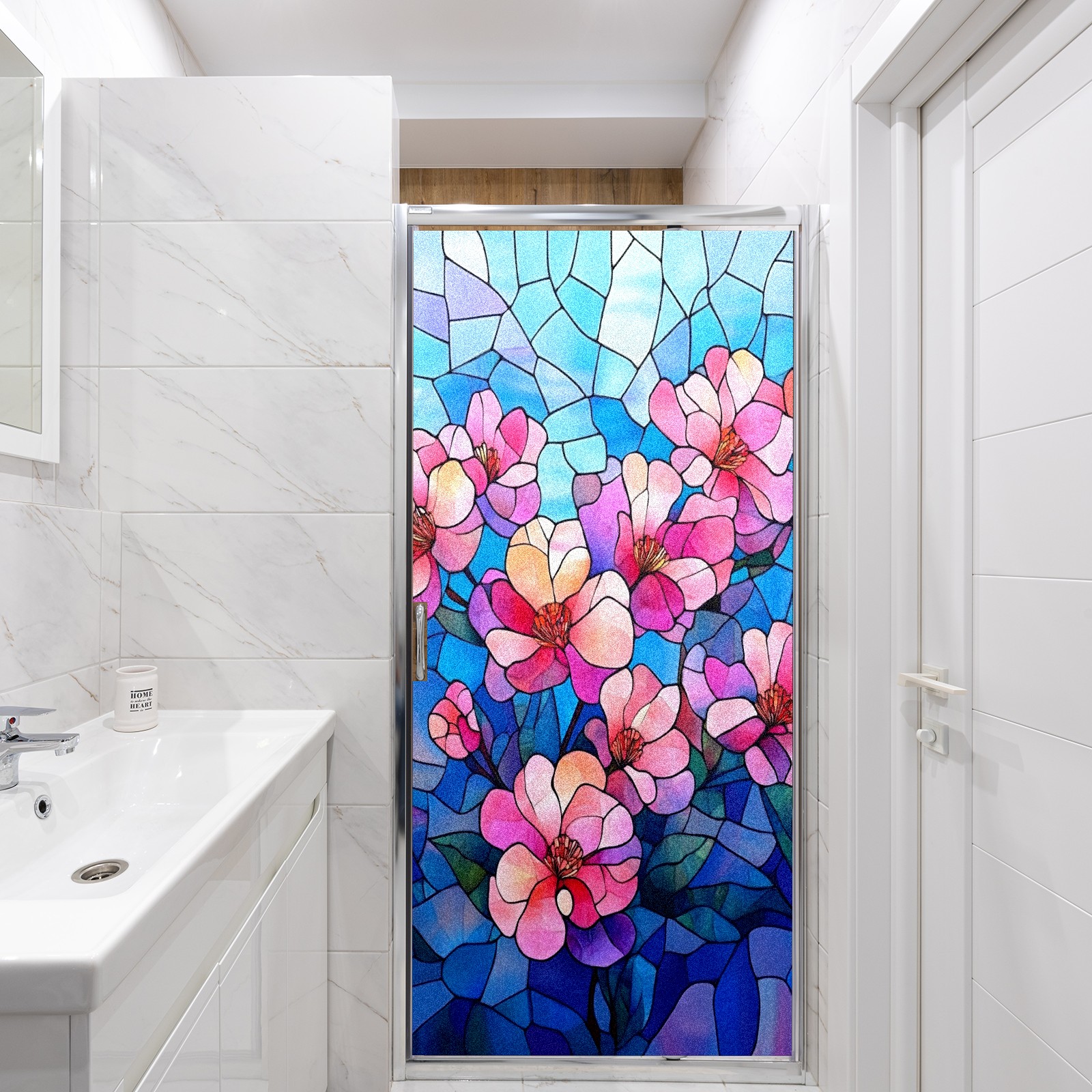 Frosted Glass Window Film Privacy Film Decorative Static Cling Window Film Stained Glass Decals for Bathroom Shower Door Non Adhesive Pink Flowers (17.7x23.6in)