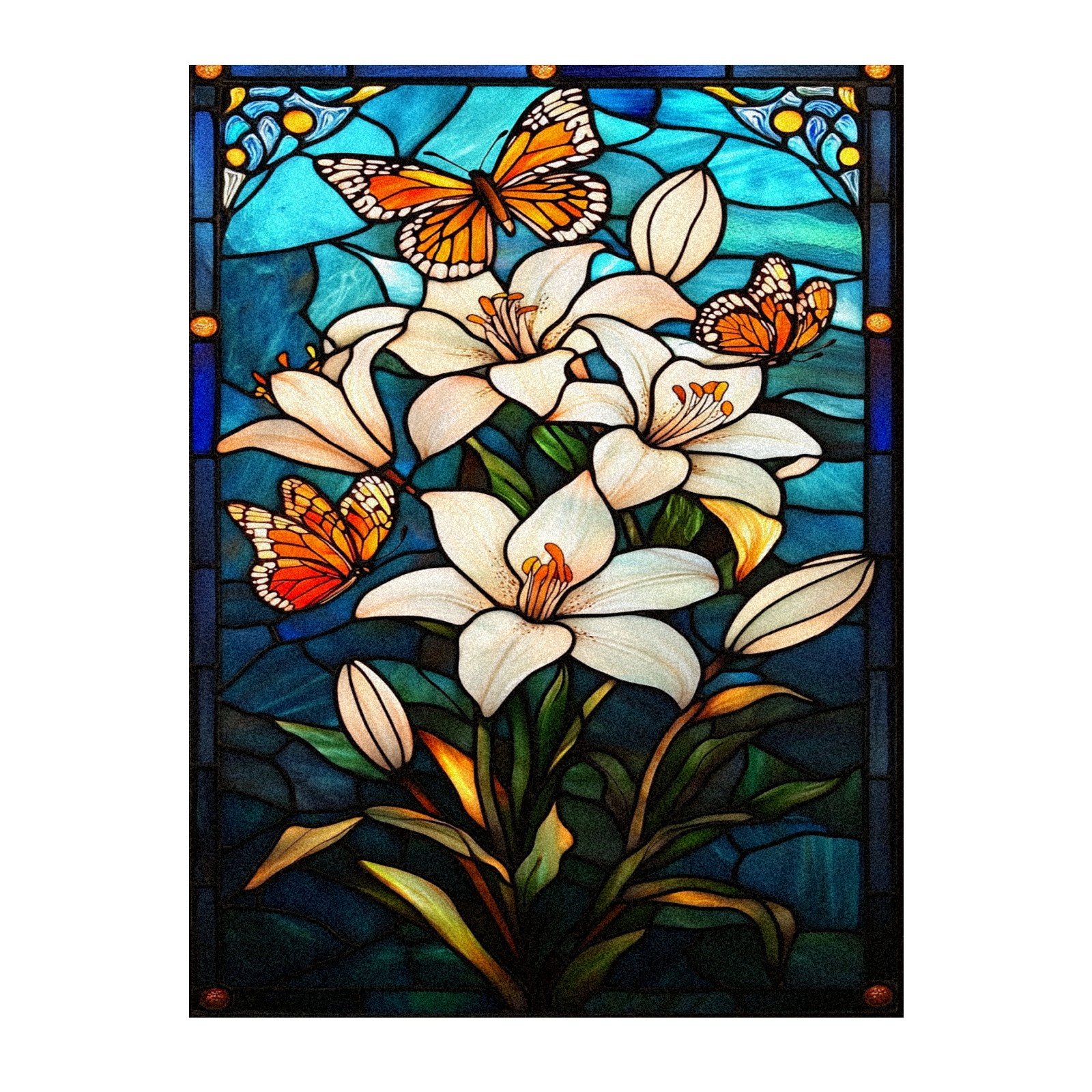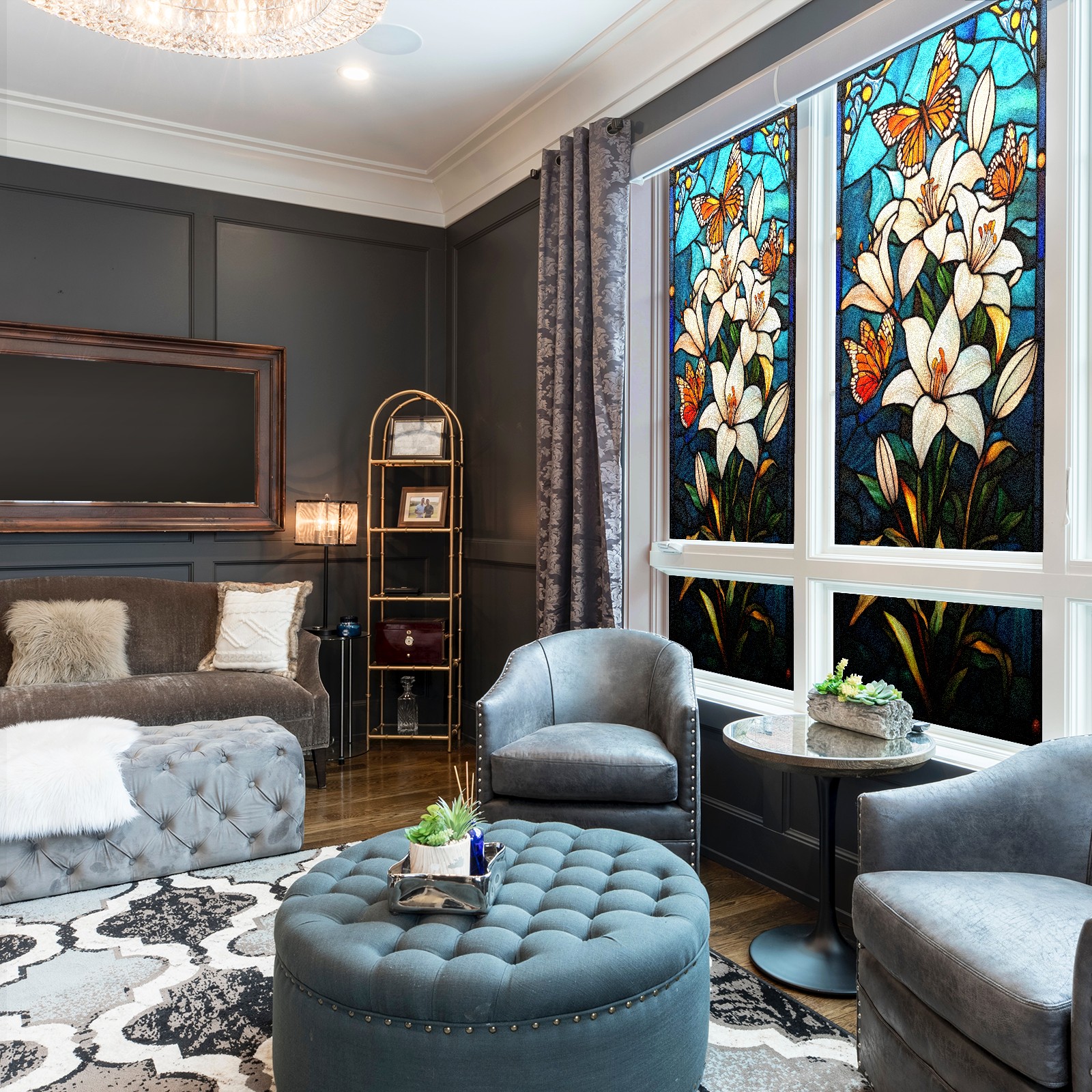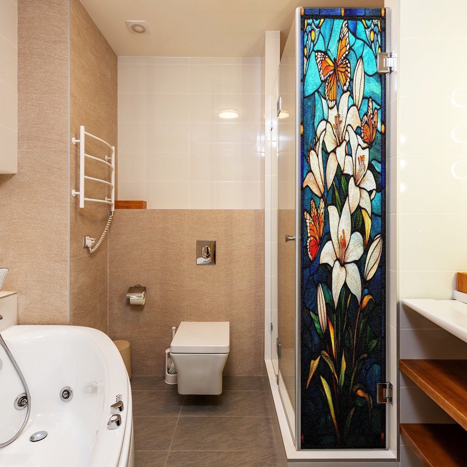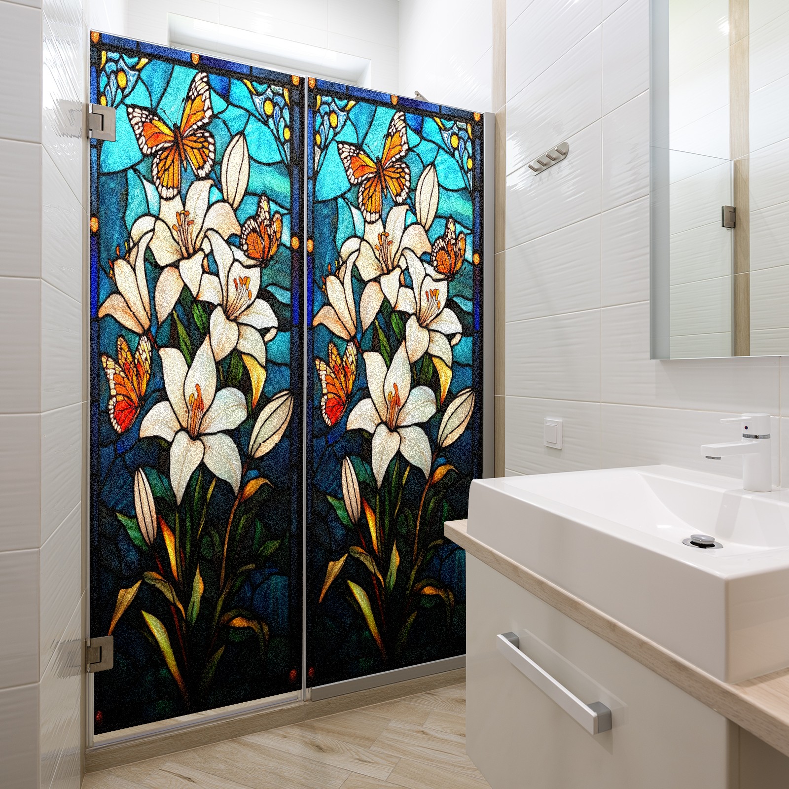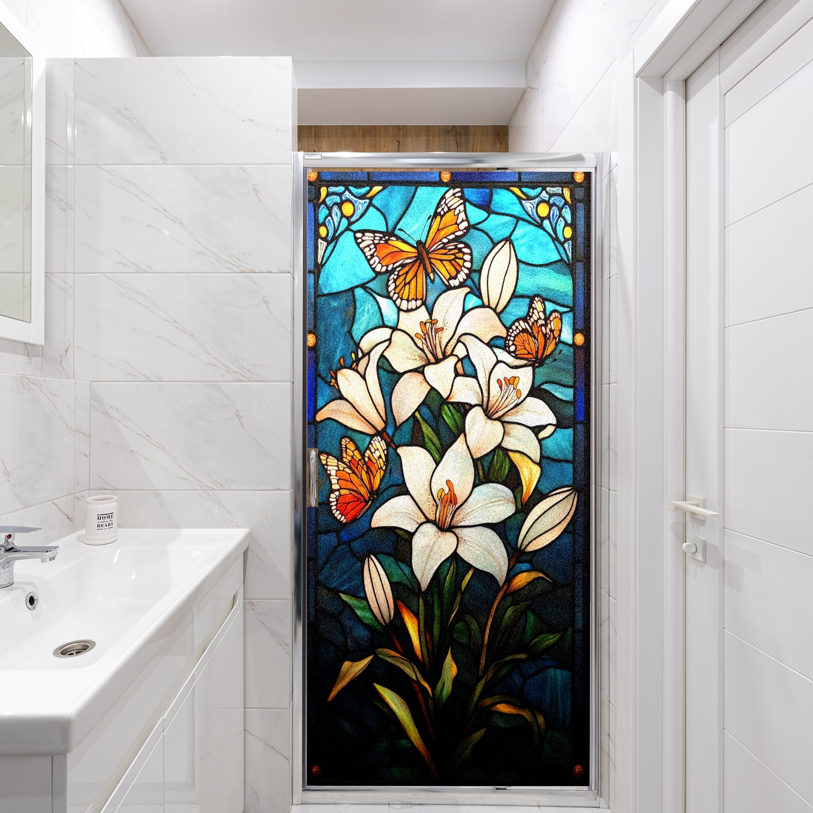 Frosted Glass Window Film Privacy Film Decorative Static Cling Window Film Stained Glass Decals for Bathroom Shower Door Non Adhesive Lilies And Butterflies (17.7x23.6in)