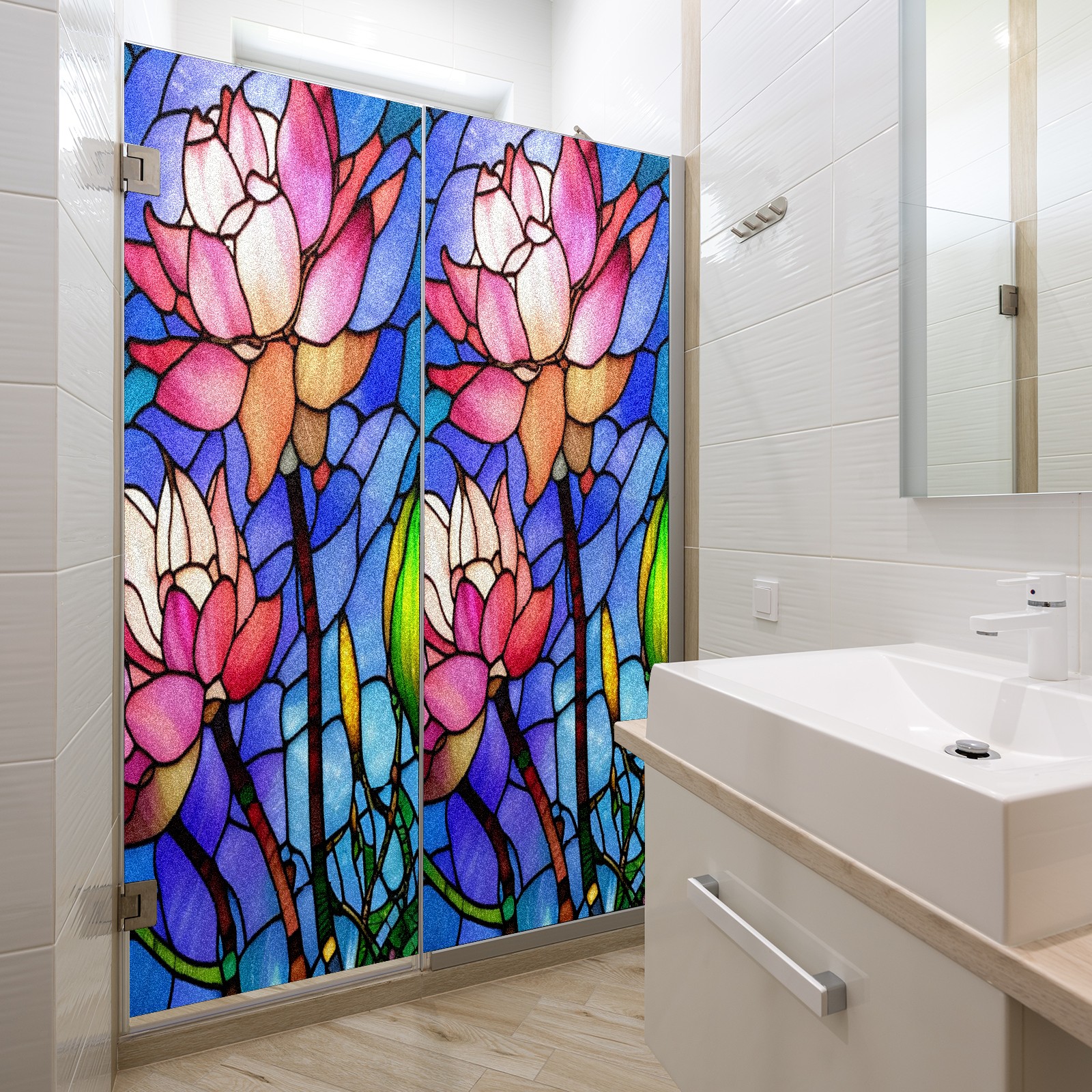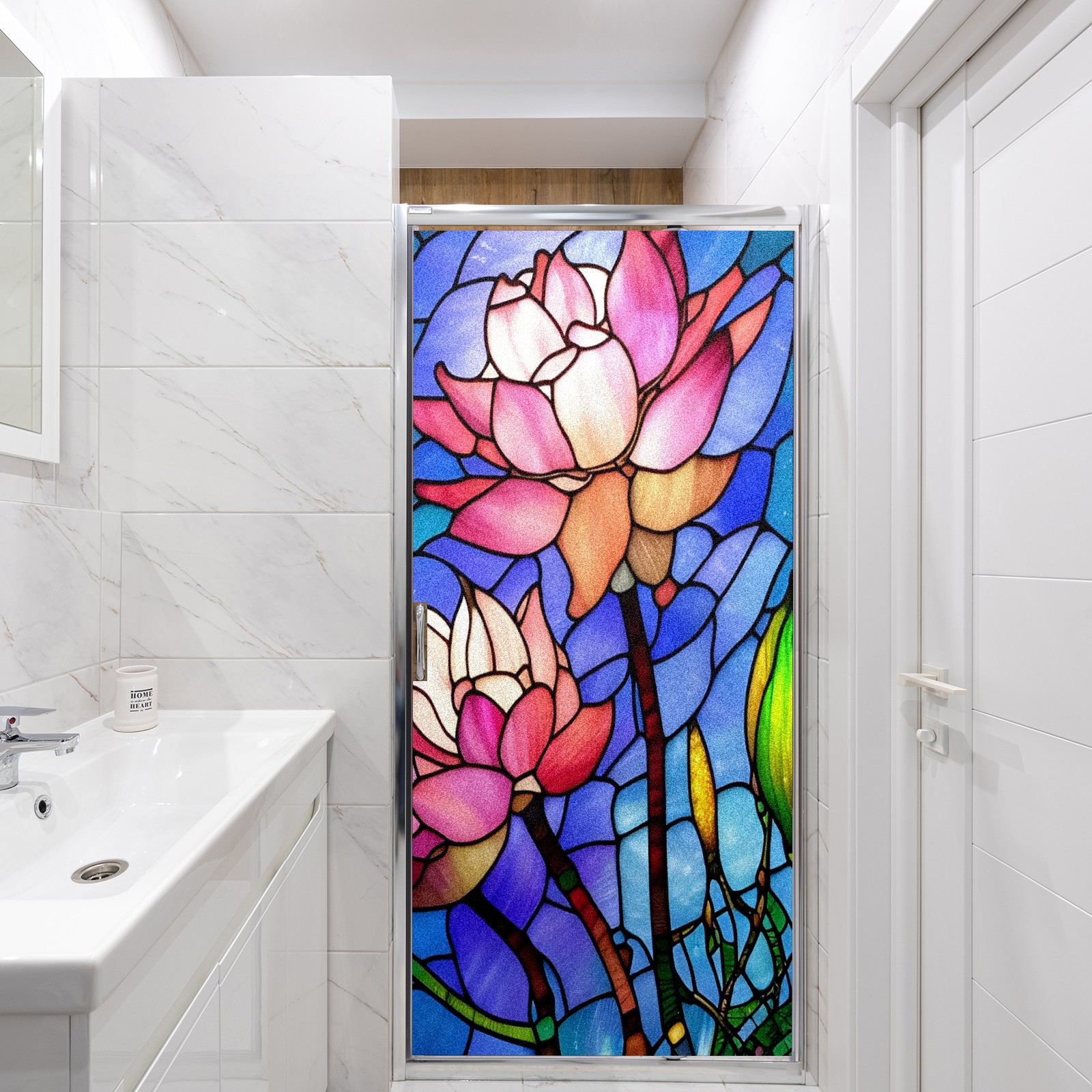 Frosted Glass Window Film Privacy Film Decorative Static Cling Window Film Stained Glass Decals for Bathroom Shower Door Non Adhesive Pink Lotus Flower (17.7x23.6in)
