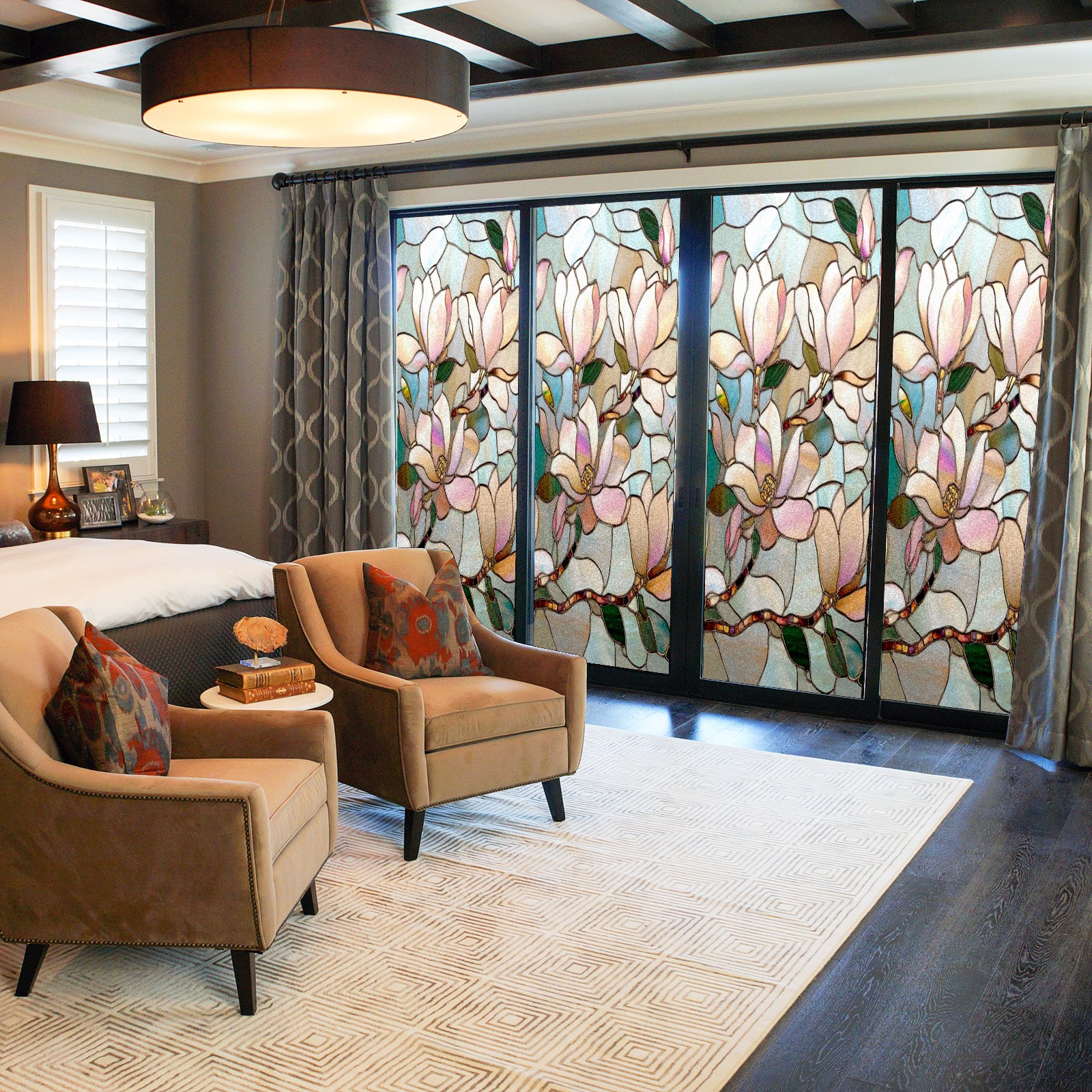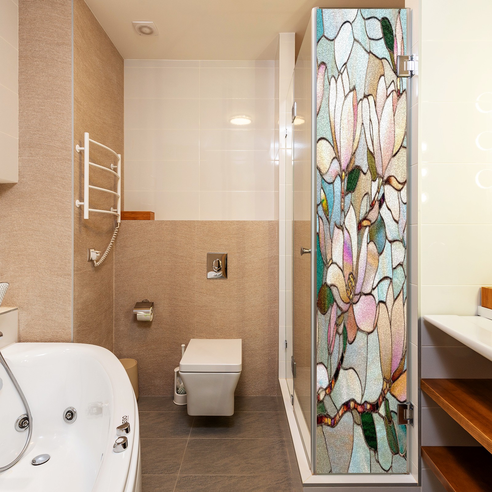 Frosted Glass Window Film Privacy Film Decorative Static Cling Window Film Stained Glass Decals for Bathroom Shower Door Non Adhesive Pink Floral (17.7x23.6in)
