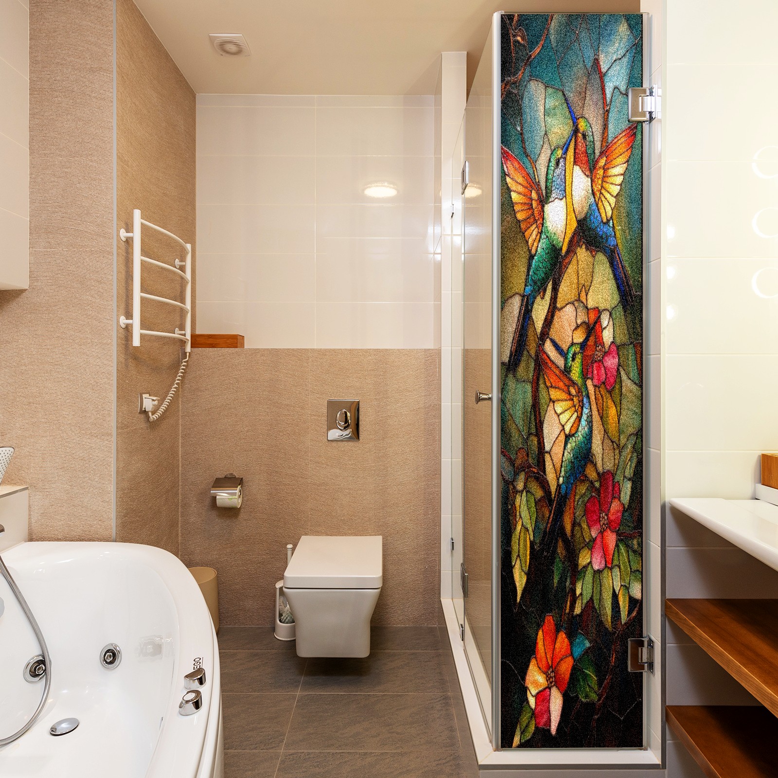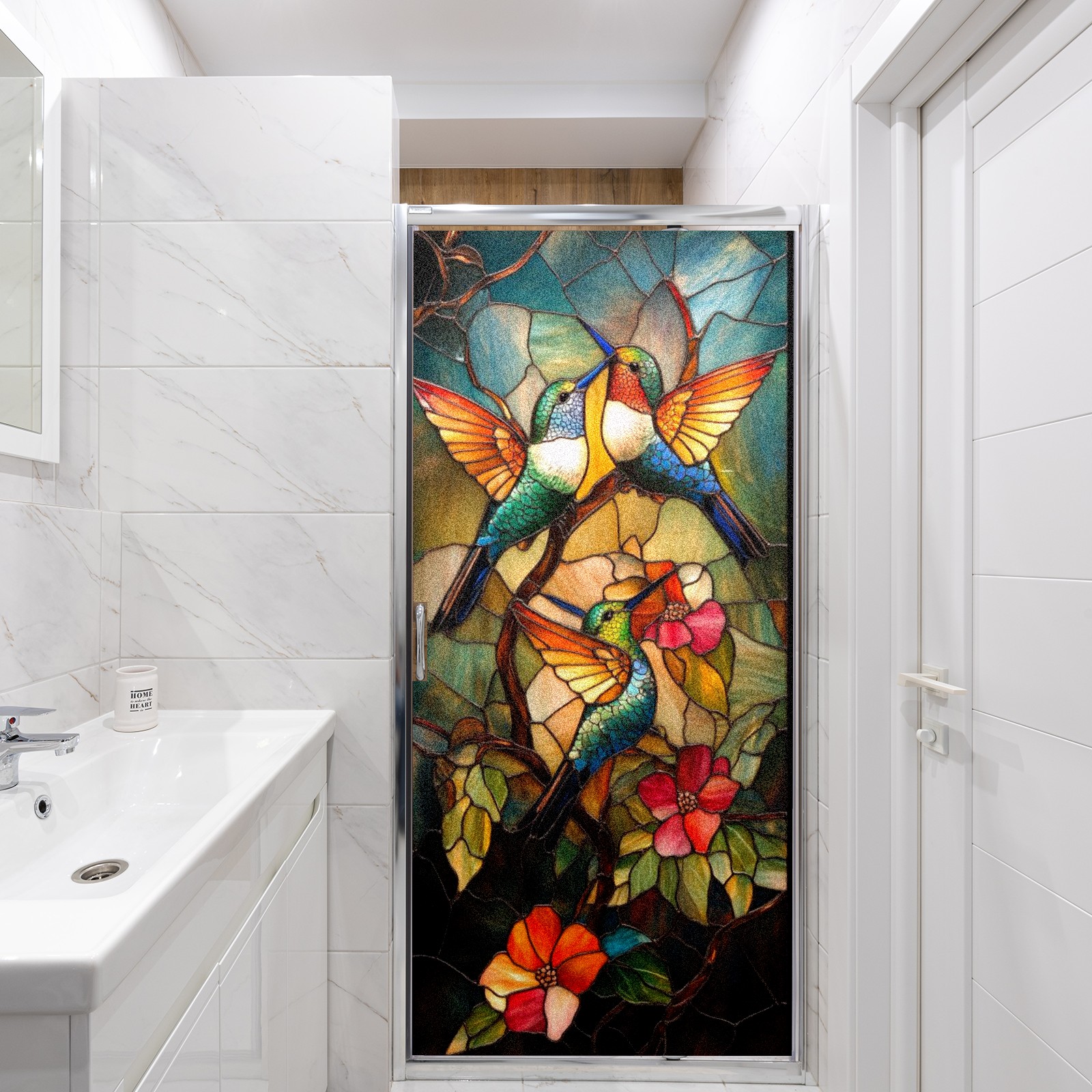 Frosted Glass Window Film Privacy Film Decorative Static Cling Window Film Stained Glass Decals for Bathroom Shower Door Non Adhesive Hummingbirds Flowers (17.7x23.6in)