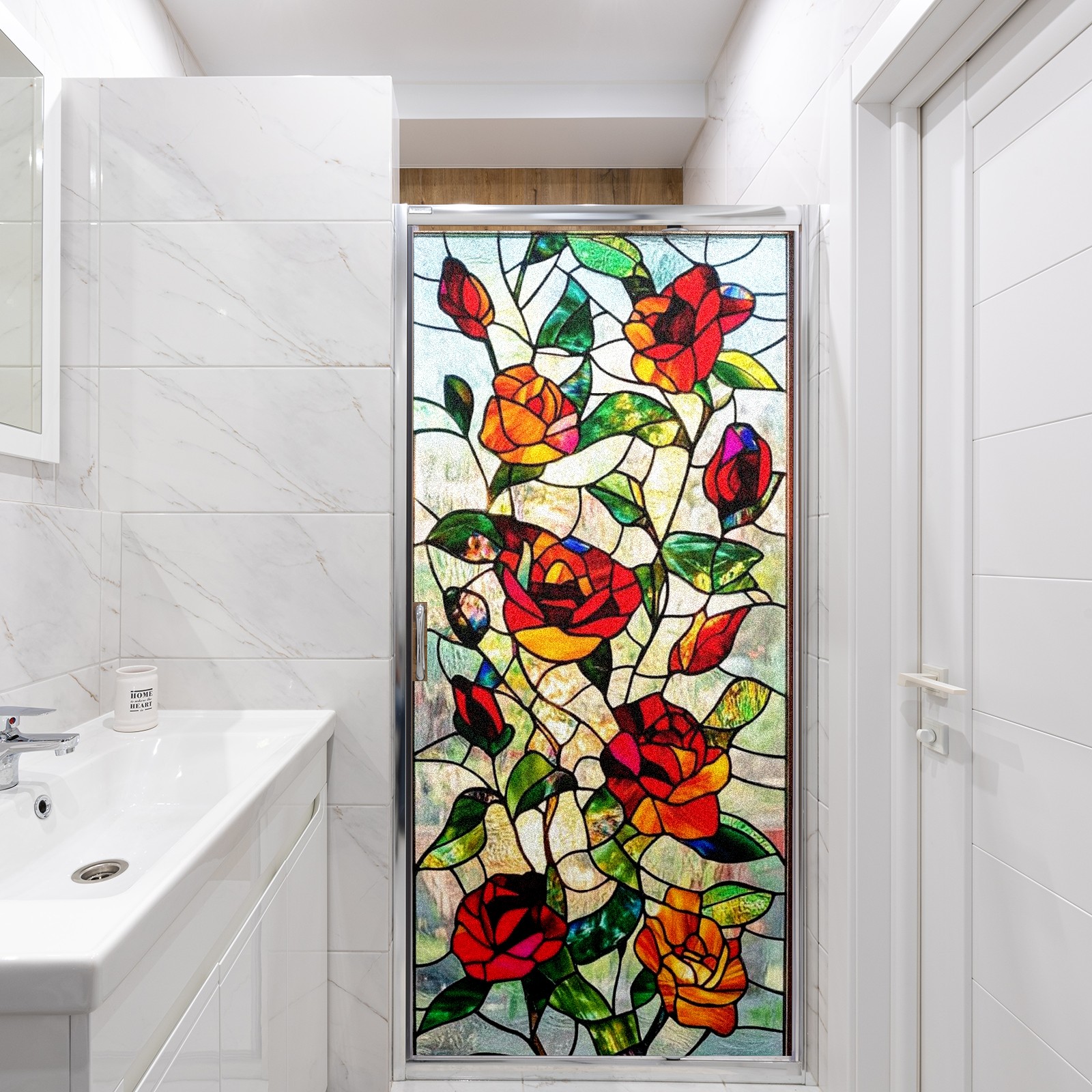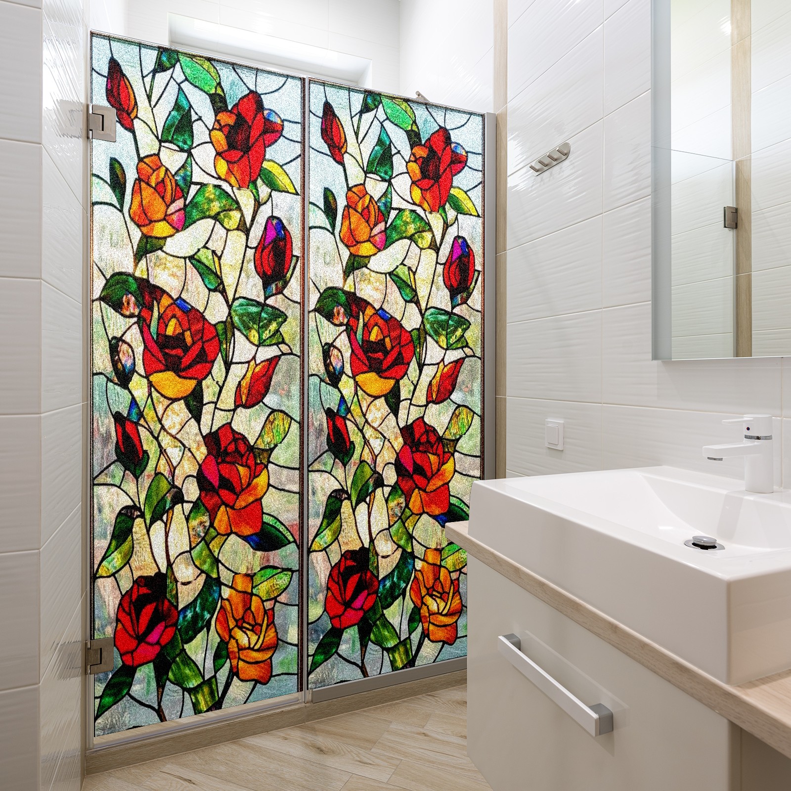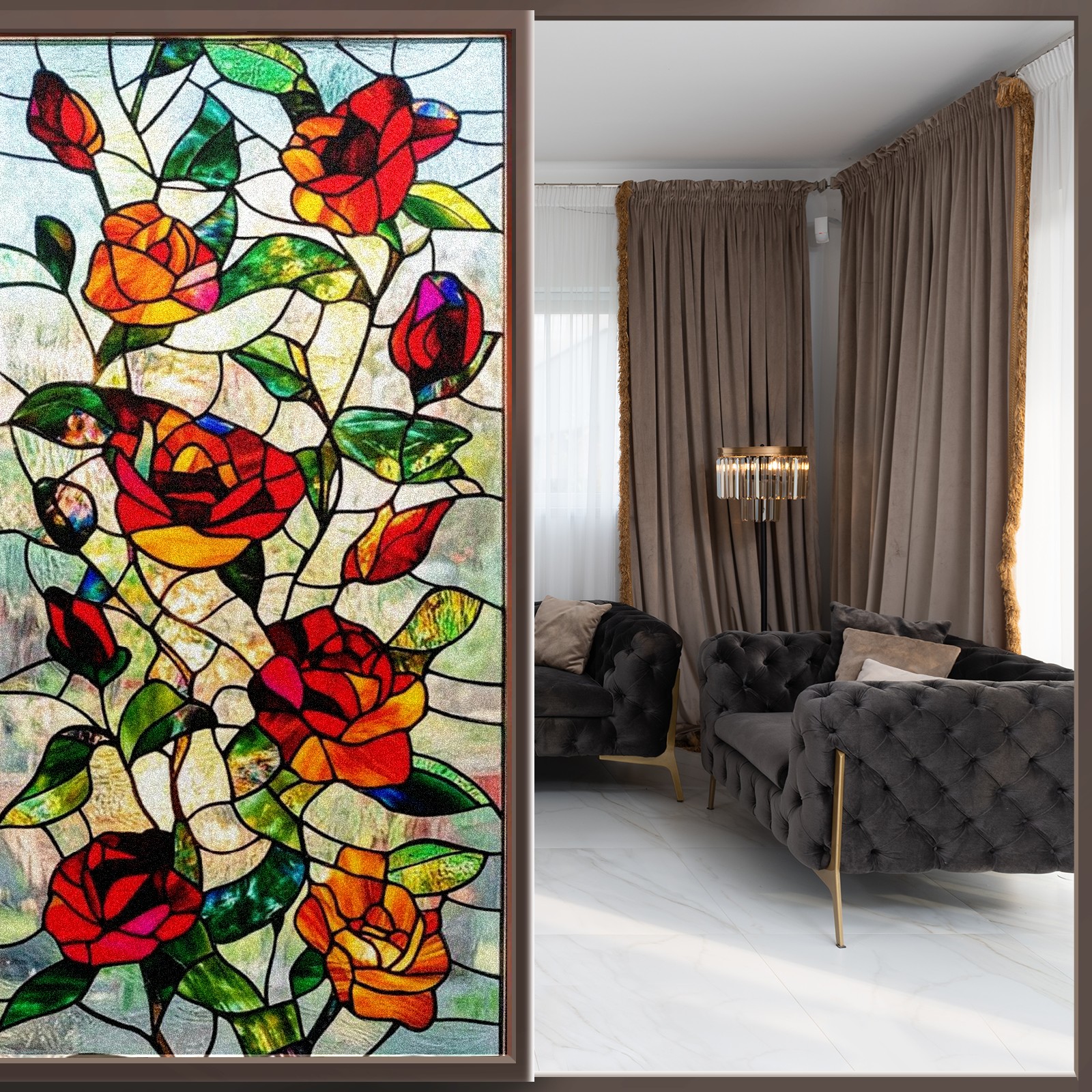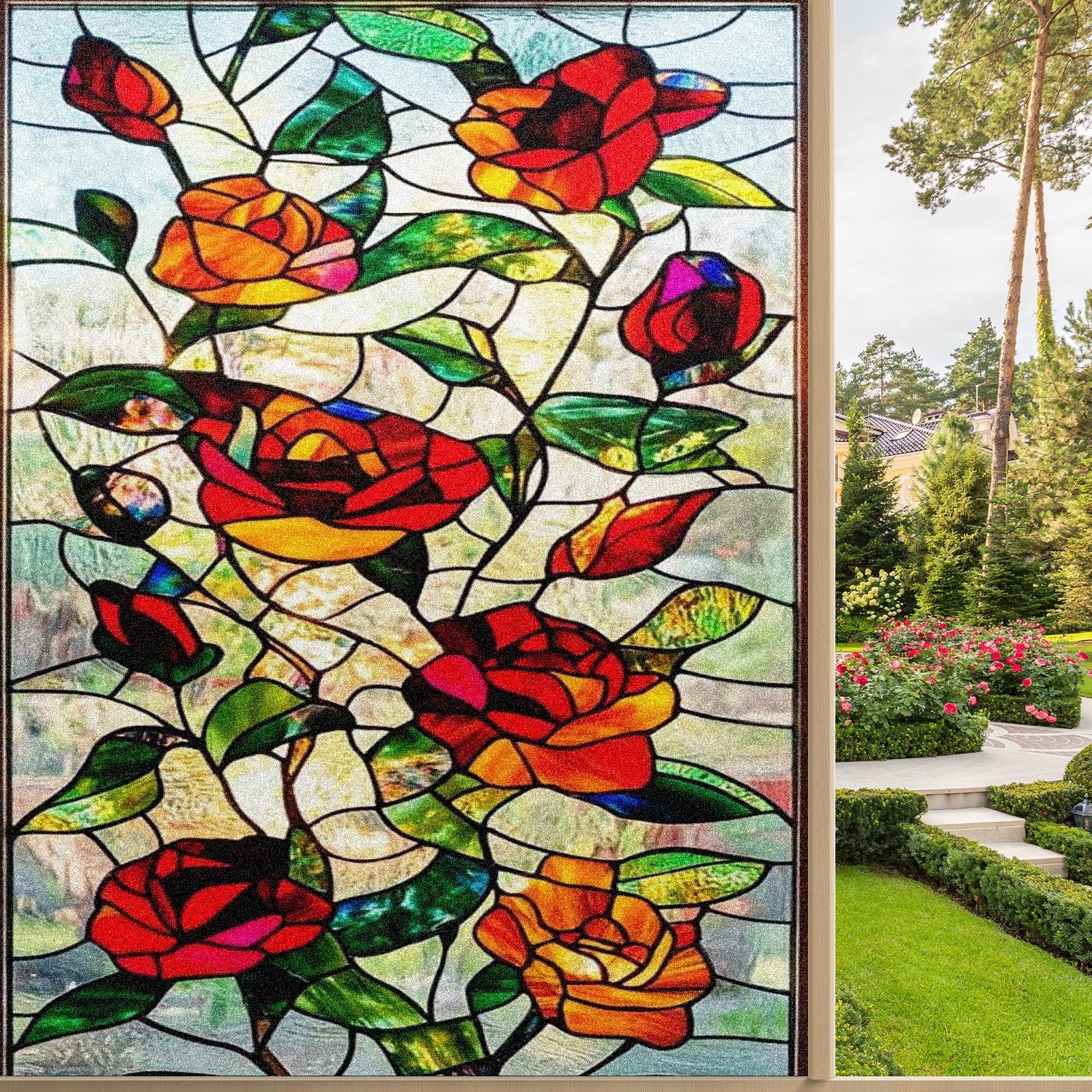Frosted Glass Window Film Privacy Film Decorative Static Cling Window Film Stained Glass Decals for Bathroom Shower Door Non Adhesive Red Orange Rose Flowers (17.7x23.6in)