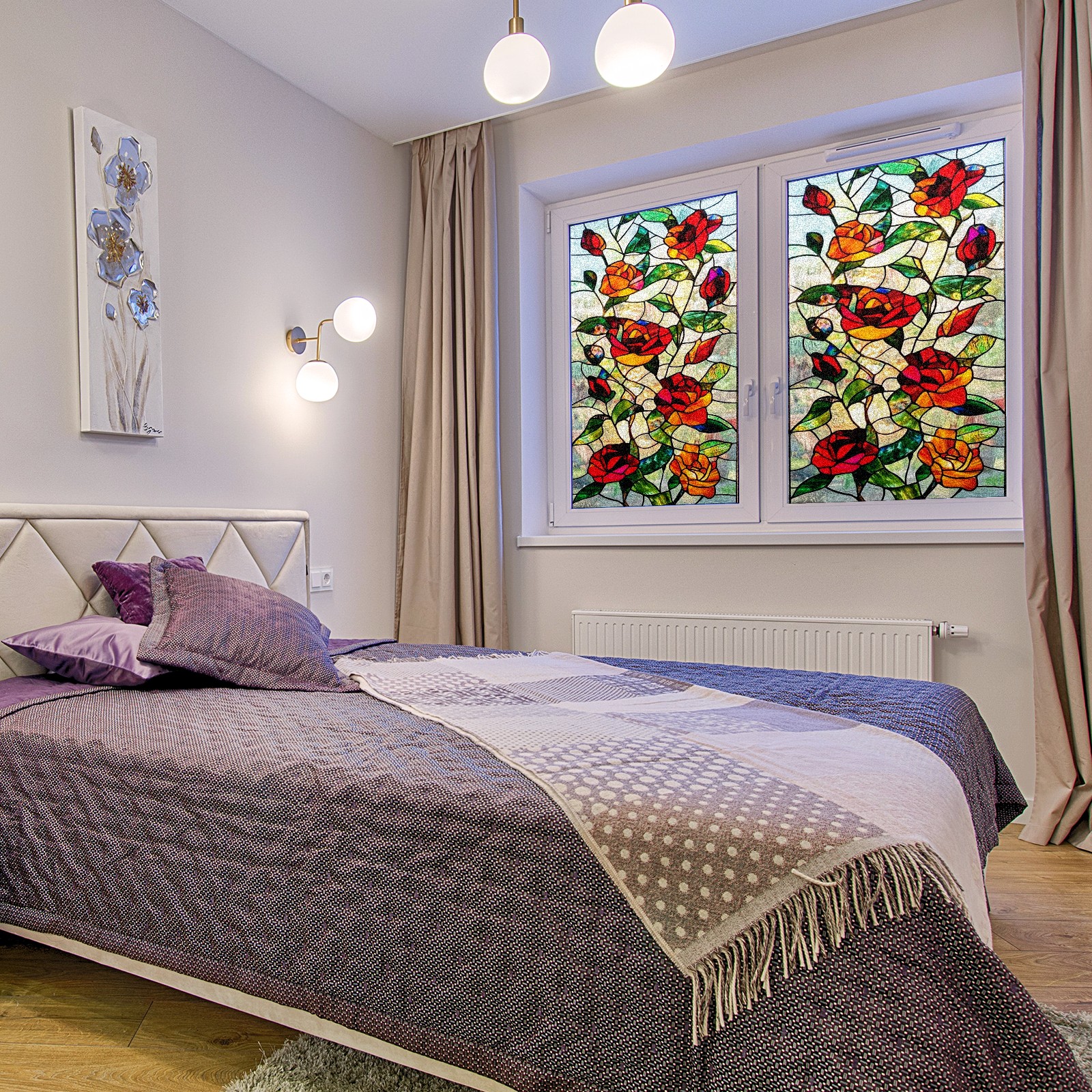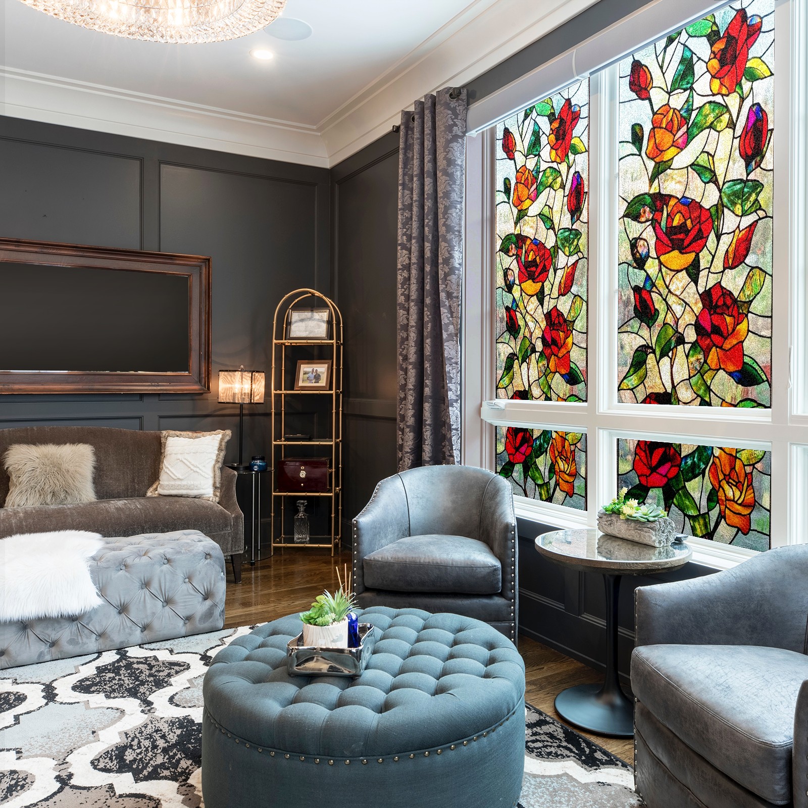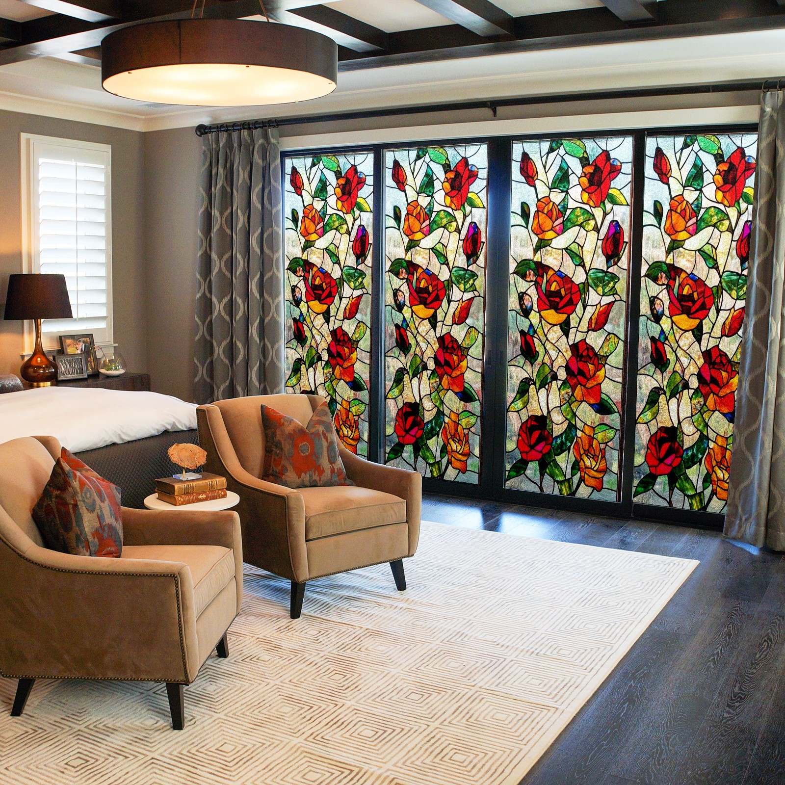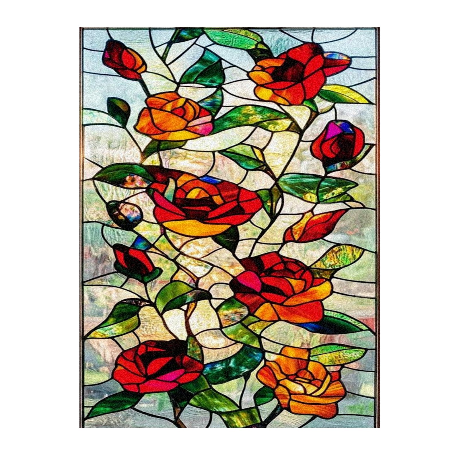 Frosted Glass Window Film Privacy Film Decorative Static Cling Window Film Stained Glass Decals for Bathroom Shower Door Non Adhesive Red Orange Rose Flowers (17.7x23.6in)