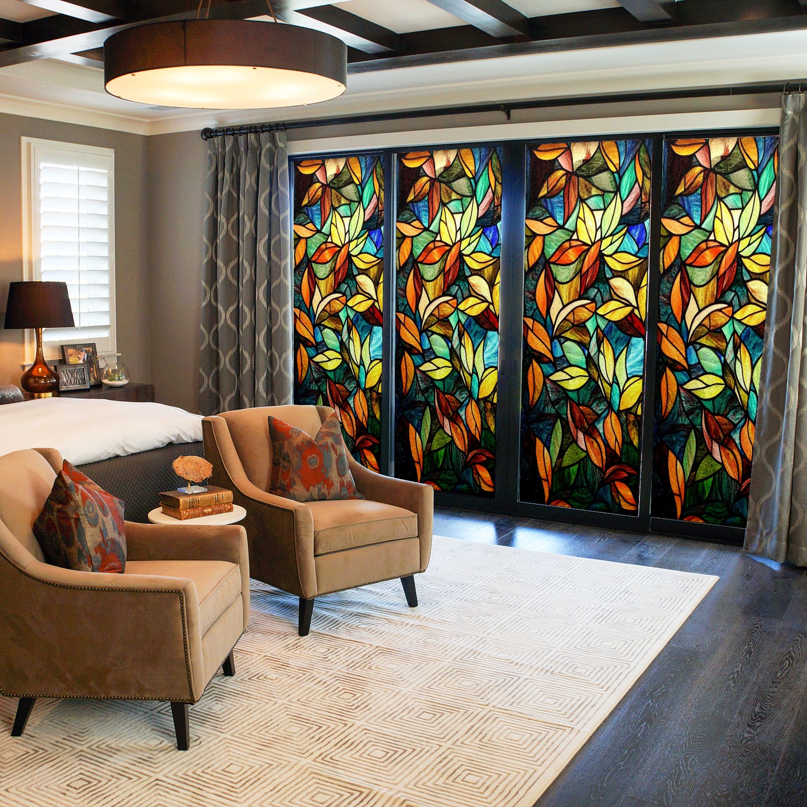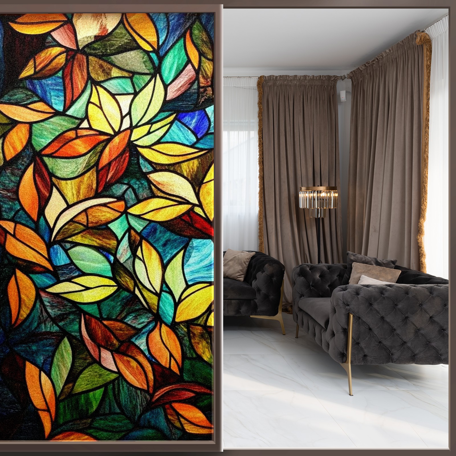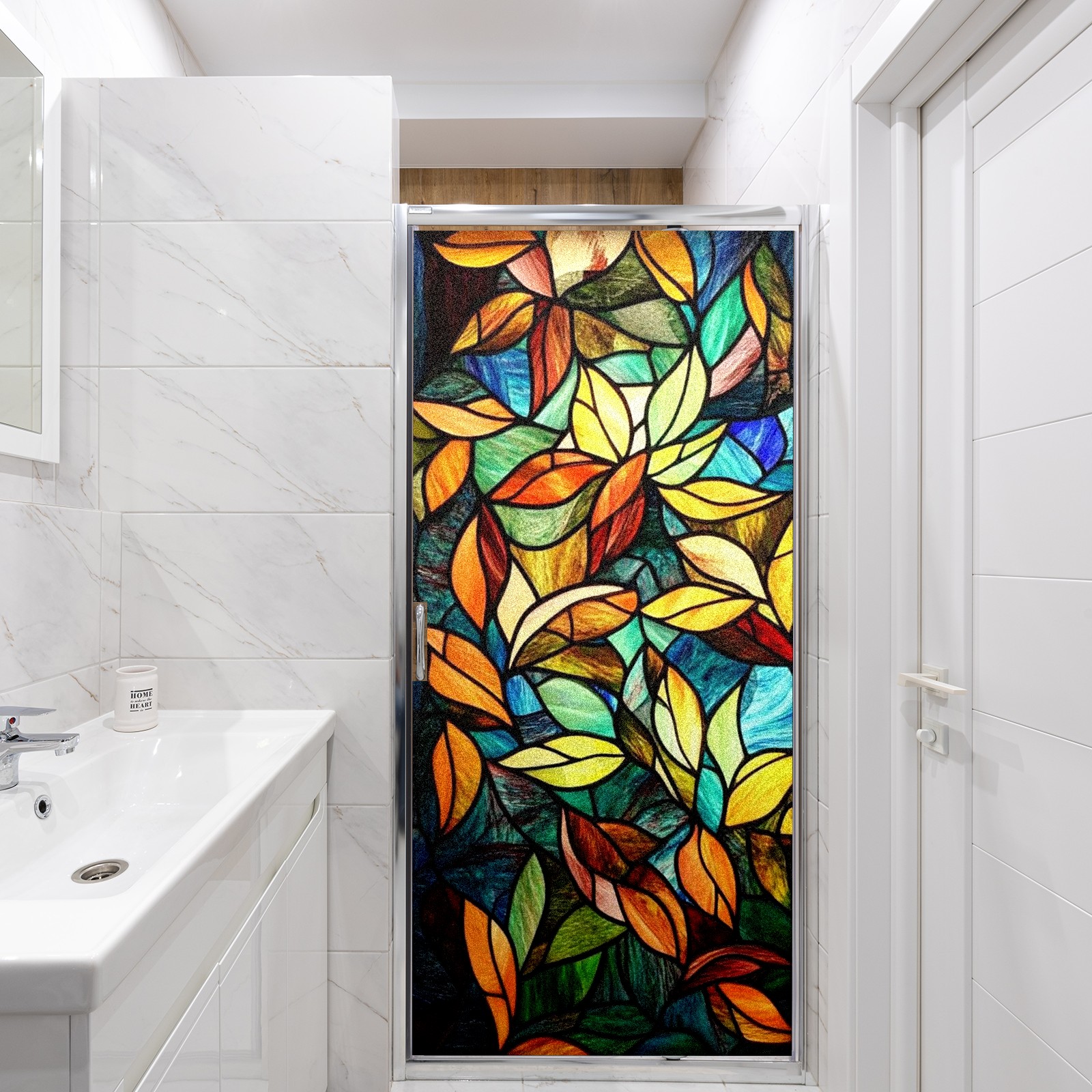 Frosted Glass Window Film Privacy Film Decorative Static Cling Window Film Stained Glass Decals for Bathroom Shower Door Non Adhesive Colorful Tropical Leaf (17.7x23.6in)