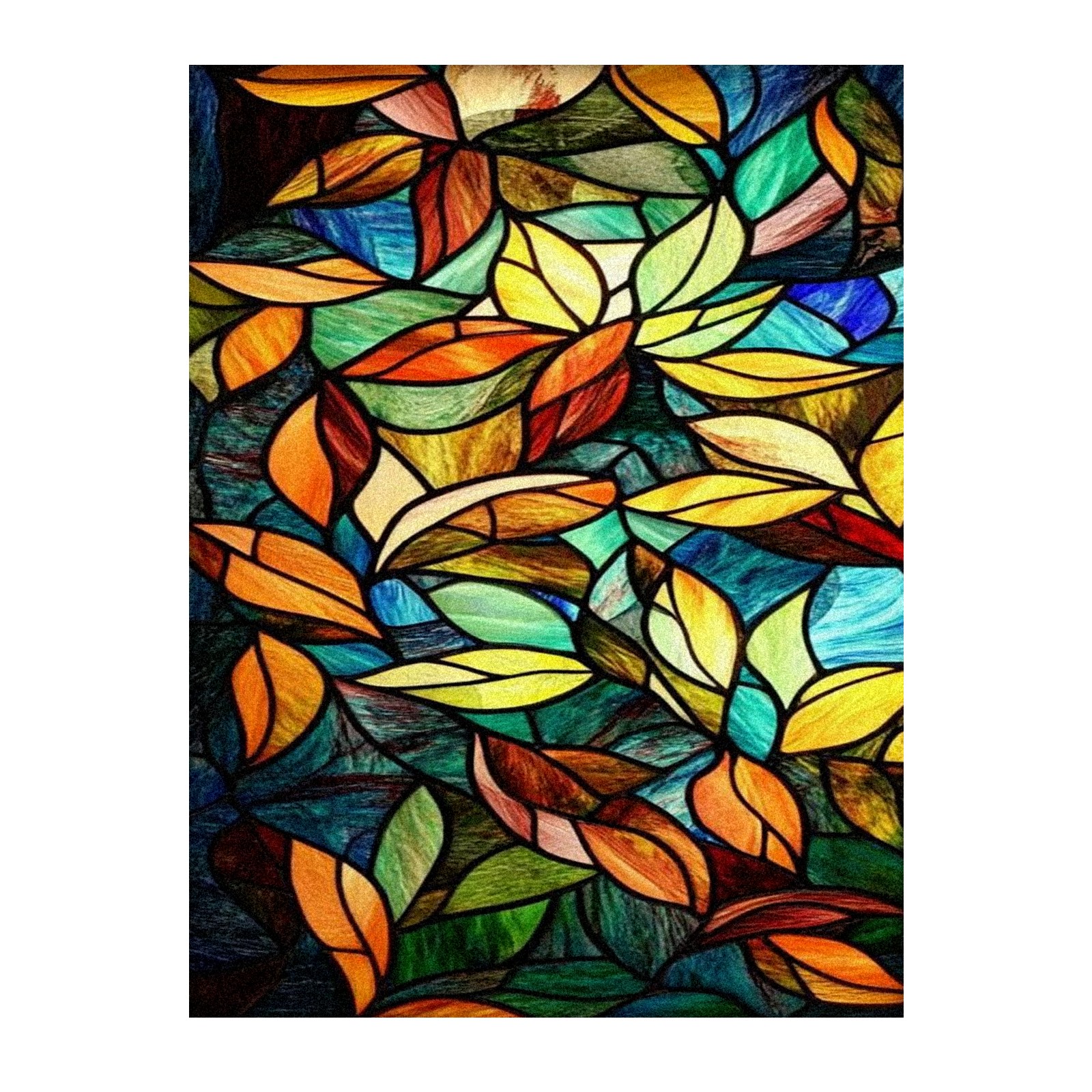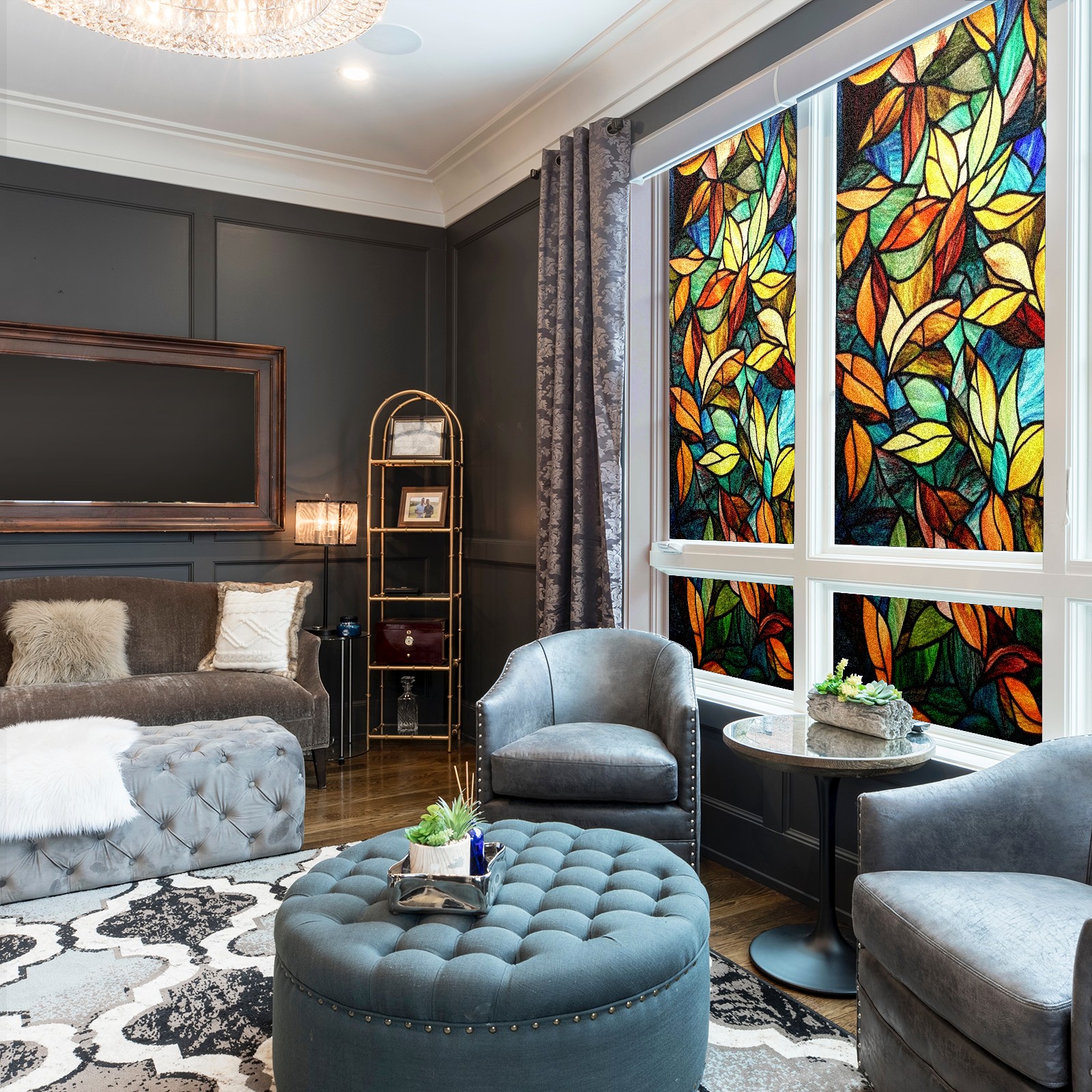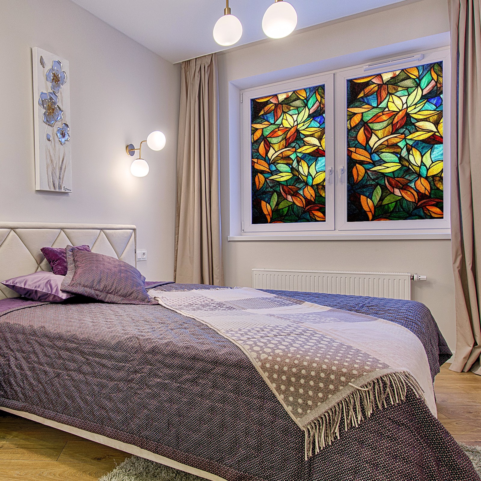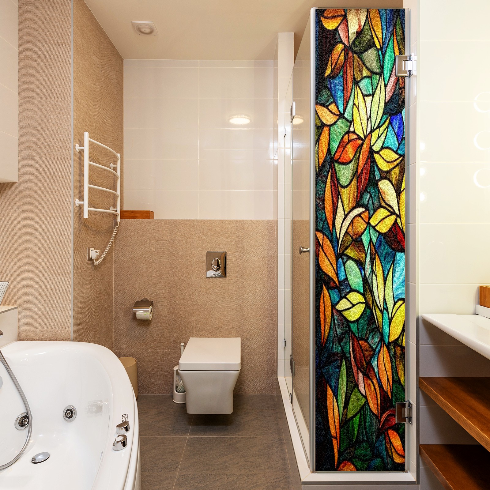 Frosted Glass Window Film Privacy Film Decorative Static Cling Window Film Stained Glass Decals for Bathroom Shower Door Non Adhesive Colorful Tropical Leaf (17.7x23.6in)