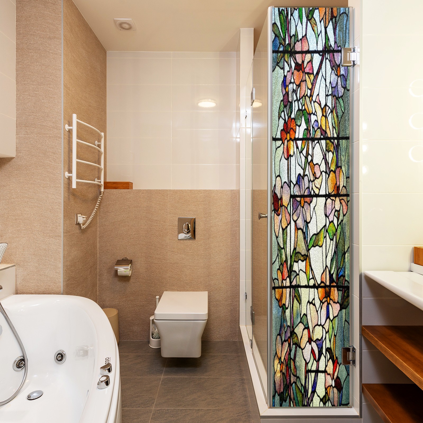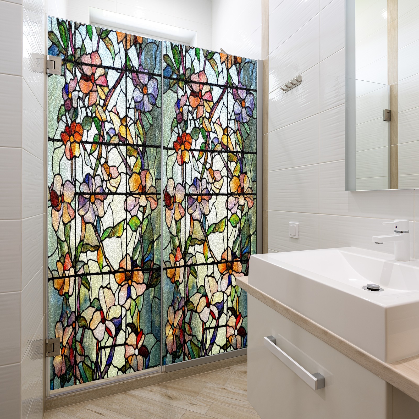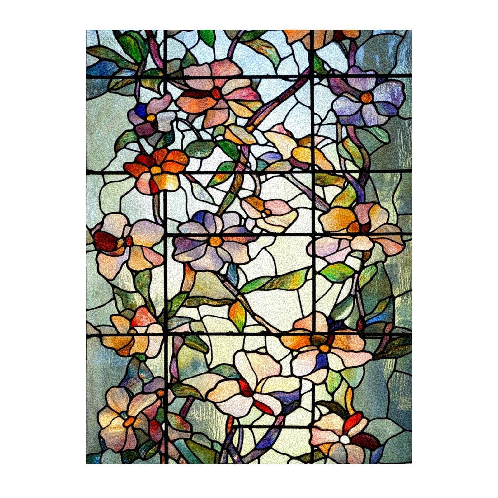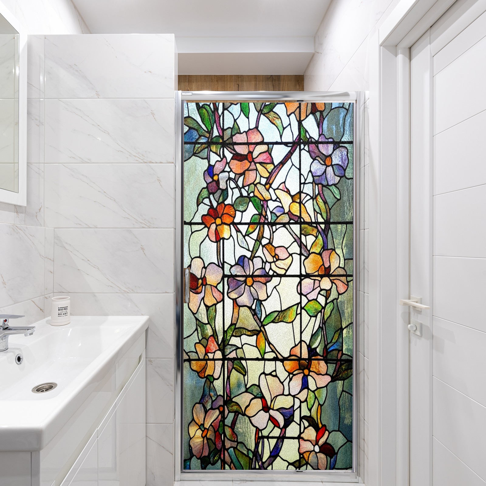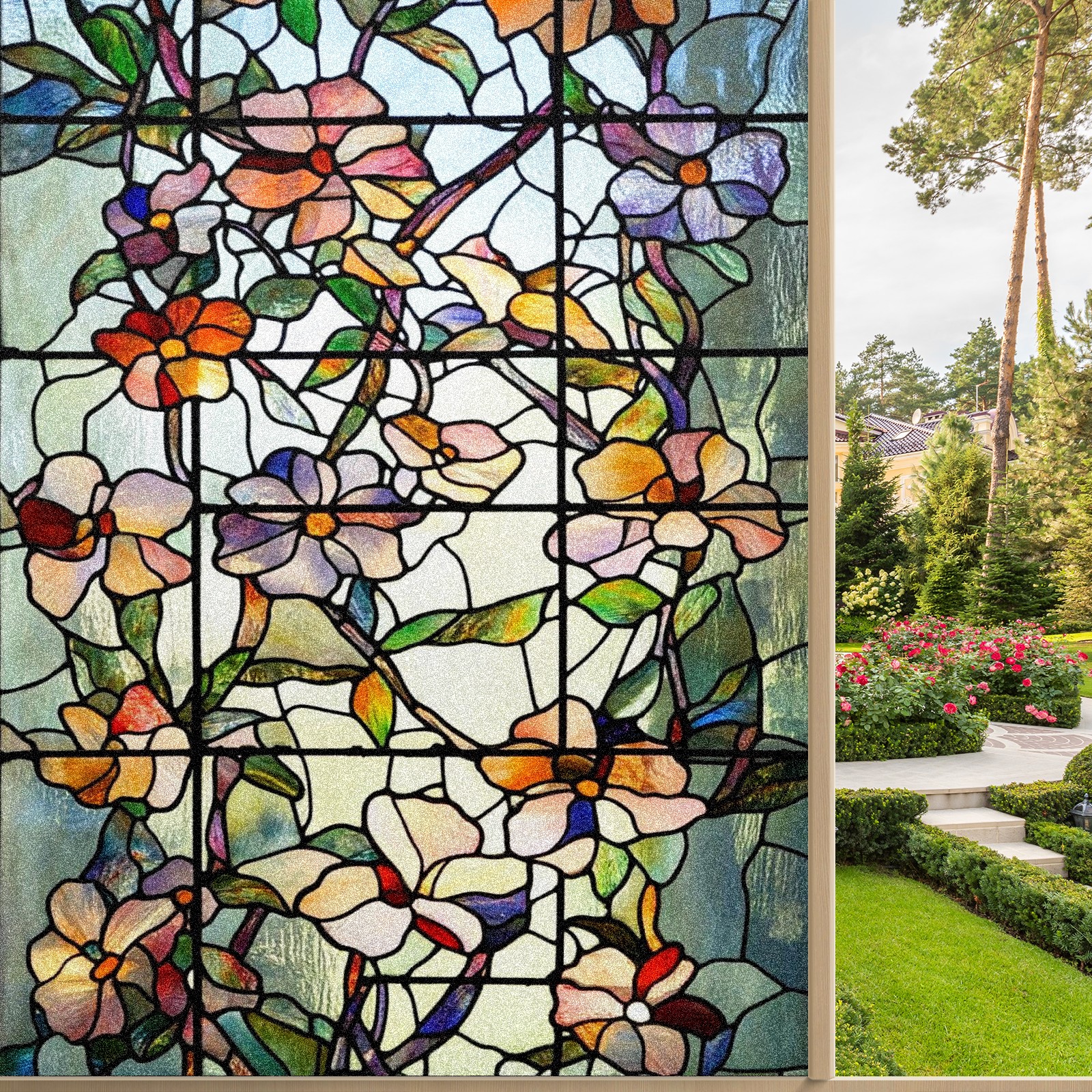 Frosted Glass Window Film Privacy Film Decorative Static Cling Window Film Stained Glass Decals for Bathroom Shower Door Non Adhesive Colorful Floral Flowers (17.7x23.6in)