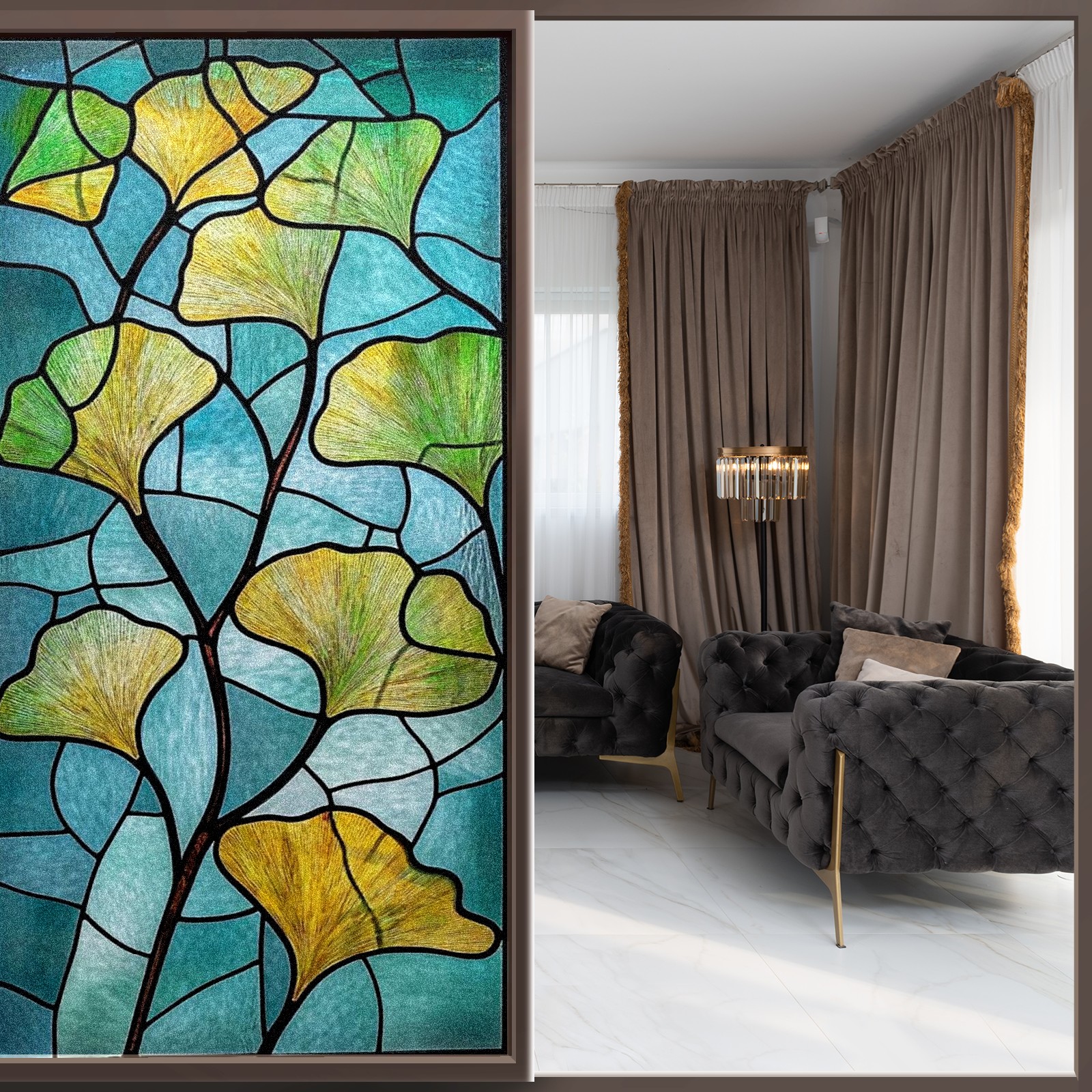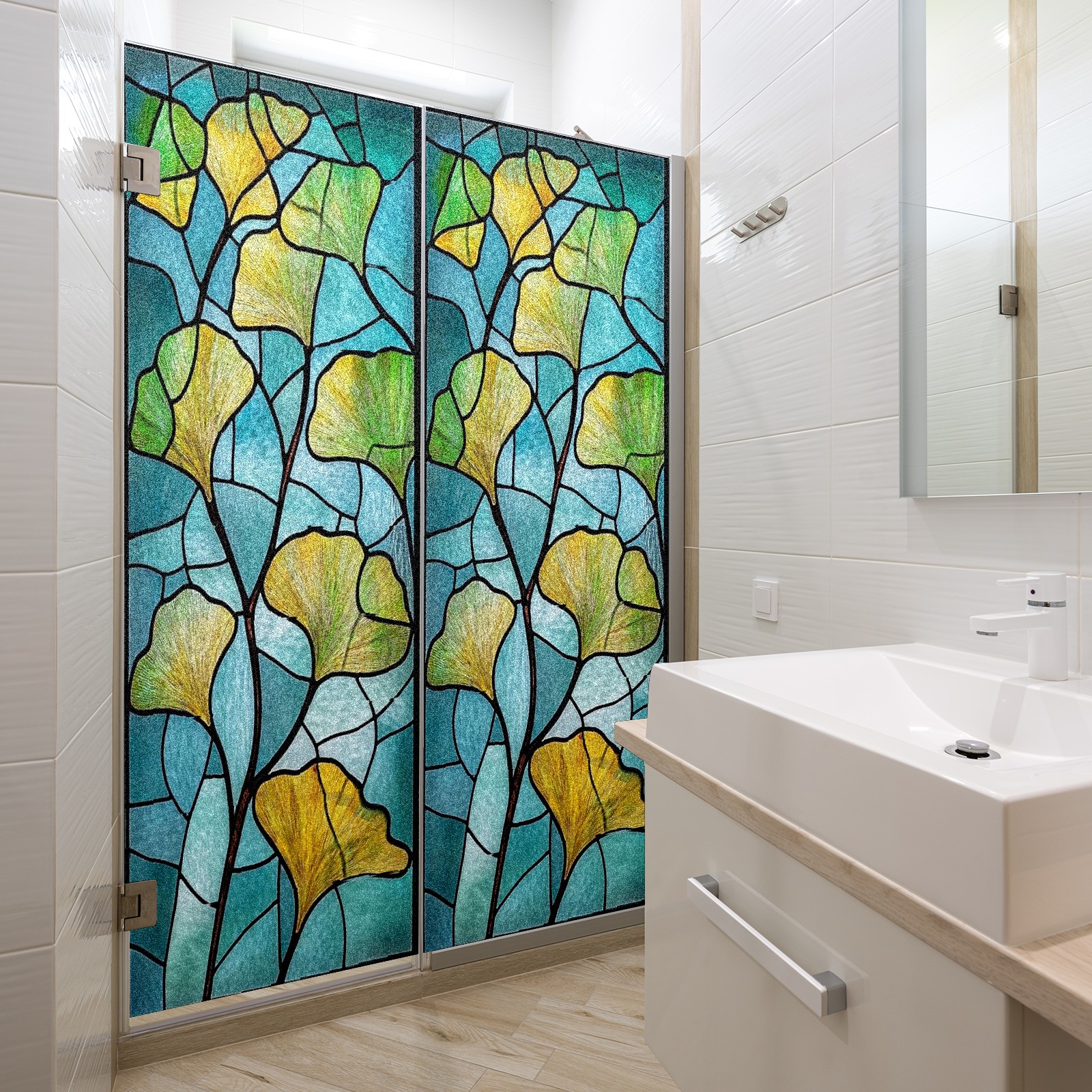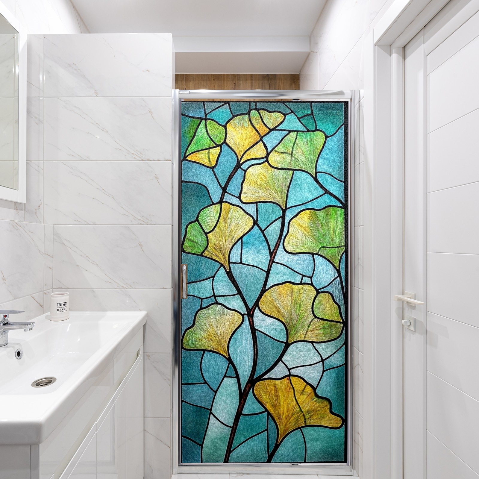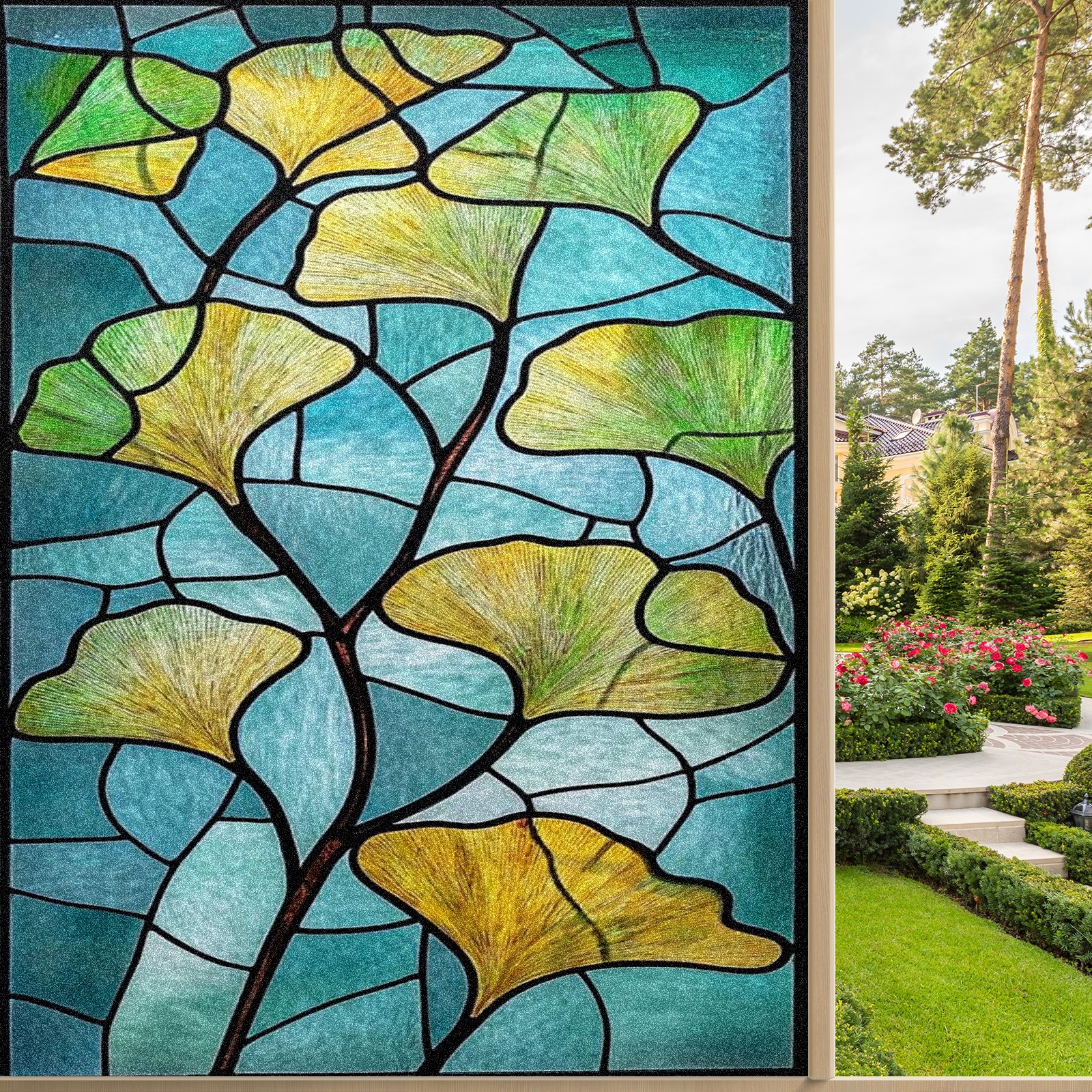Frosted Glass Window Film Privacy Film Decorative Static Cling Window Film Stained Glass Decals for Bathroom Shower Door Non Adhesive Blue Yellow Ginkgo Leaves (17.7x23.6in)
