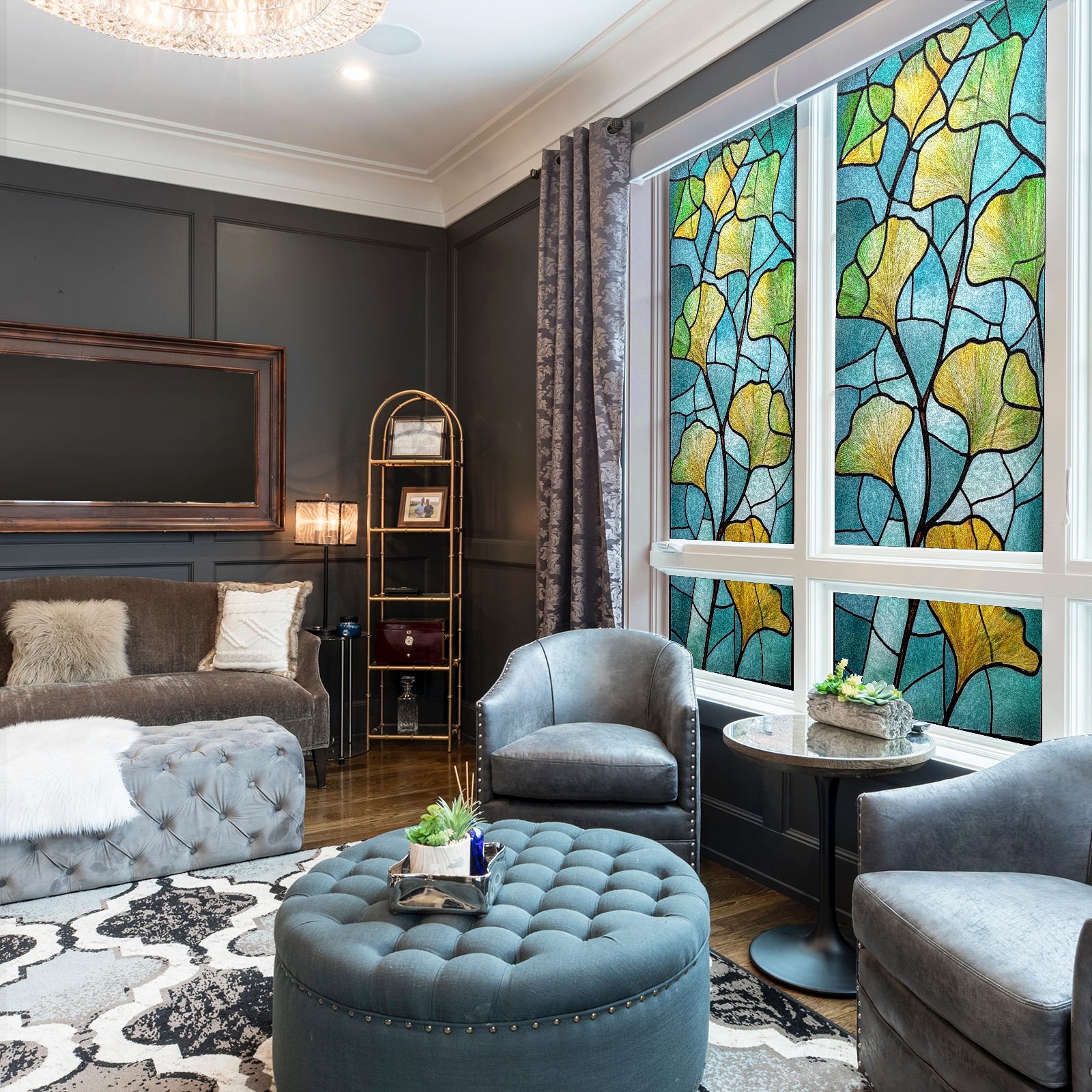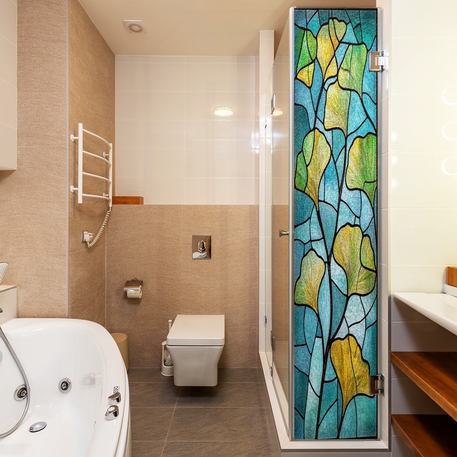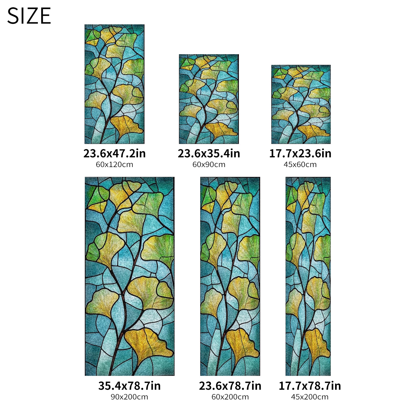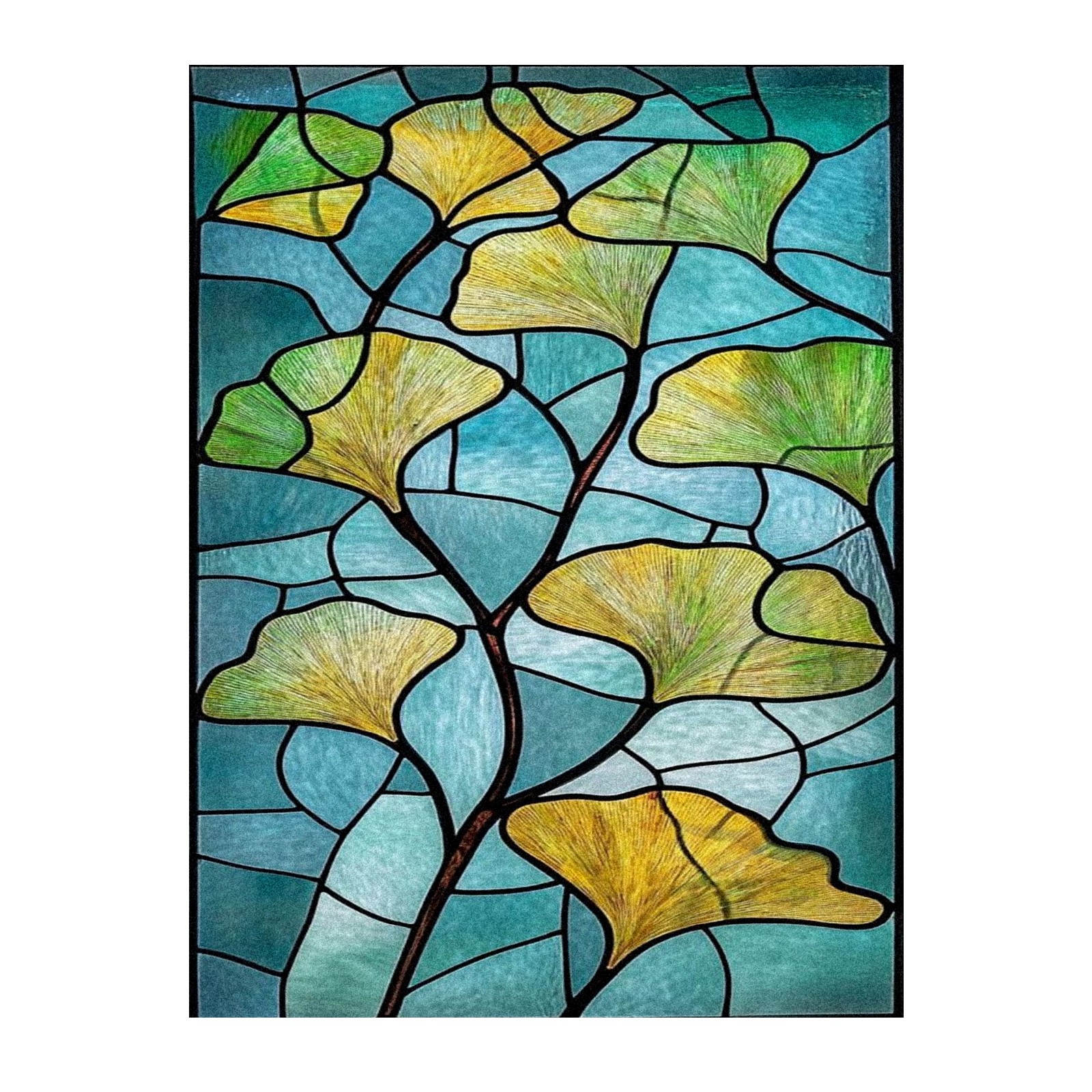 Frosted Glass Window Film Privacy Film Decorative Static Cling Window Film Stained Glass Decals for Bathroom Shower Door Non Adhesive Blue Yellow Ginkgo Leaves (17.7x23.6in)
