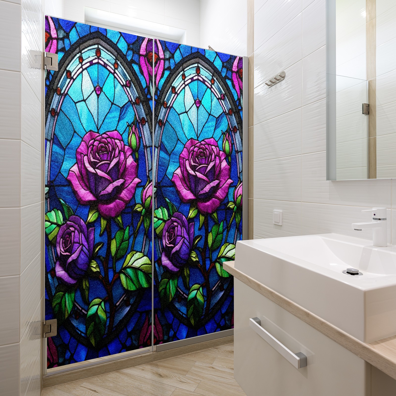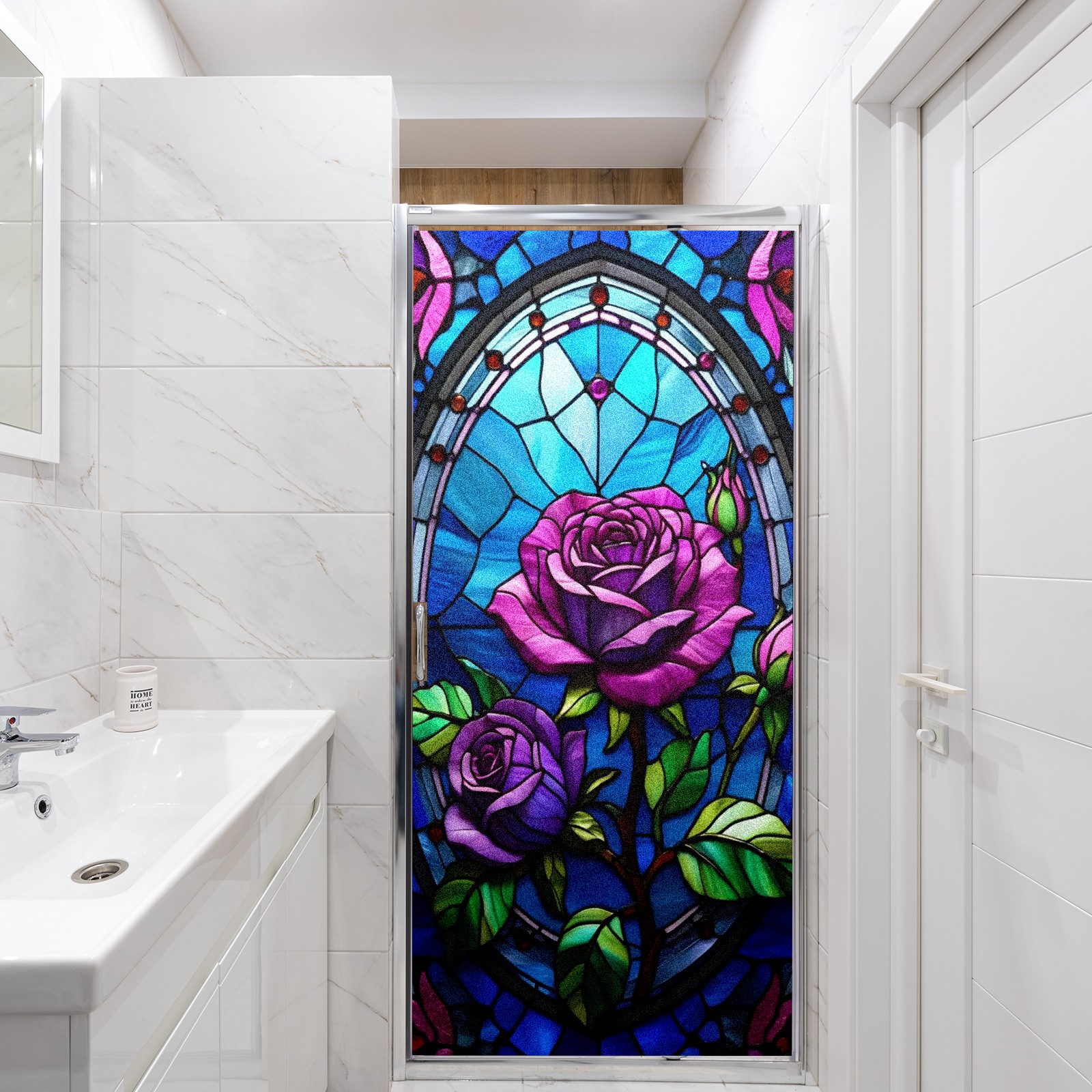 Frosted Glass Window Film Privacy Film Decorative Static Cling Window Film Stained Glass Decals for Bathroom Shower Door Non Adhesive Purple Rose Flowers (17.7x23.6in)