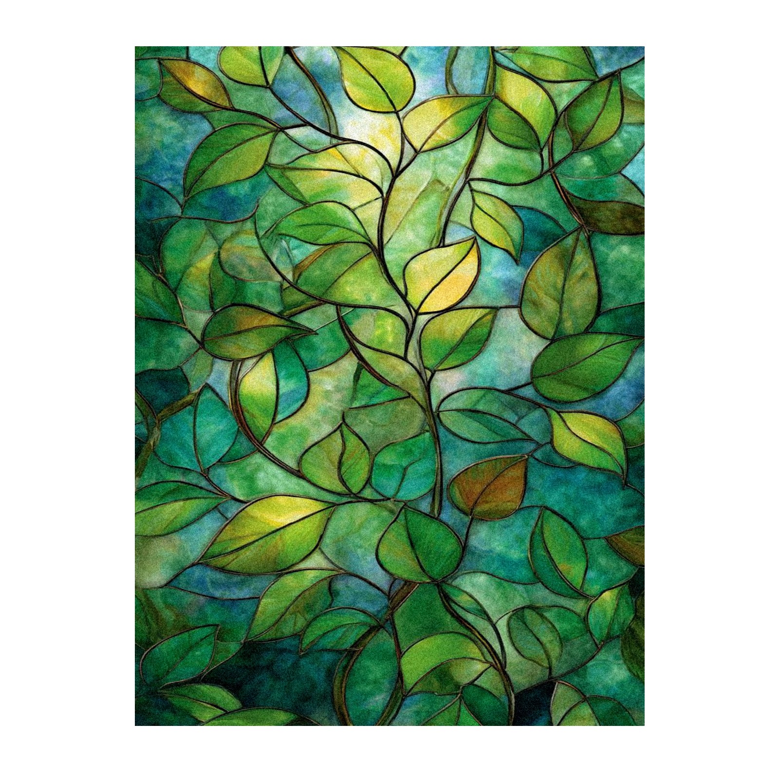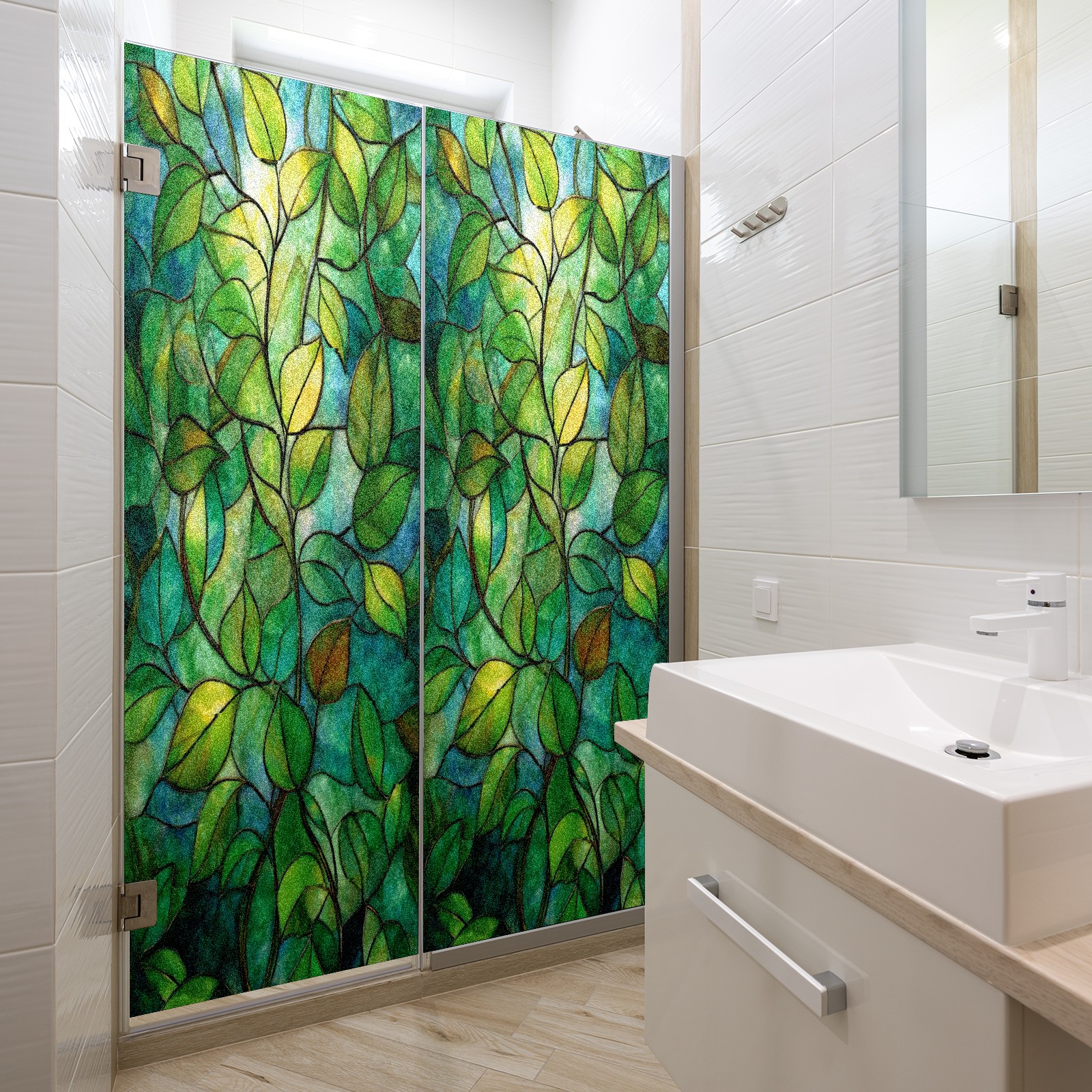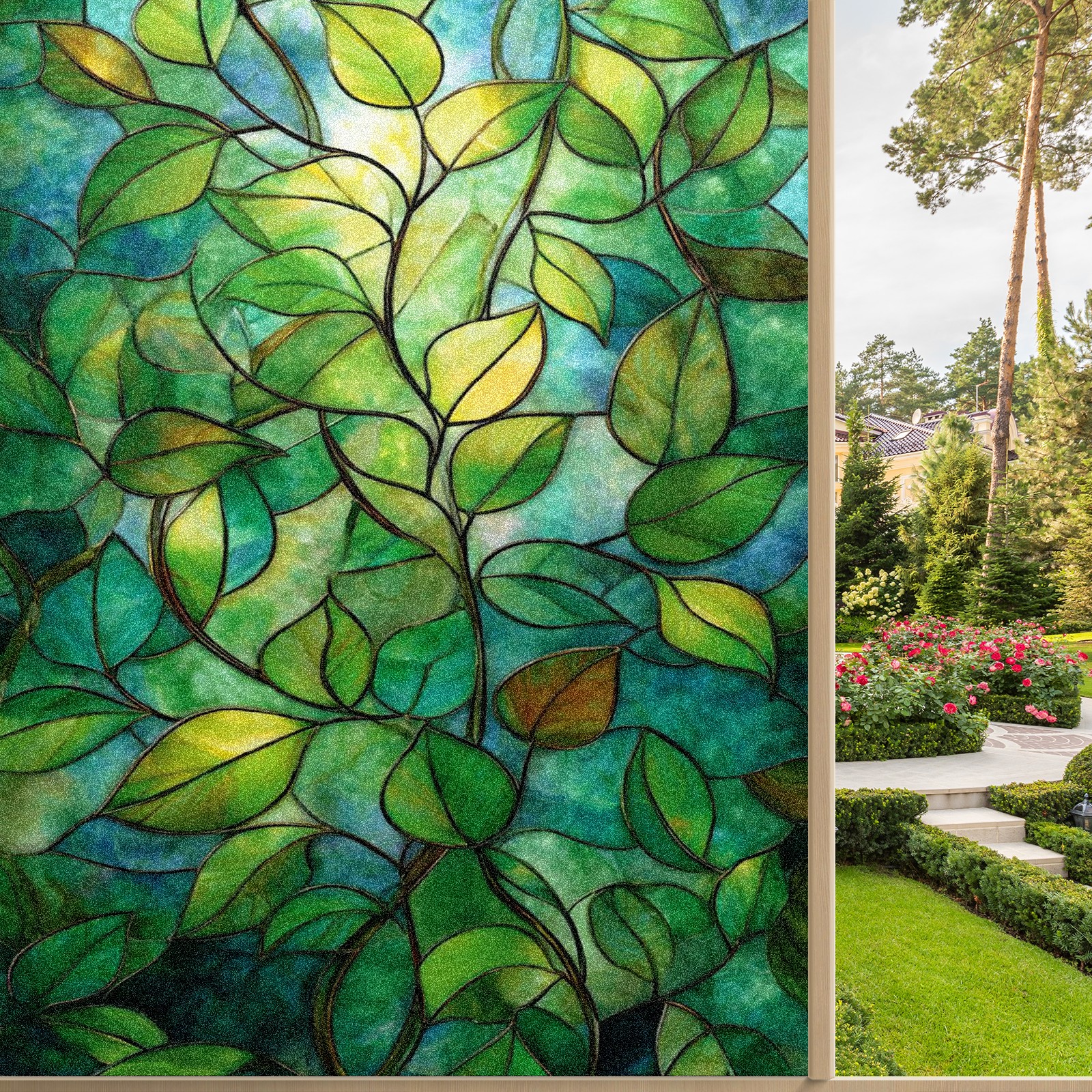 Frosted Glass Window Film Privacy Film Decorative Static Cling Window Film Stained Glass Decals for Bathroom Shower Door Non Adhesive Green Leaf (17.7x23.6in)