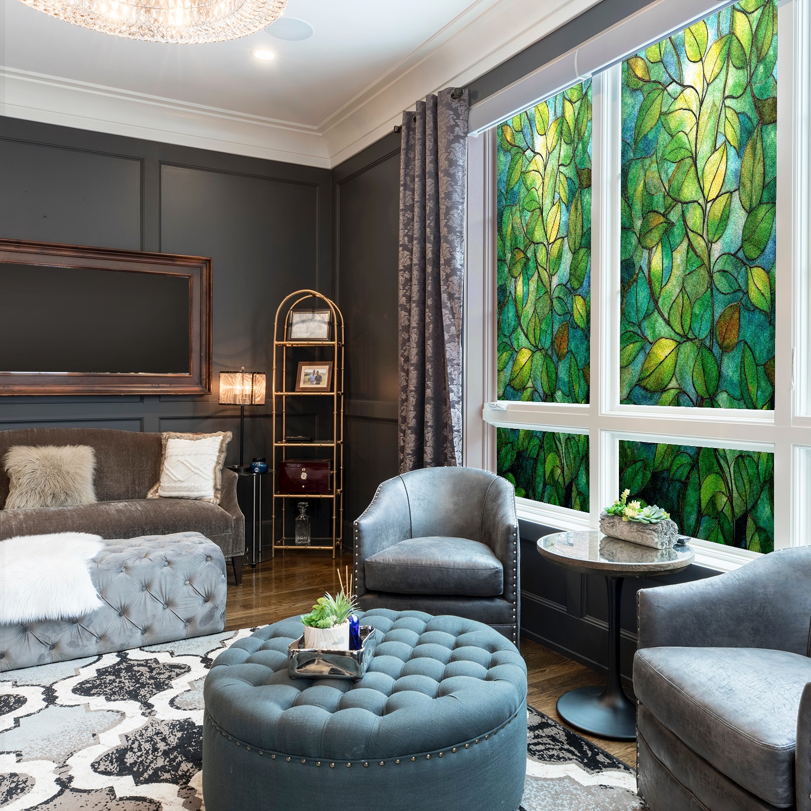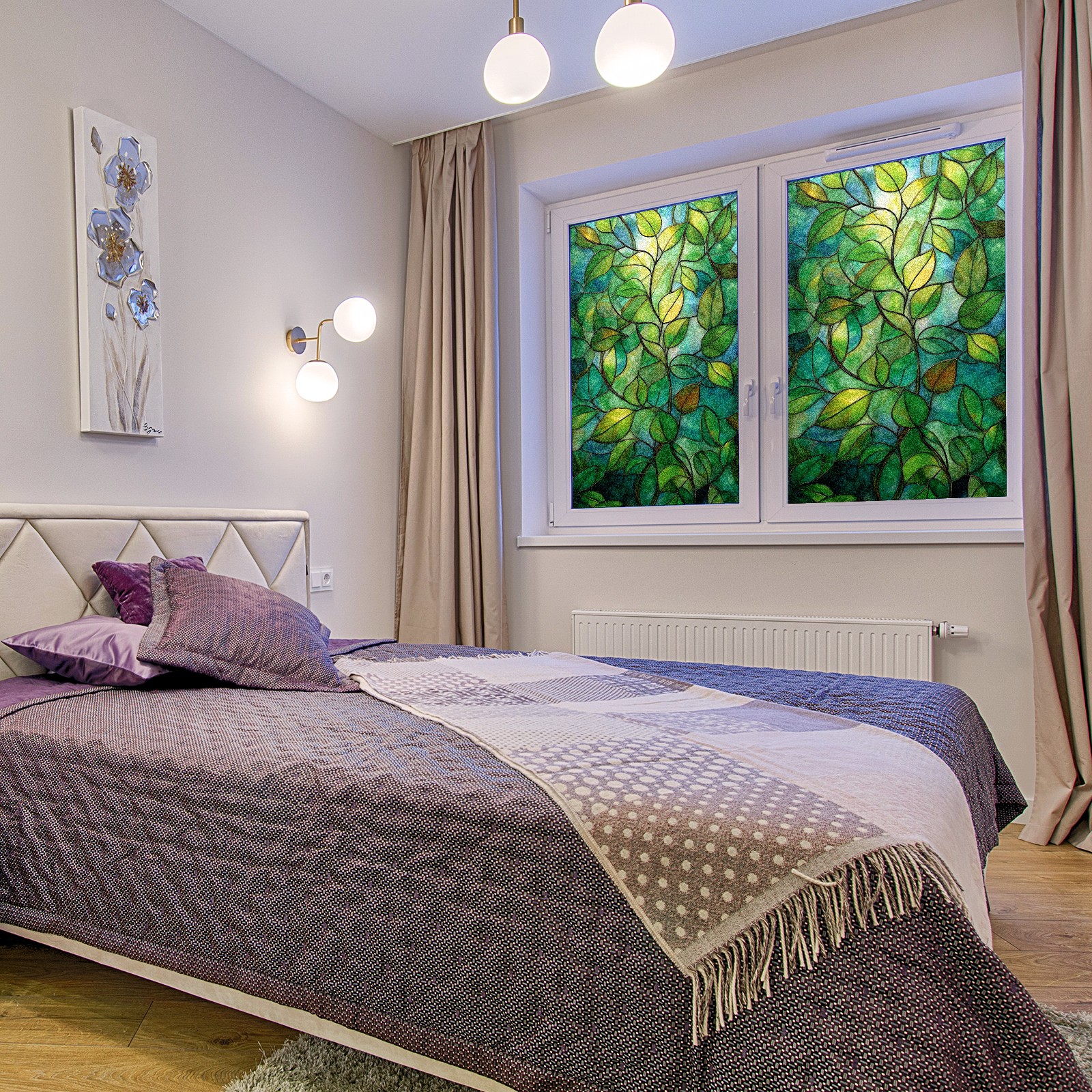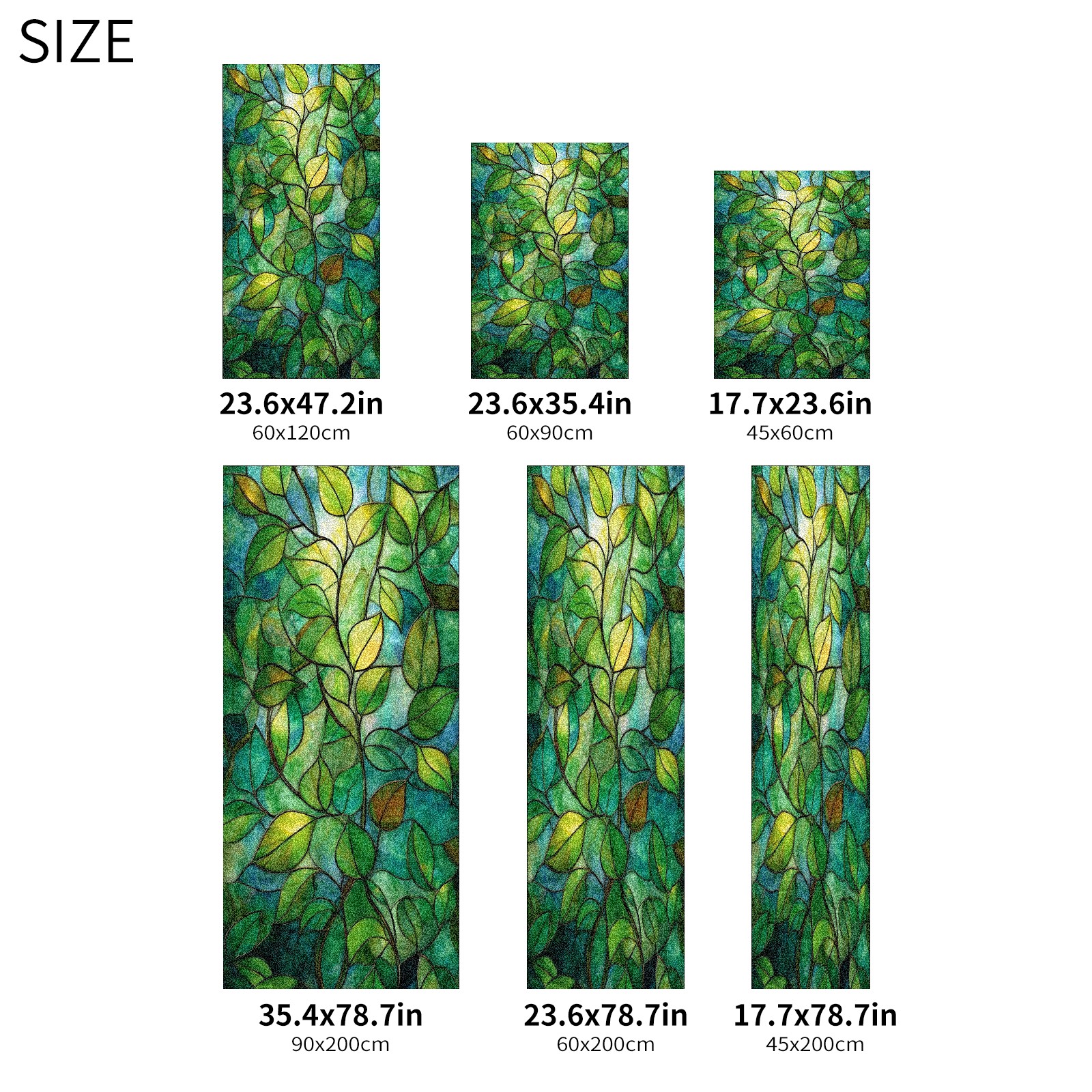 Frosted Glass Window Film Privacy Film Decorative Static Cling Window Film Stained Glass Decals for Bathroom Shower Door Non Adhesive Green Leaf (17.7x23.6in)