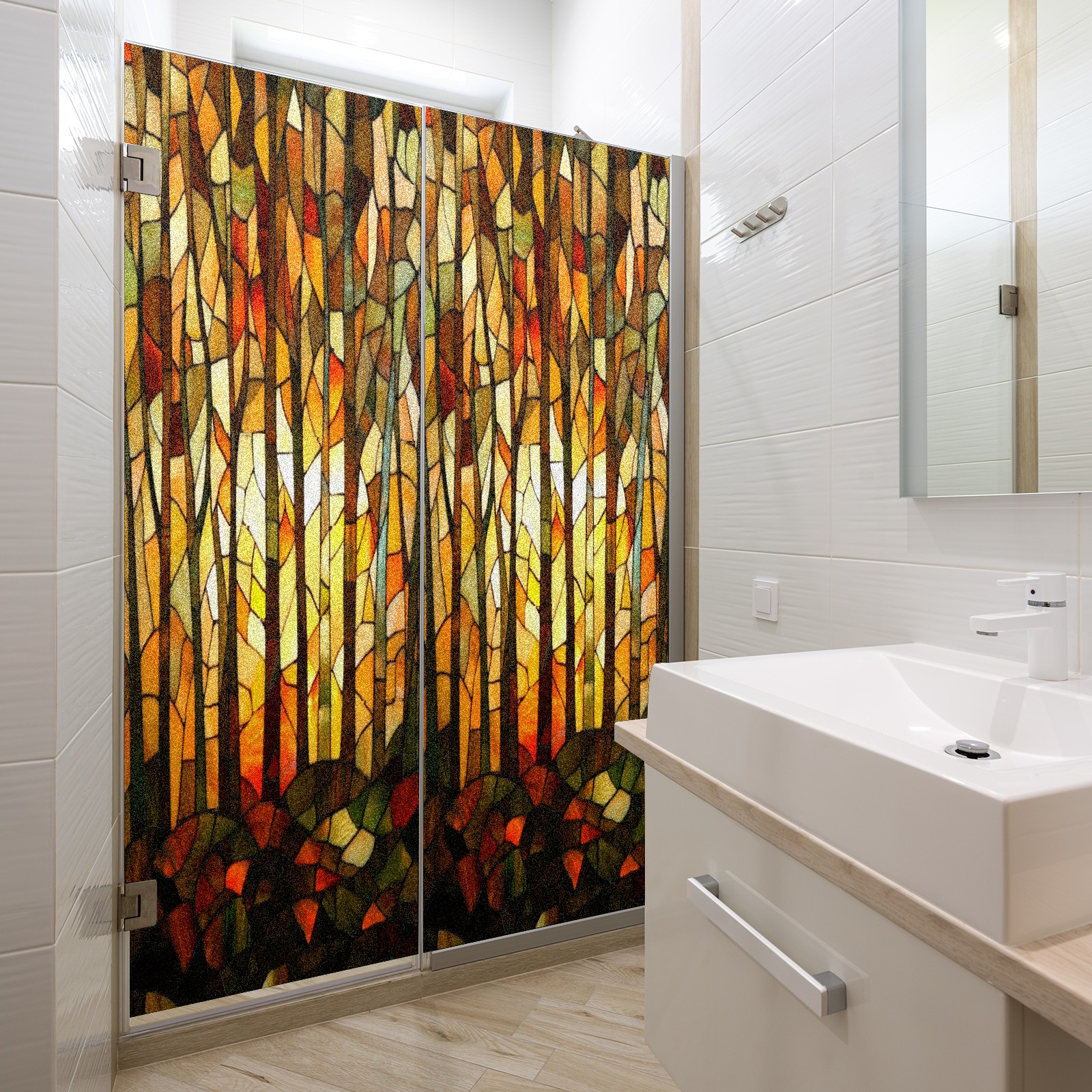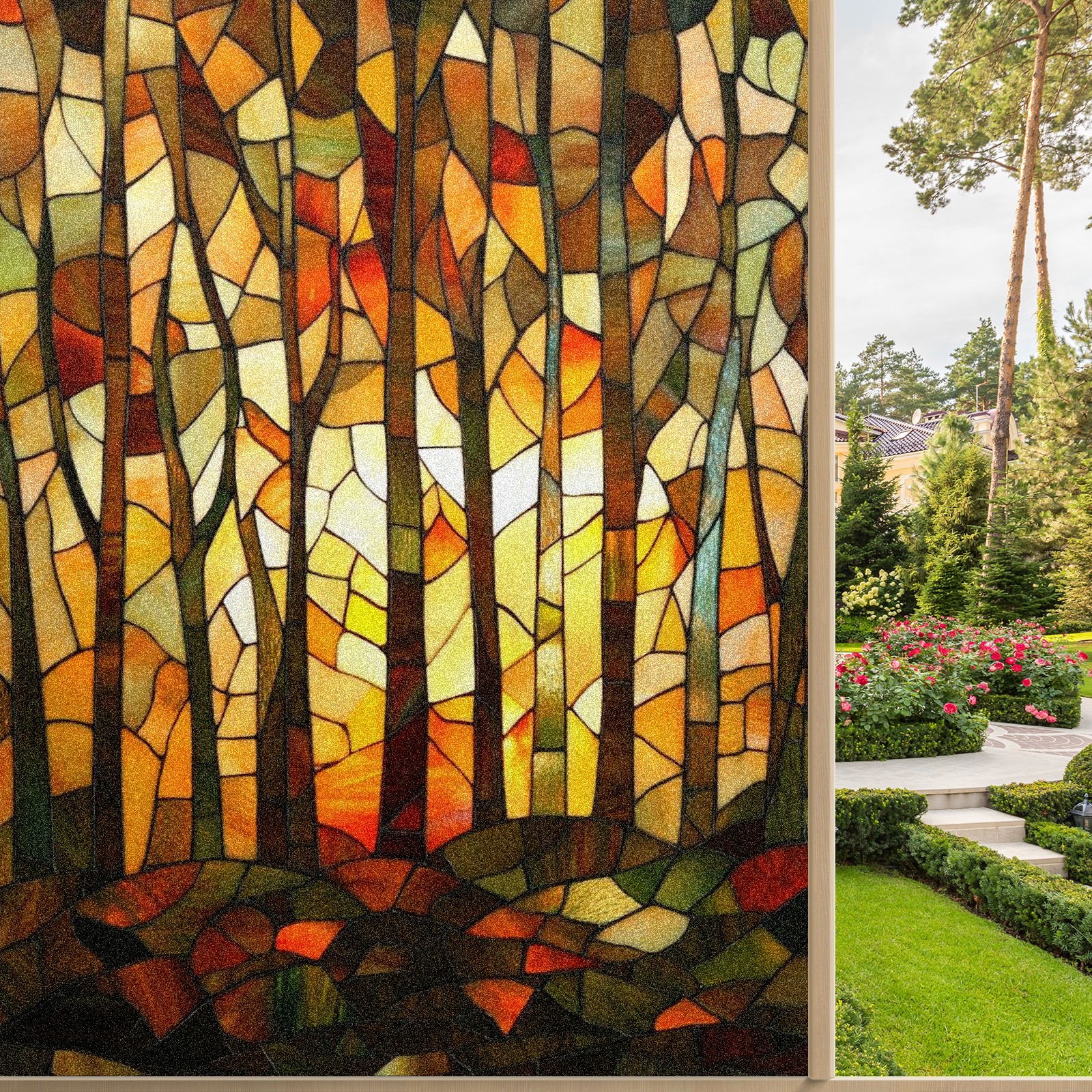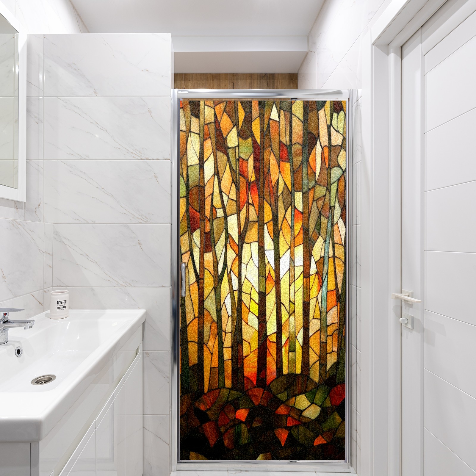 Frosted Glass Window Film Privacy Film Decorative Static Cling Window Film Stained Glass Decals for Bathroom Shower Door Non Adhesive Sunset Forest (17.7x23.6in)