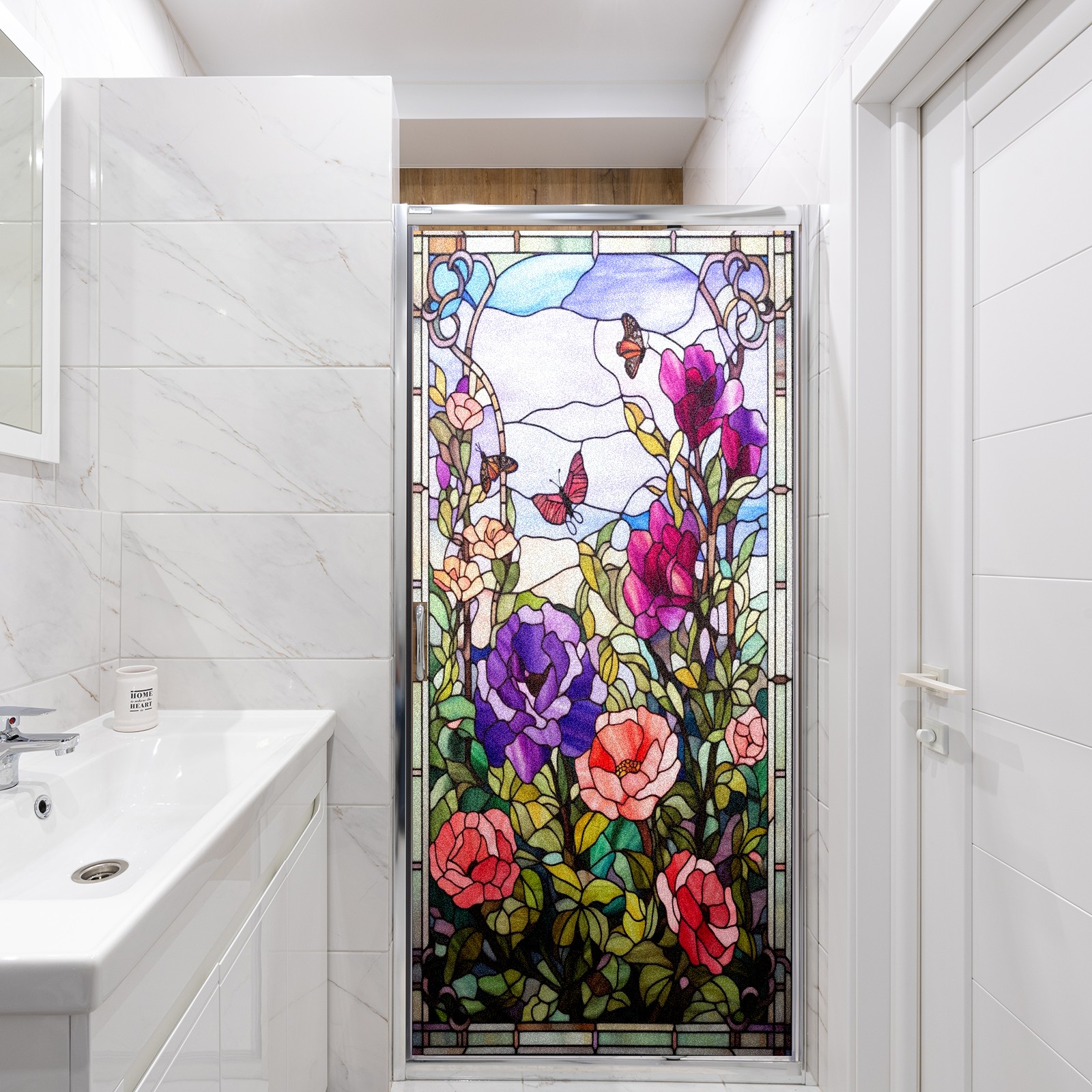 Frosted Glass Window Film Privacy Film Decorative Static Cling Window Film Stained Glass Decals for Bathroom Shower Door Non Adhesive Purple Flowers Butterfly (17.7x23.6in)
