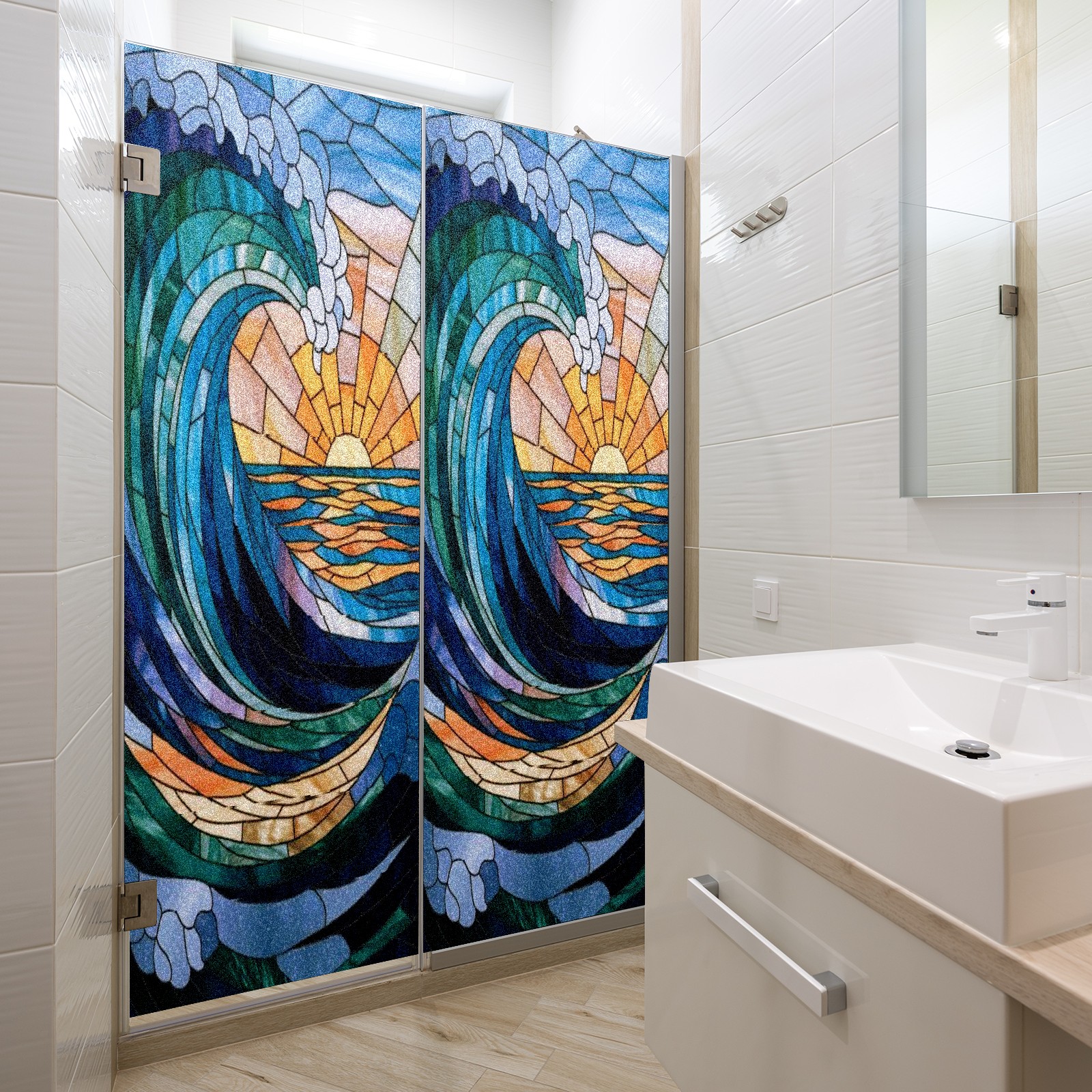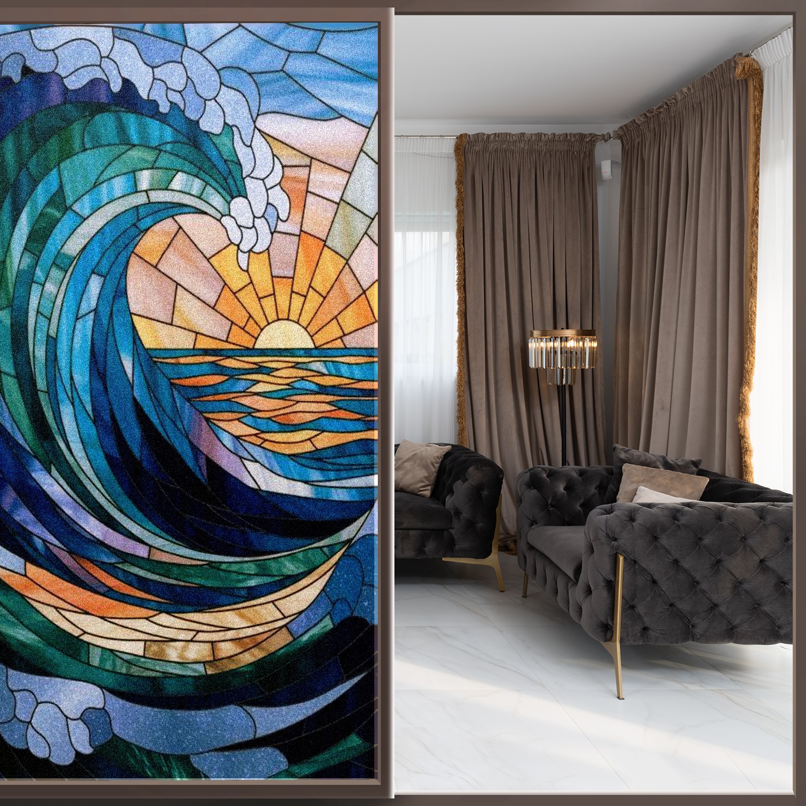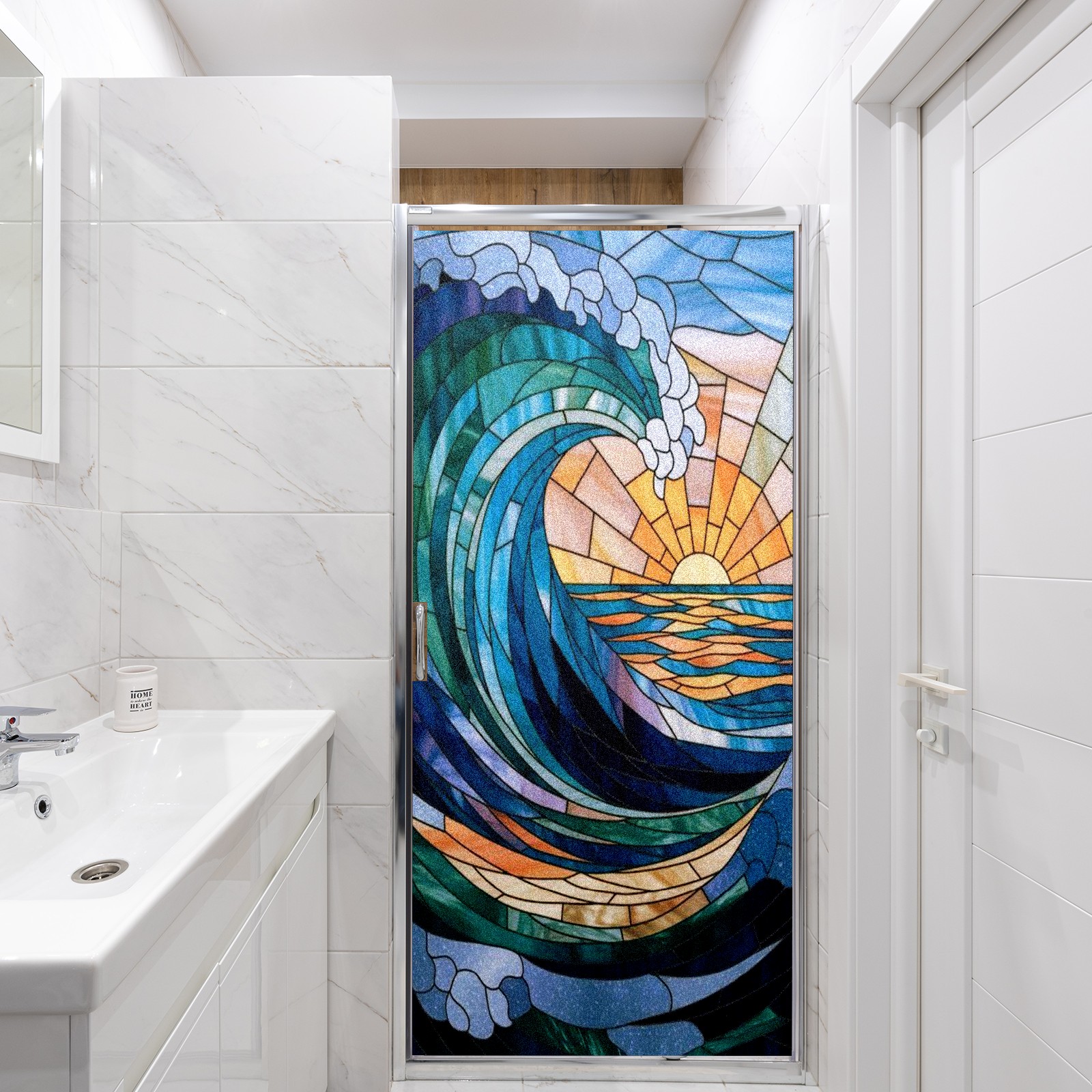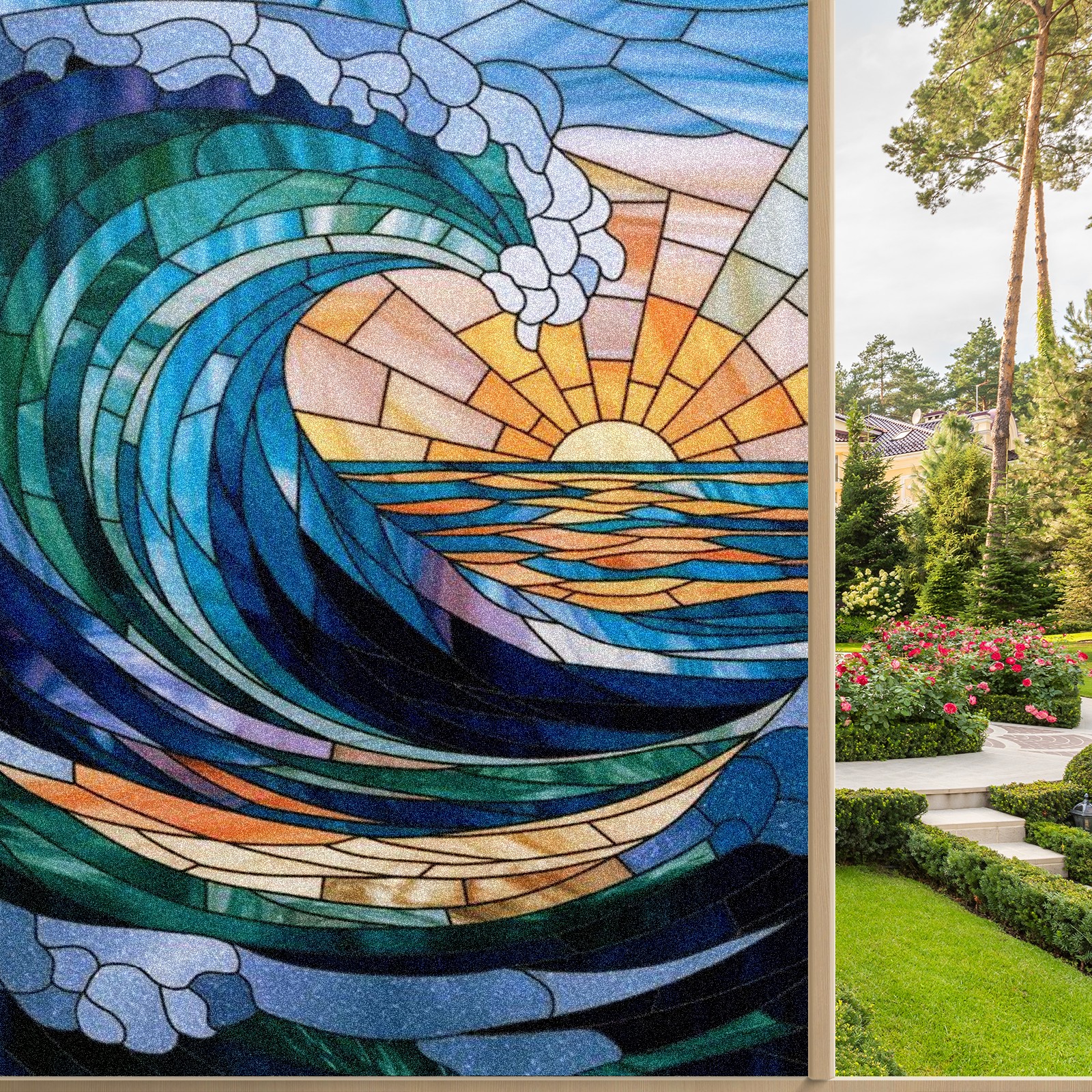 Frosted Glass Window Film Privacy Film Decorative Static Cling Window Film Stained Glass Decals for Bathroom Shower Door Non Adhesive Blue Waves Sunset (17.7x23.6in)