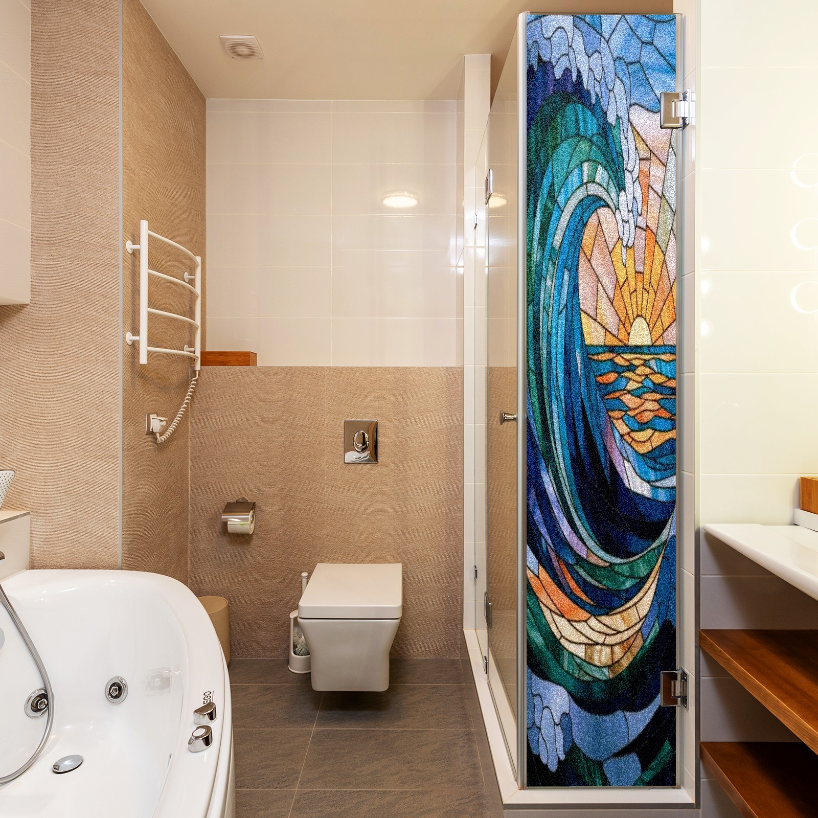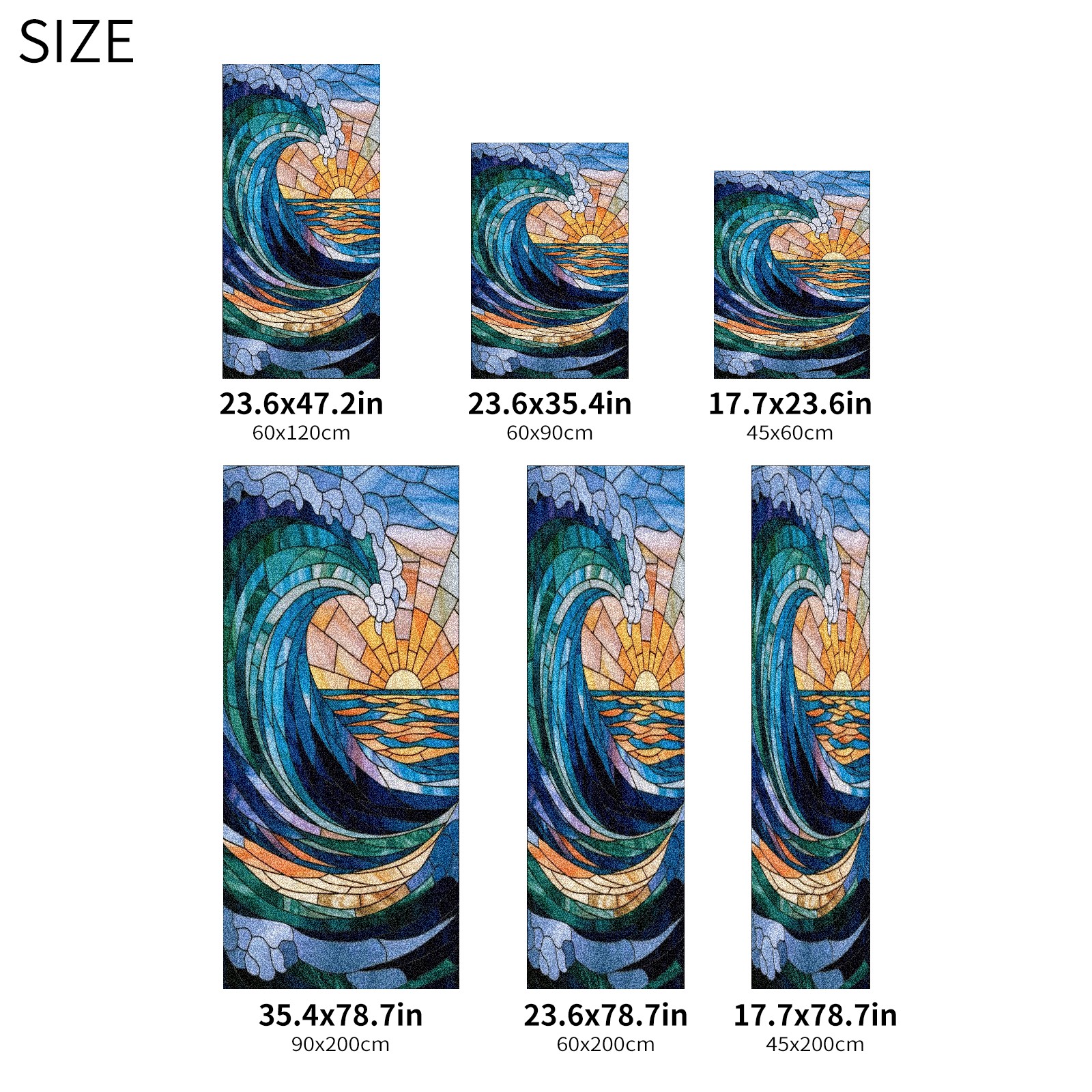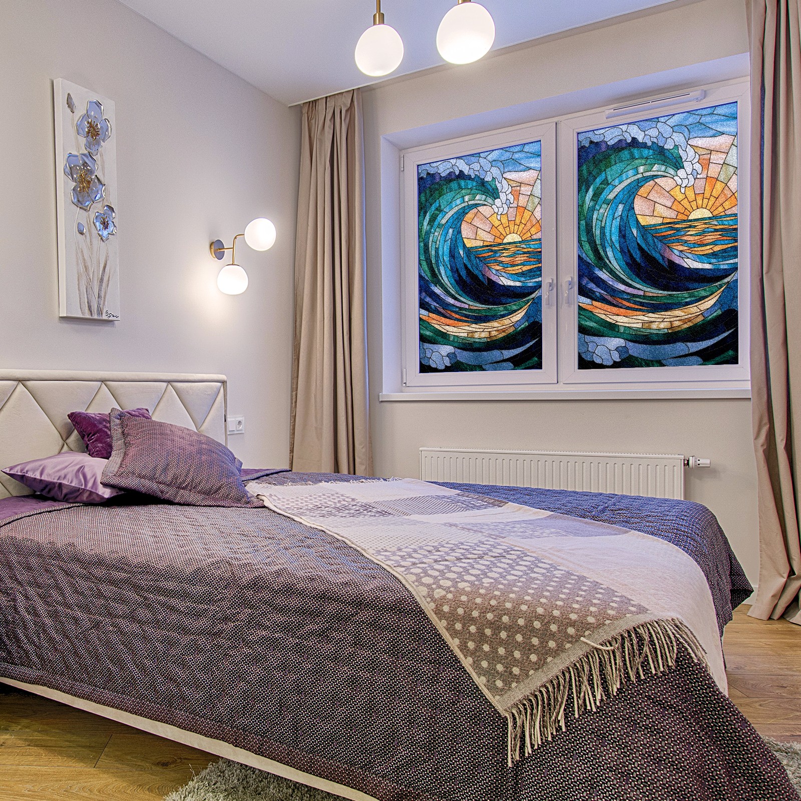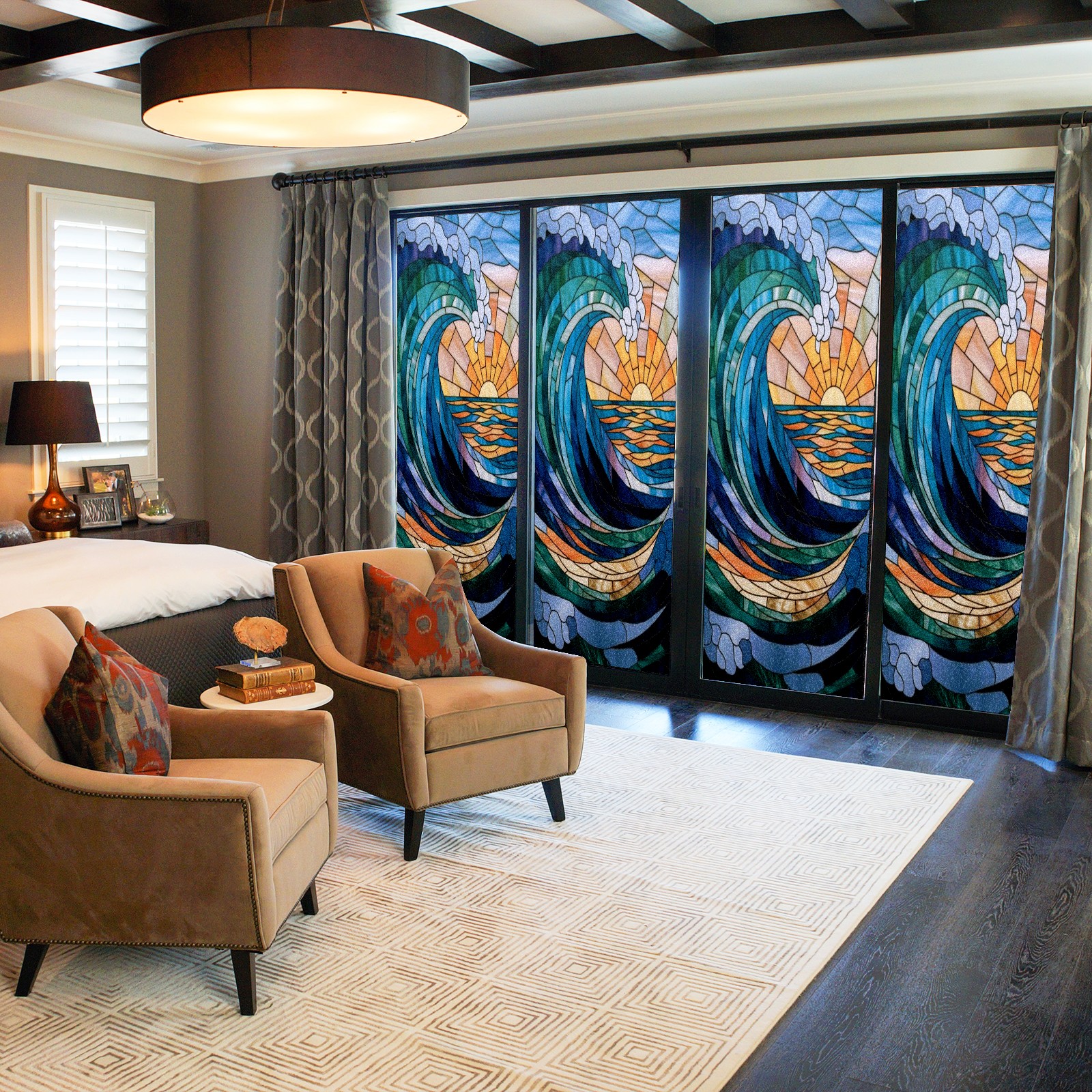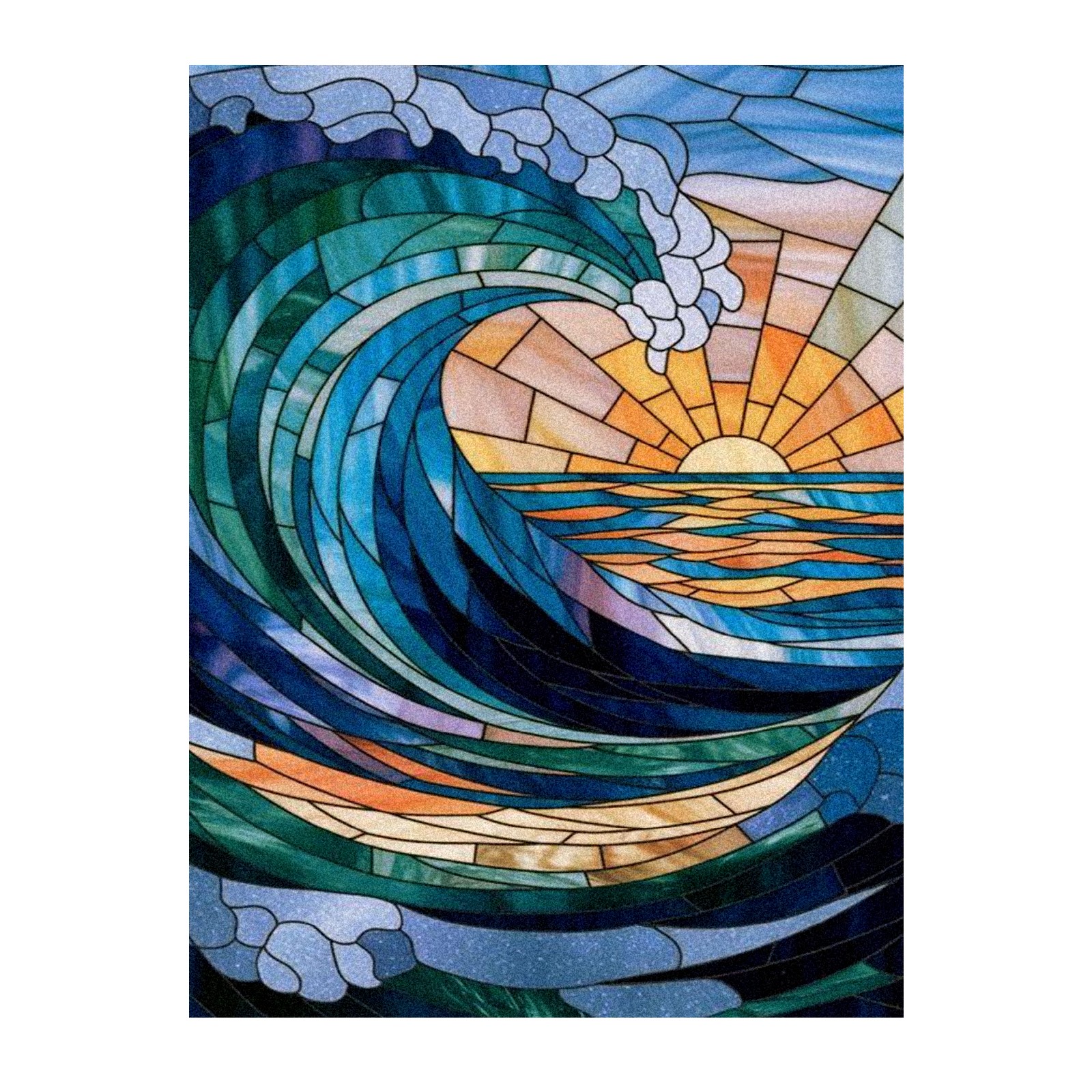 Frosted Glass Window Film Privacy Film Decorative Static Cling Window Film Stained Glass Decals for Bathroom Shower Door Non Adhesive Blue Waves Sunset (17.7x23.6in)