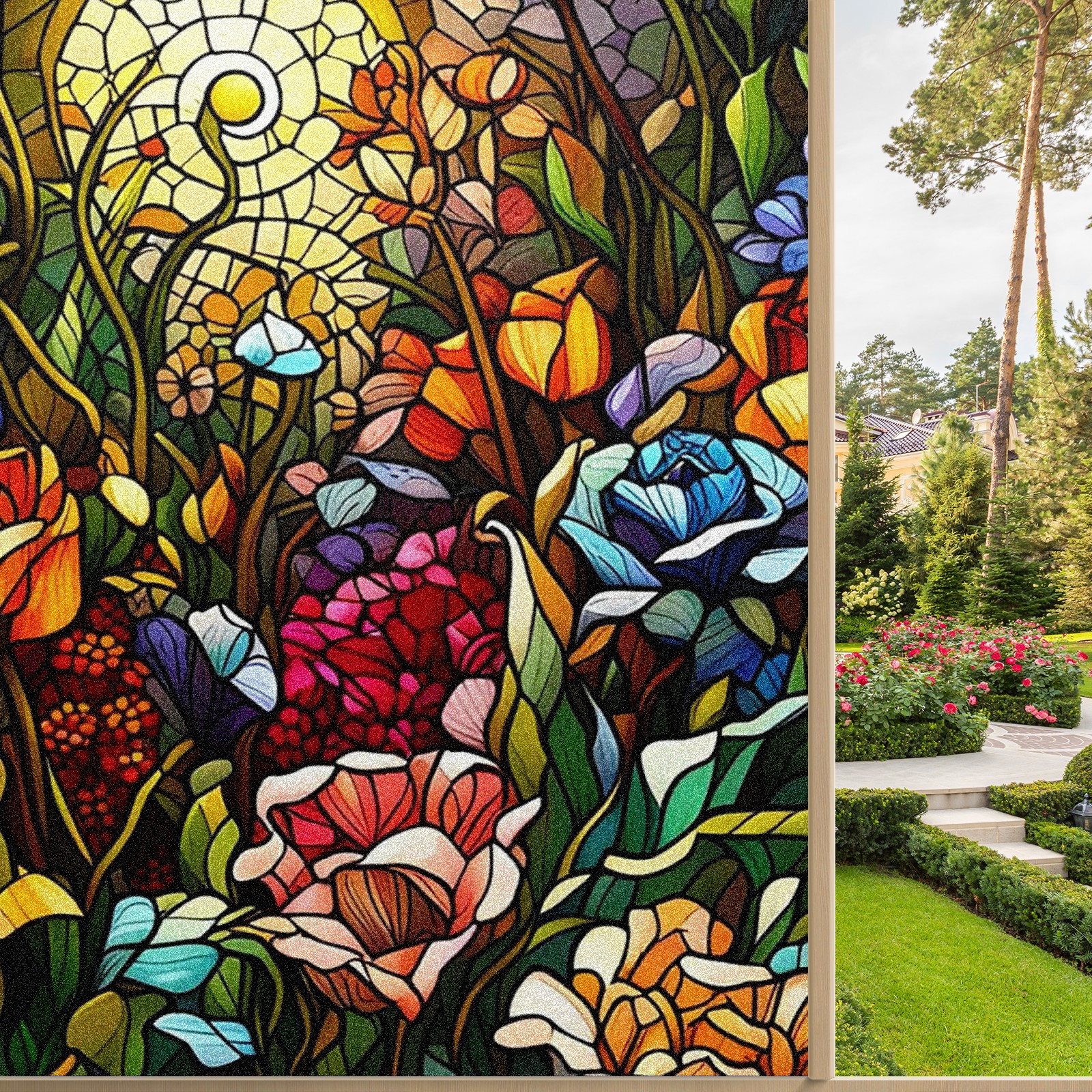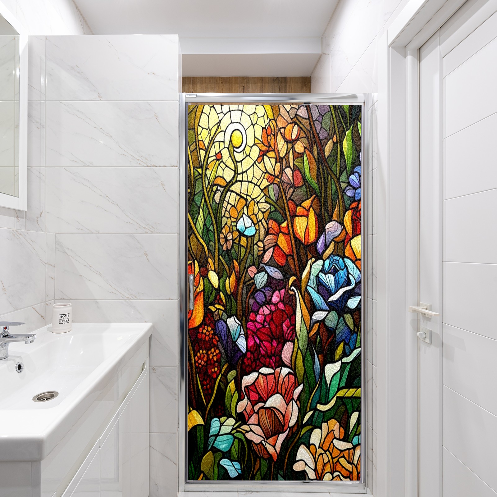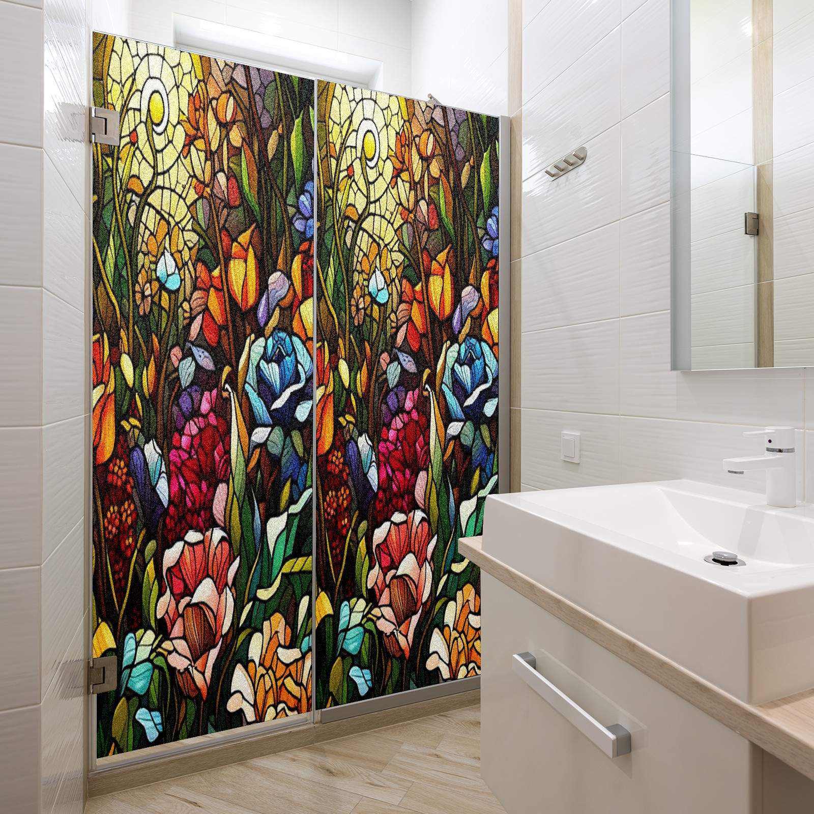 Frosted Glass Window Film Privacy Film Decorative Static Cling Window Film Stained Glass Decals for Bathroom Shower Door Non Adhesive Sun Colorful Flowers (17.7x23.6in)