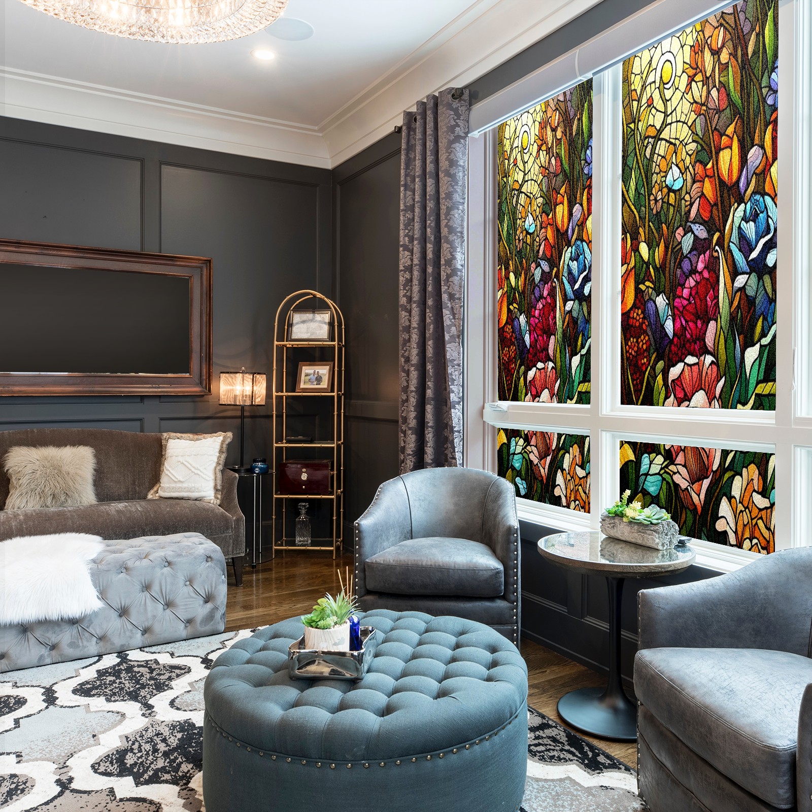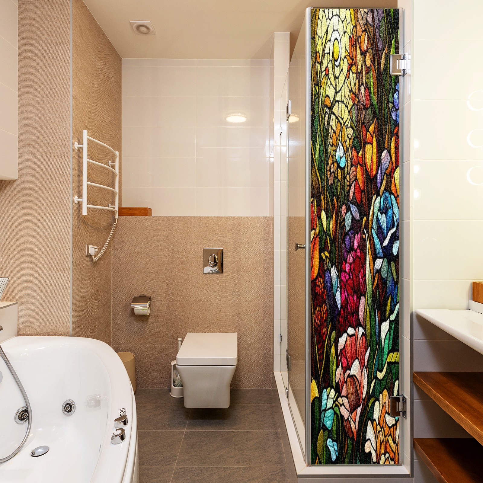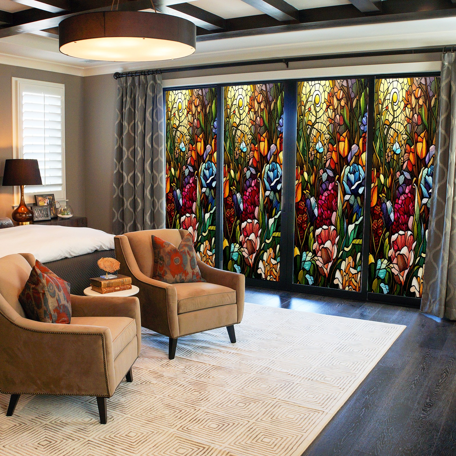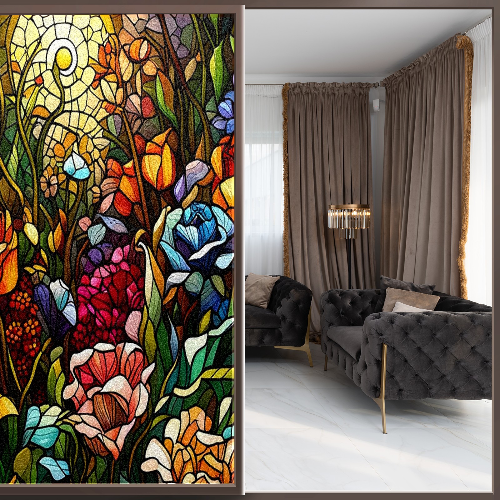 Frosted Glass Window Film Privacy Film Decorative Static Cling Window Film Stained Glass Decals for Bathroom Shower Door Non Adhesive Sun Colorful Flowers (17.7x23.6in)