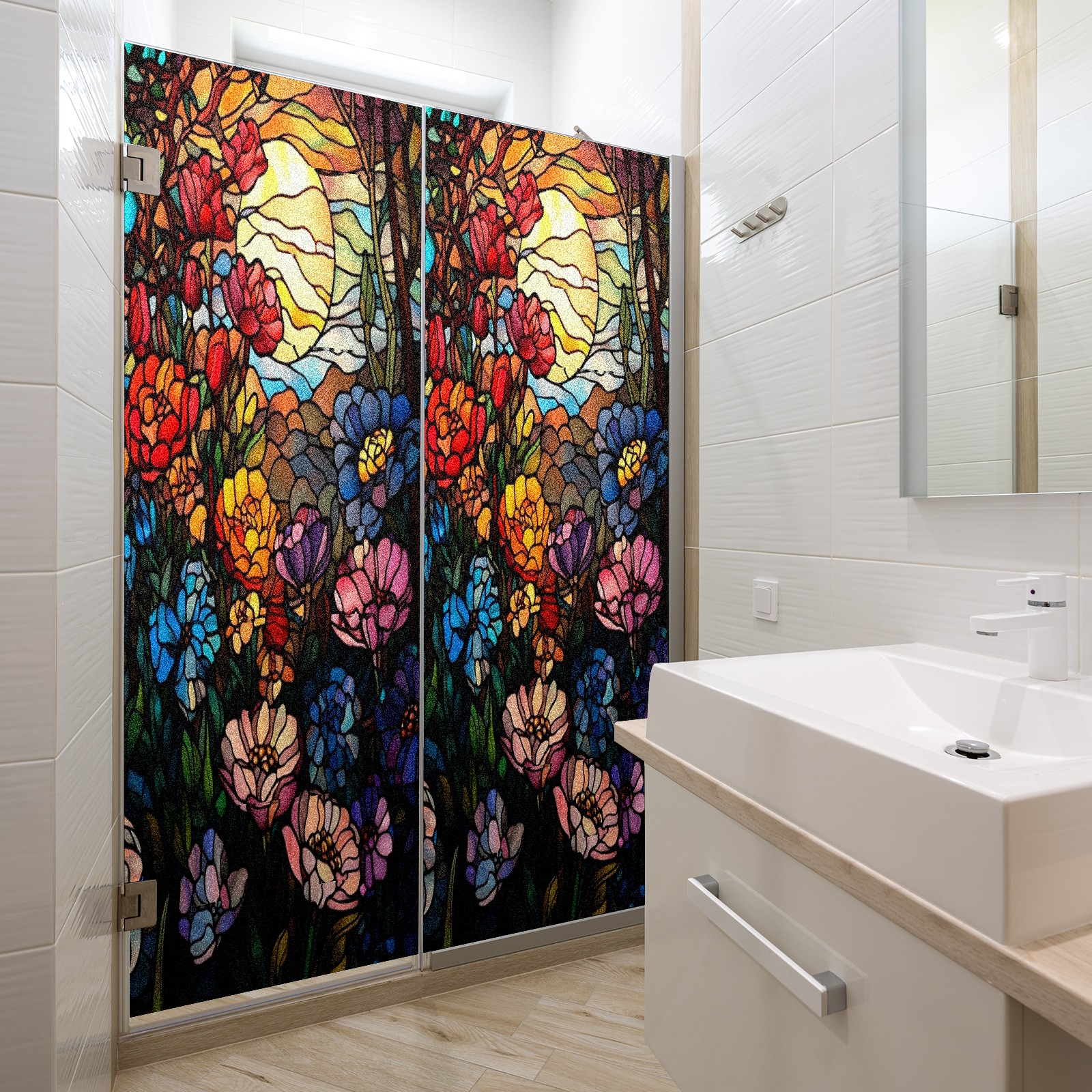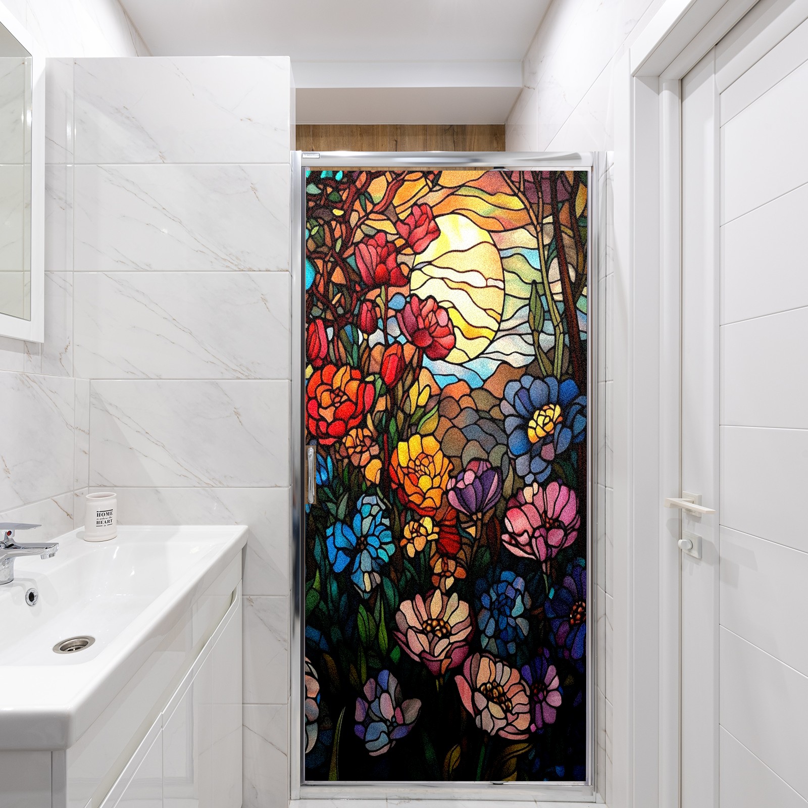 Frosted Glass Window Film Privacy Film Decorative Static Cling Window Film Stained Glass Decals for Bathroom Shower Door Non Adhesive Nature Colorful Flowers (17.7x23.6in)