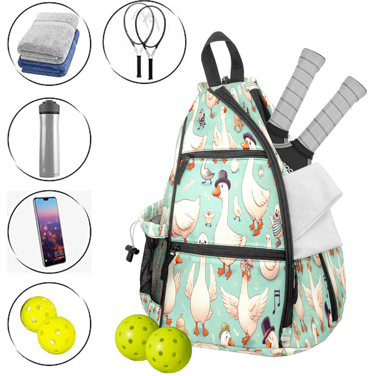 Pickleball Bag with Padded Back, Light Blue Background White Geese Multi-Compartment Paddle Backpack, Lightweight Nylon Sports Bag for Men & Women