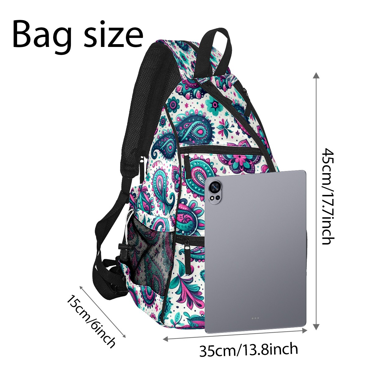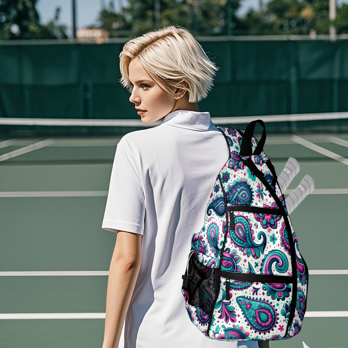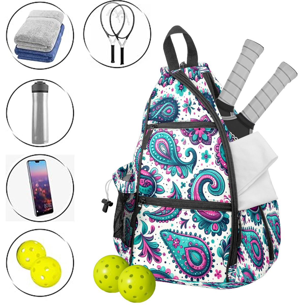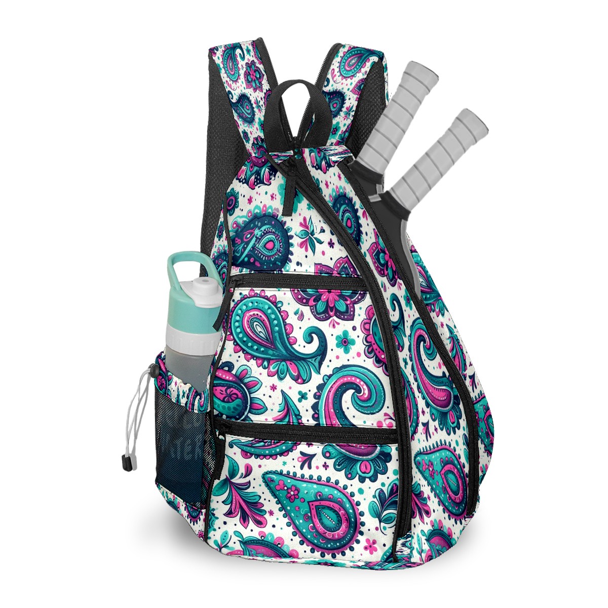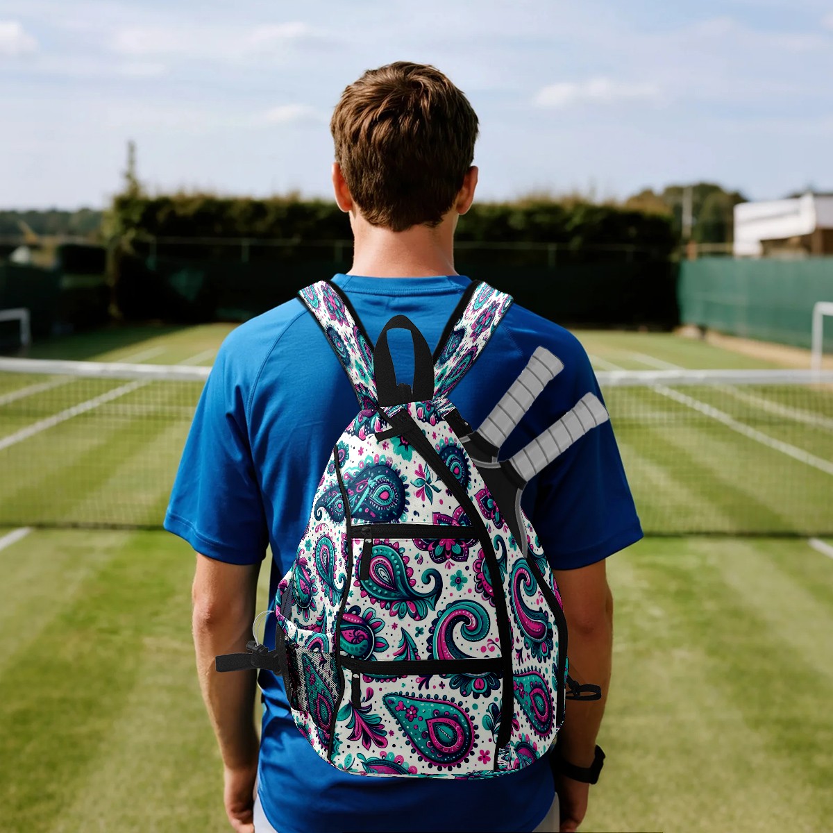 Pickleball Bag with Padded Back, Blue Purple Paisley Multi-Compartment Paddle Backpack, Lightweight Nylon Sports Bag for Men & Women