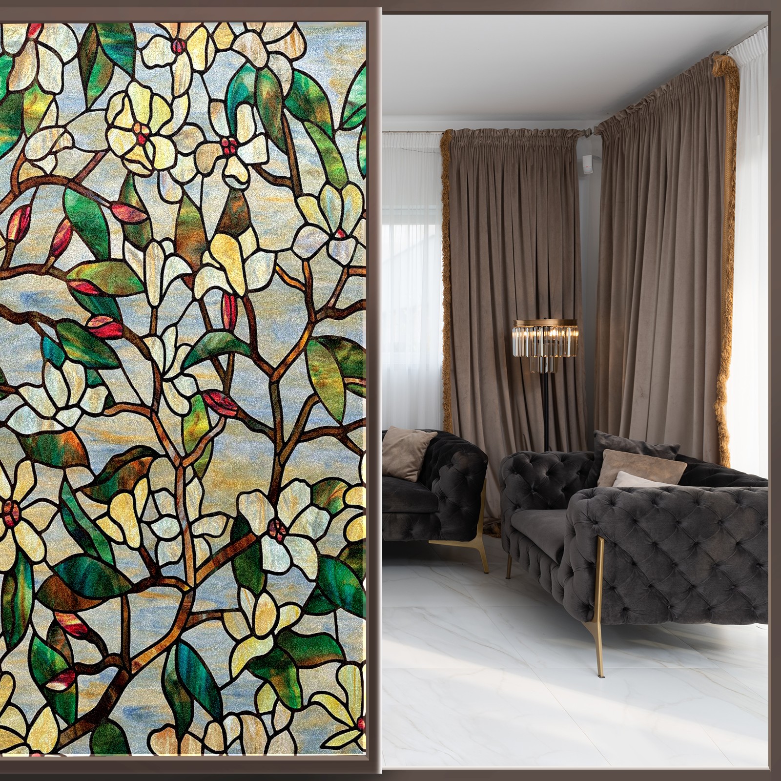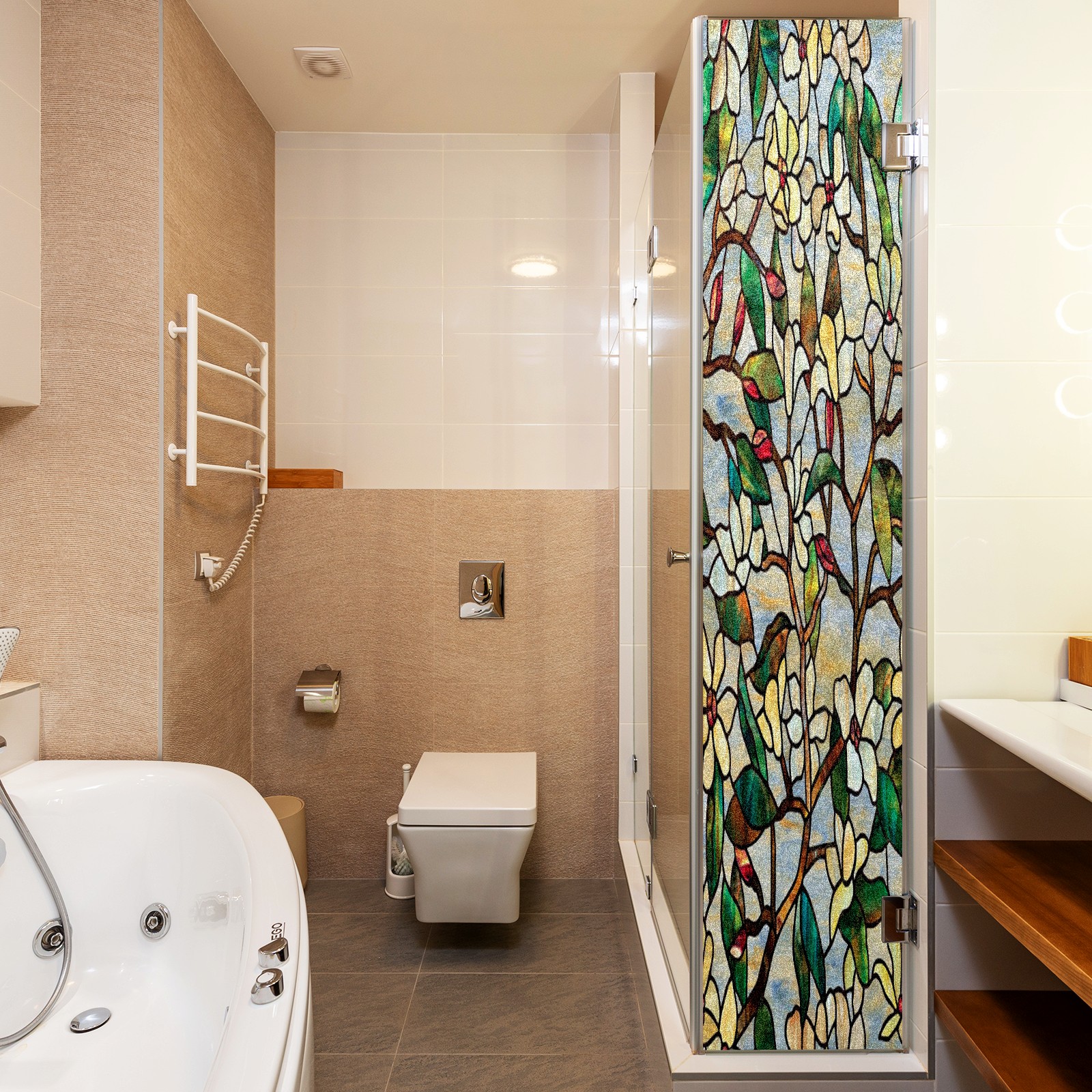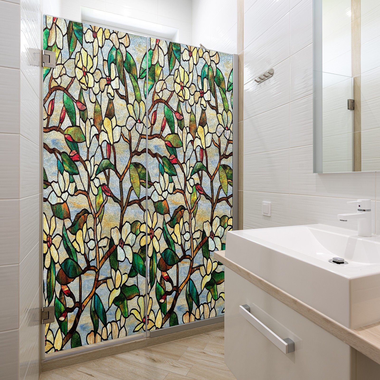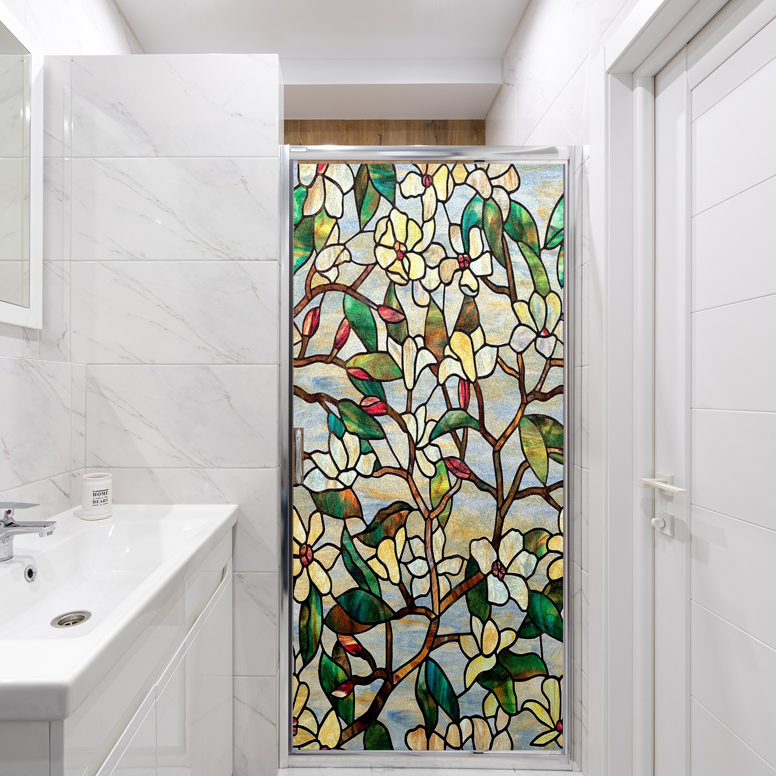Frosted Glass Window Film Privacy Film Decorative Static Cling Window Film Stained Glass Decals for Bathroom Shower Door Non Adhesive Colored Flowers (17.7x23.6in)