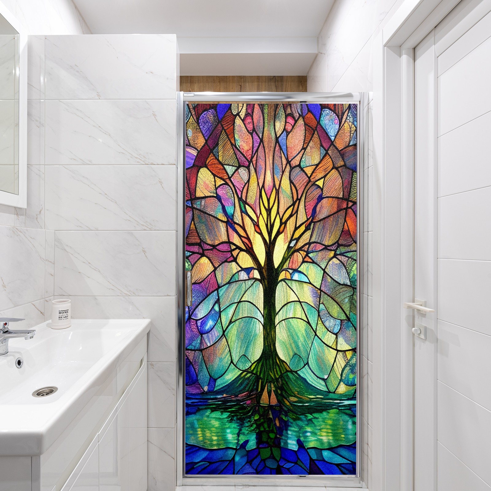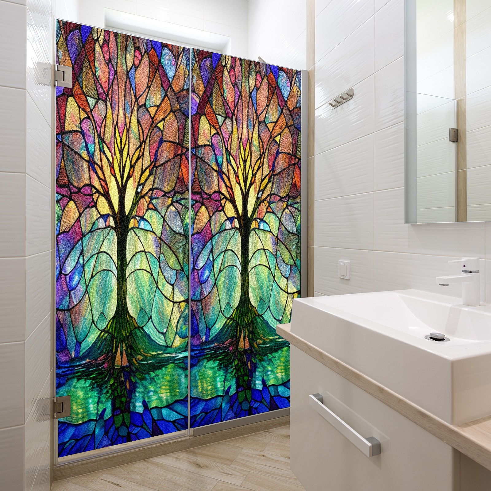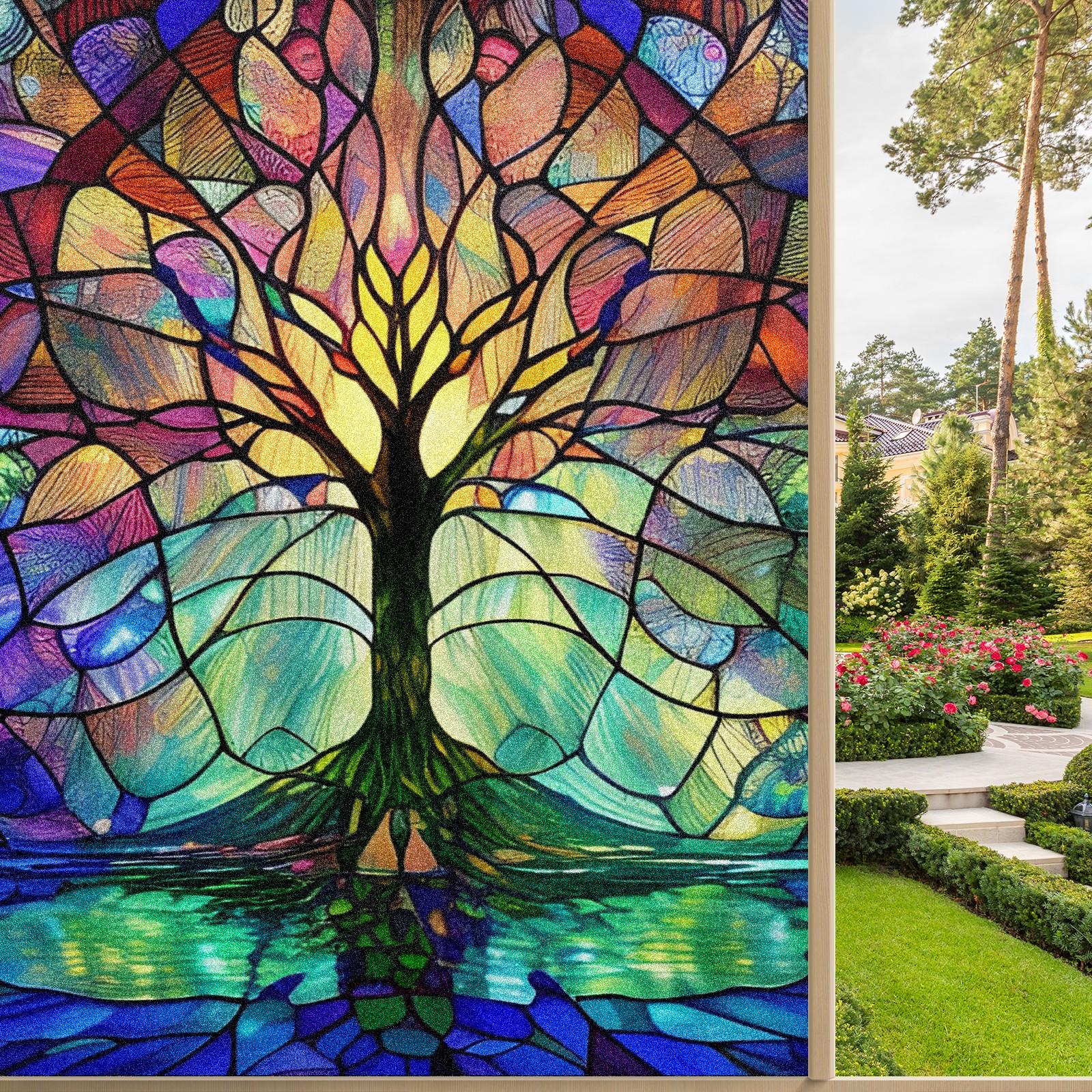 Frosted Glass Window Film Privacy Film Decorative Static Cling Window Film Stained Glass Decals for Bathroom Shower Door Non Adhesive Colored Tree (17.7x23.6in)
