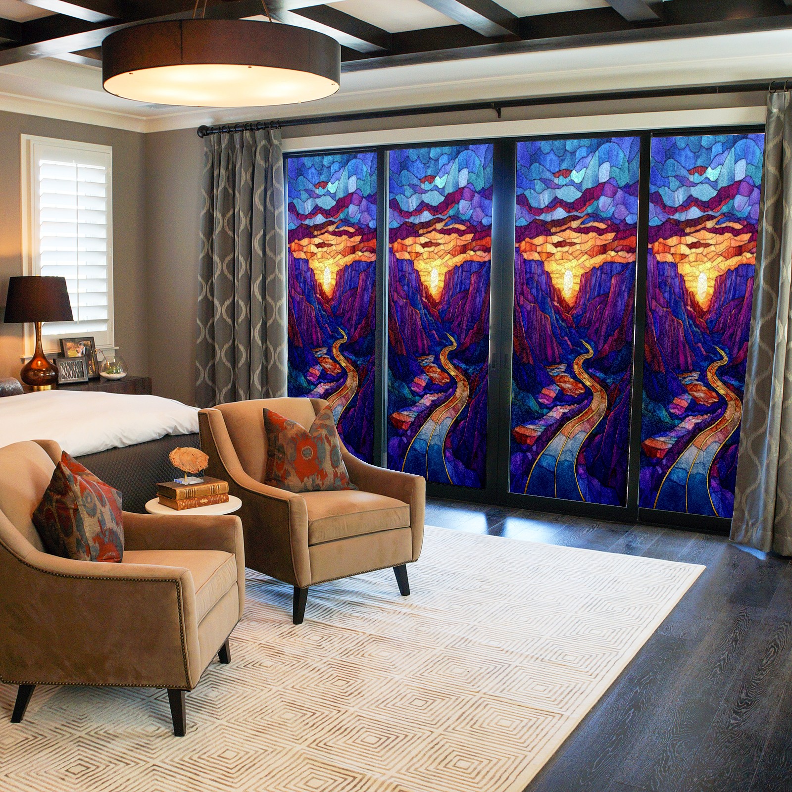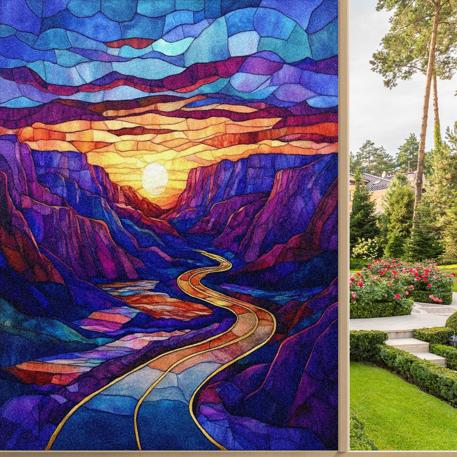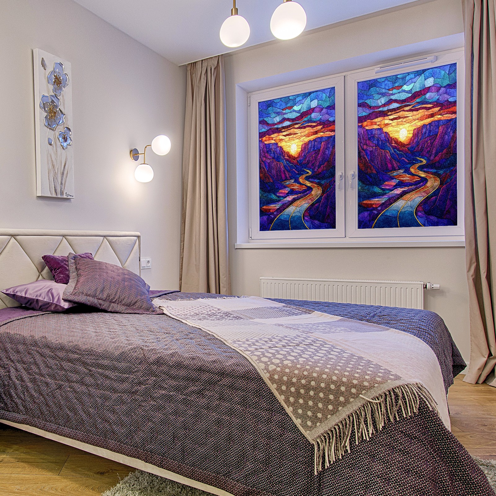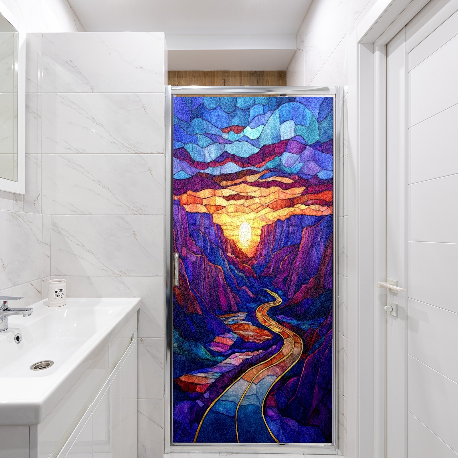 Frosted Glass Window Film Privacy Film Decorative Static Cling Window Film Stained Glass Decals for Bathroom Shower Door Non Adhesive Purple Sunrise Mountain (17.7x23.6in)