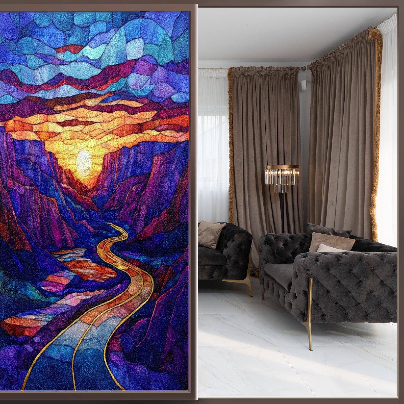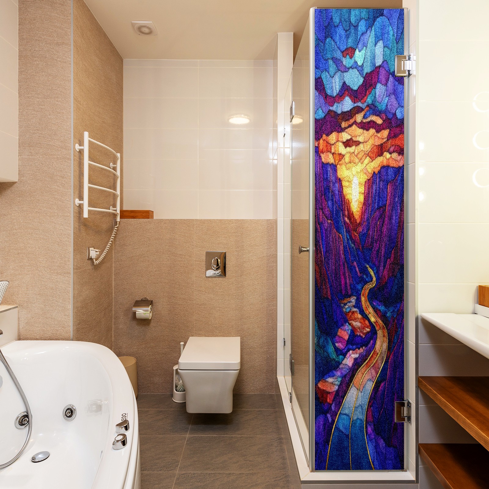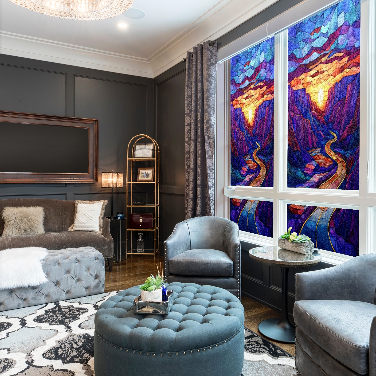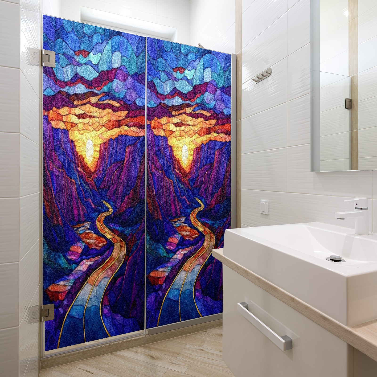 Frosted Glass Window Film Privacy Film Decorative Static Cling Window Film Stained Glass Decals for Bathroom Shower Door Non Adhesive Purple Sunrise Mountain (17.7x23.6in)