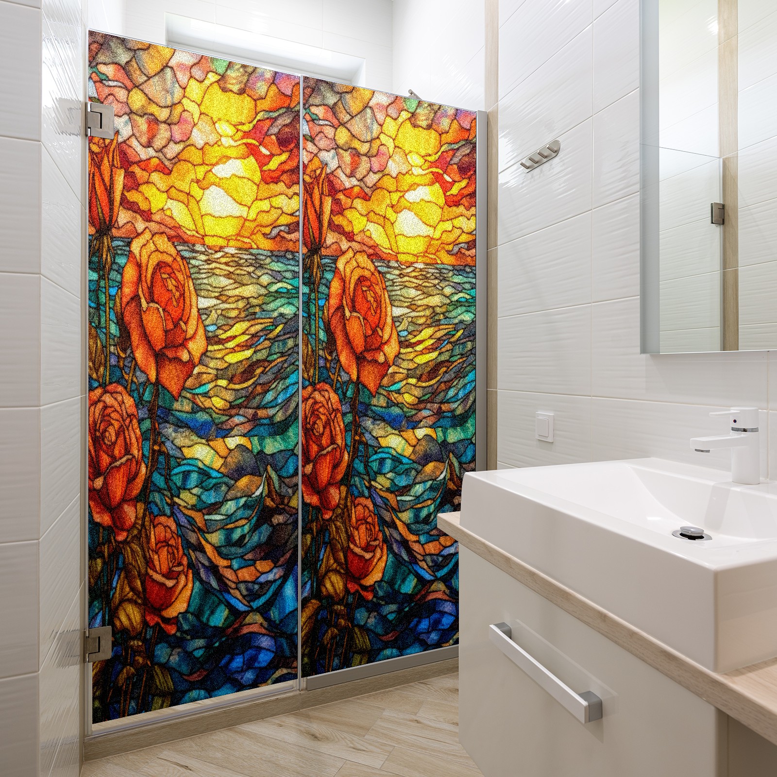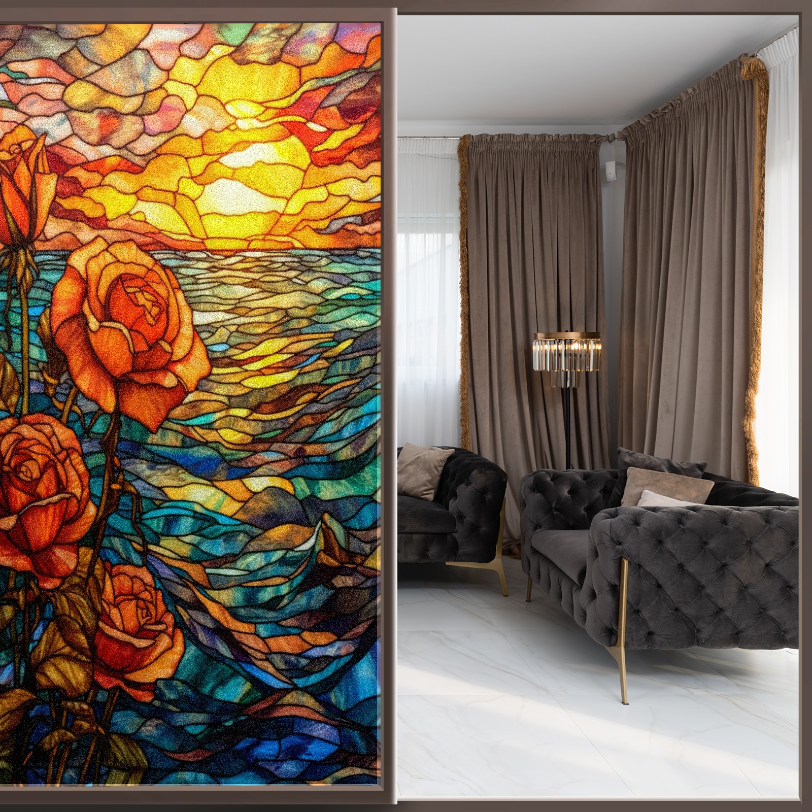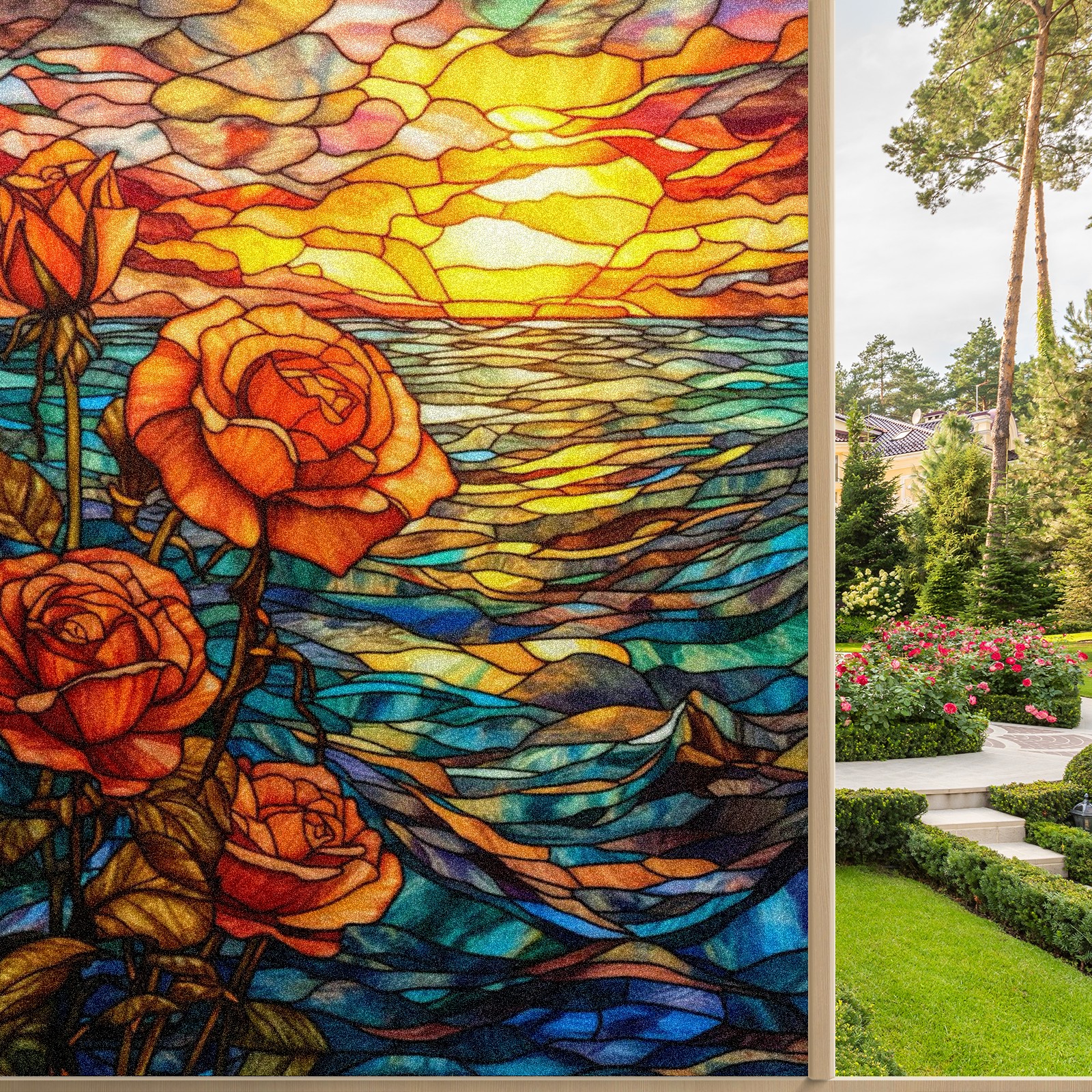 Frosted Glass Window Film Privacy Film Decorative Static Cling Window Film Stained Glass Decals for Bathroom Shower Door Non Adhesive Orange Rose Flower (17.7x23.6in)