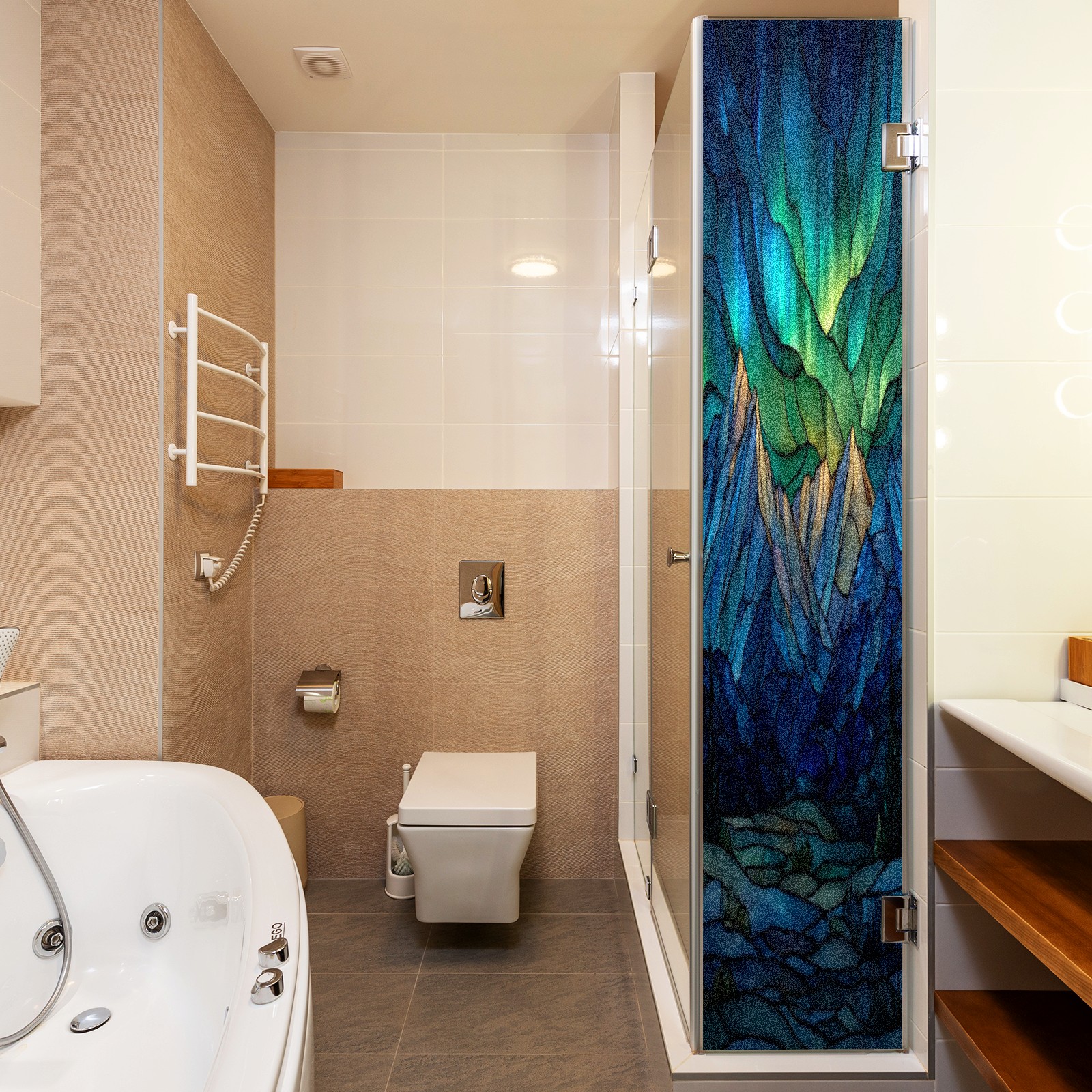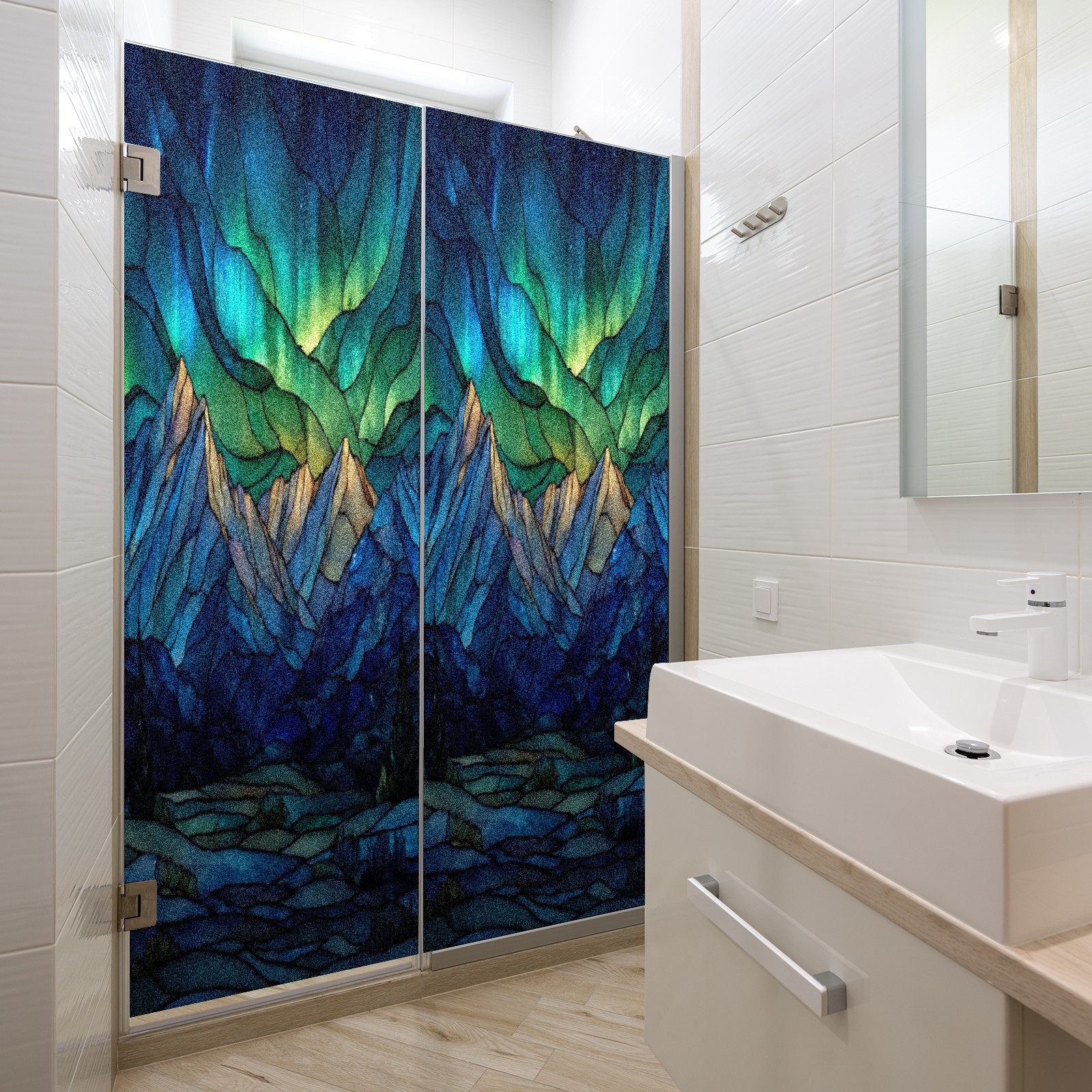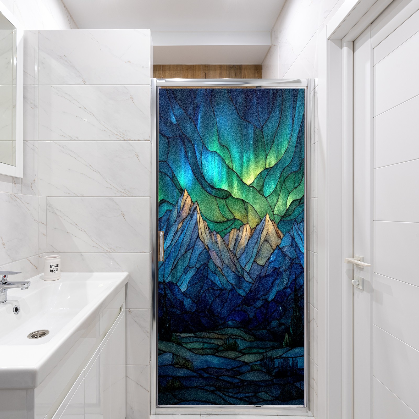 Frosted Glass Window Film Privacy Film Decorative Static Cling Window Film Stained Glass Decals for Bathroom Shower Door Non Adhesive Blue Mountains Print (17.7x23.6in)