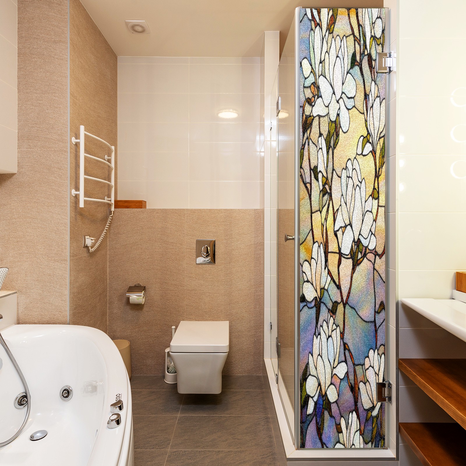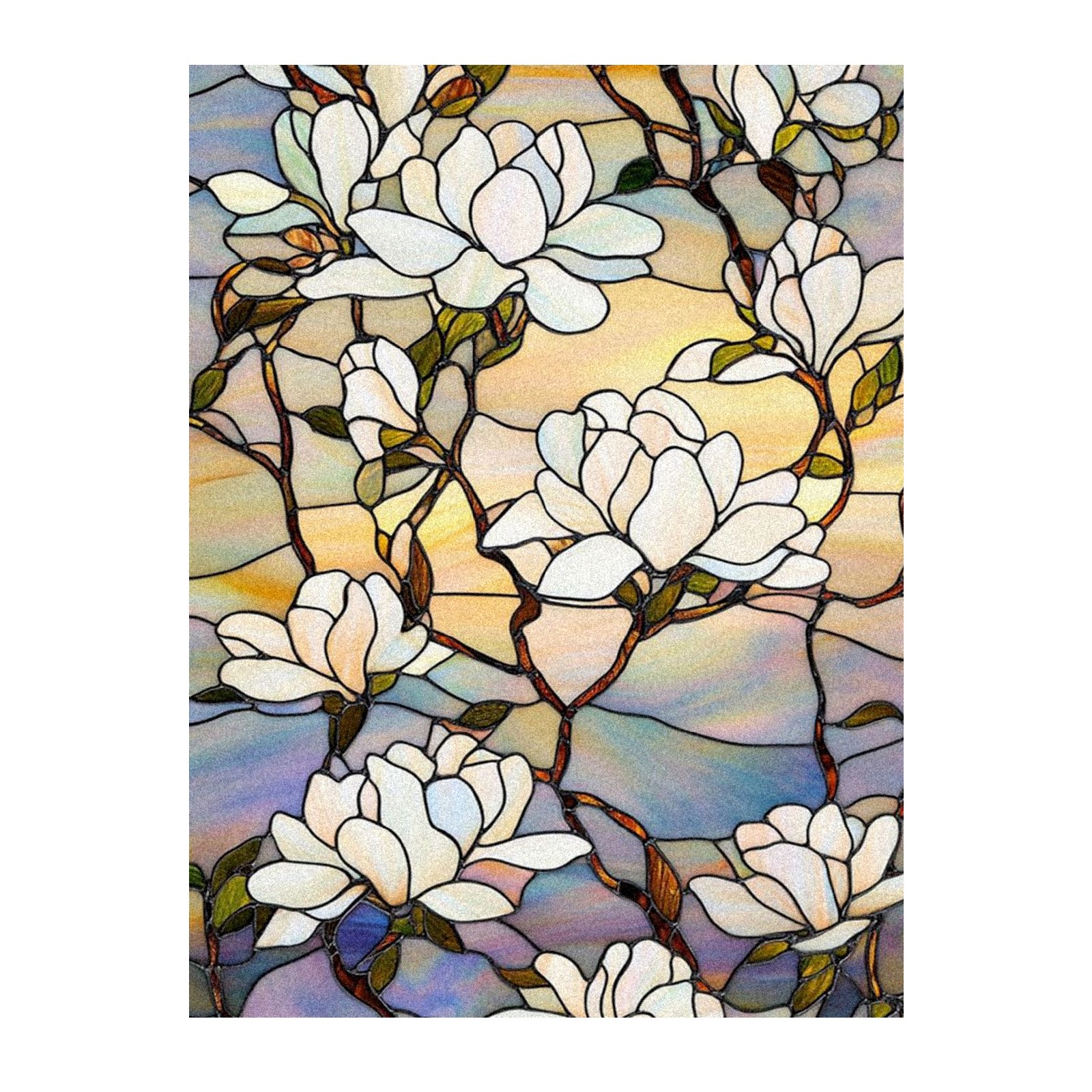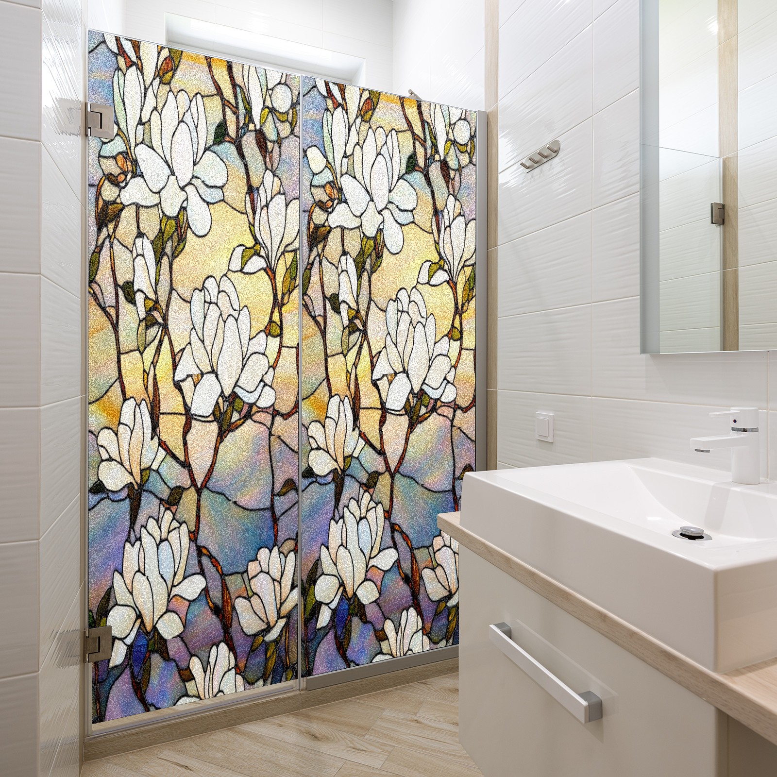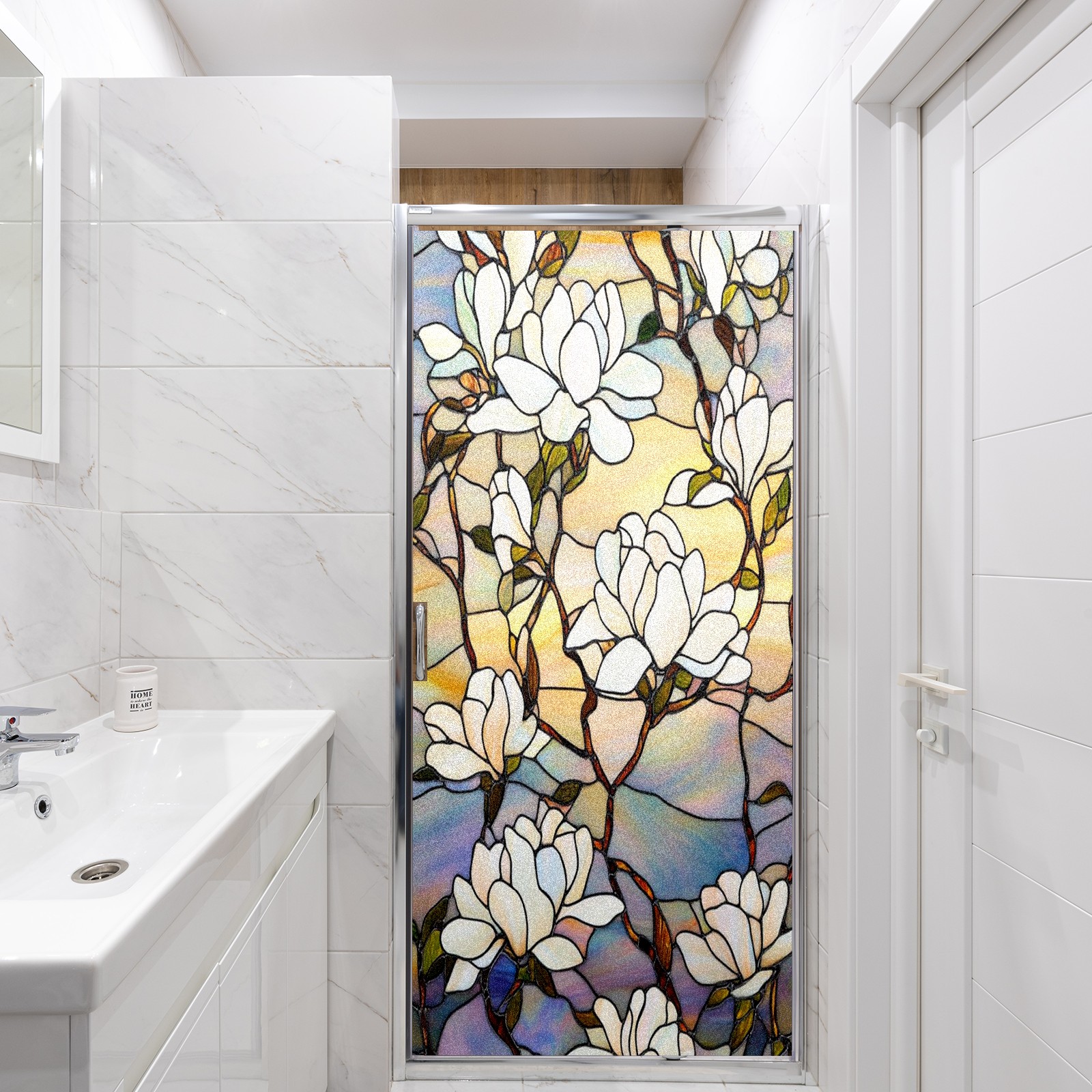 Frosted Glass Window Film Privacy Film Decorative Static Cling Window Film Stained Glass Decals for Bathroom Shower Door Non Adhesive White Retro Flower (17.7x23.6in)