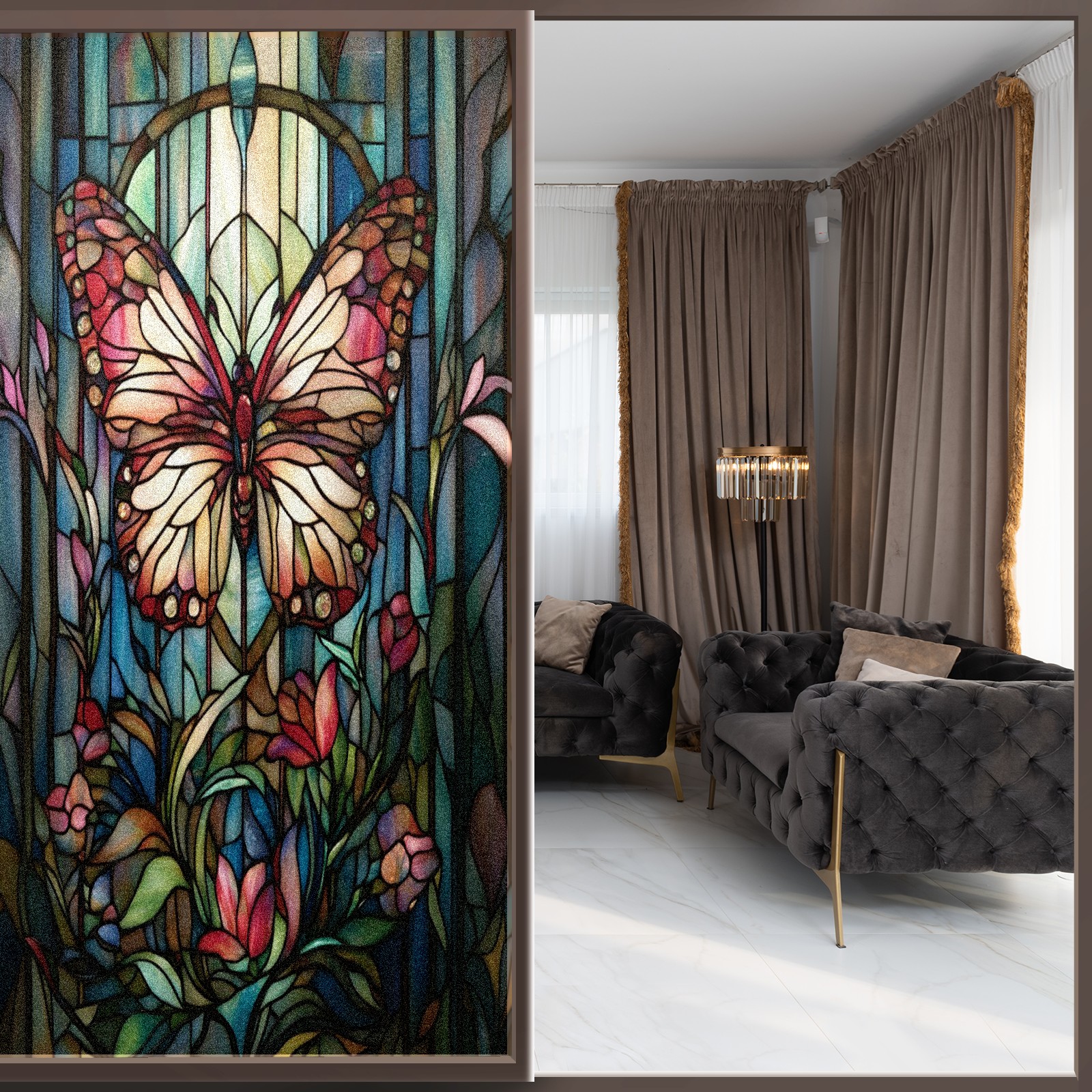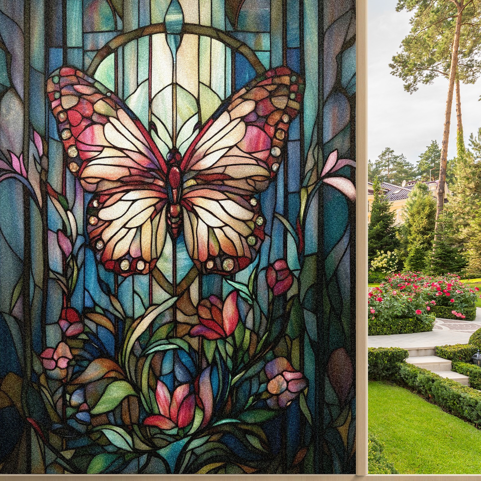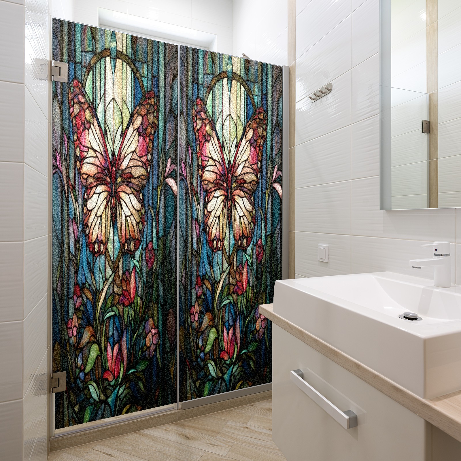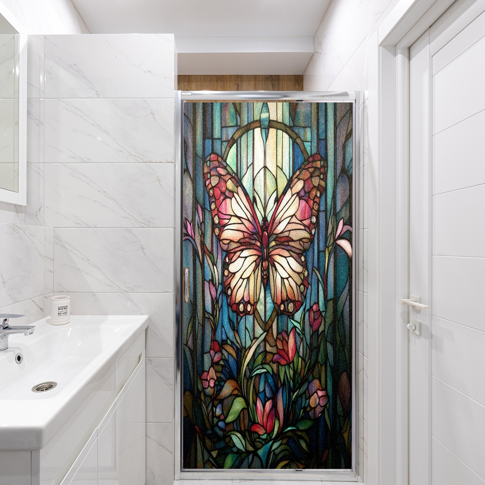 Frosted Glass Window Film Privacy Film Decorative Static Cling Window Film Stained Glass Decals for Bathroom Shower Door Non Adhesive Colored Butterfly Floral (17.7x23.6in)