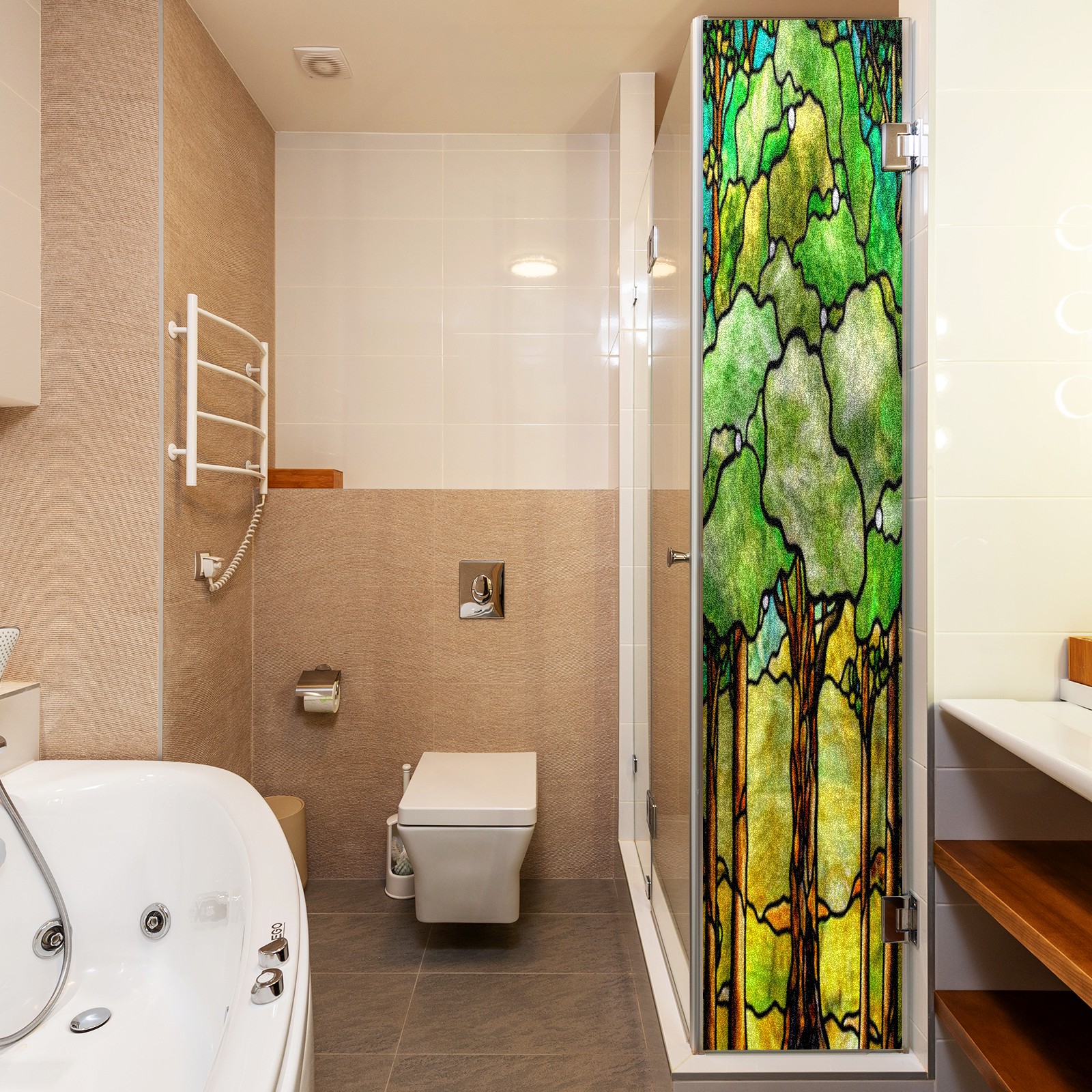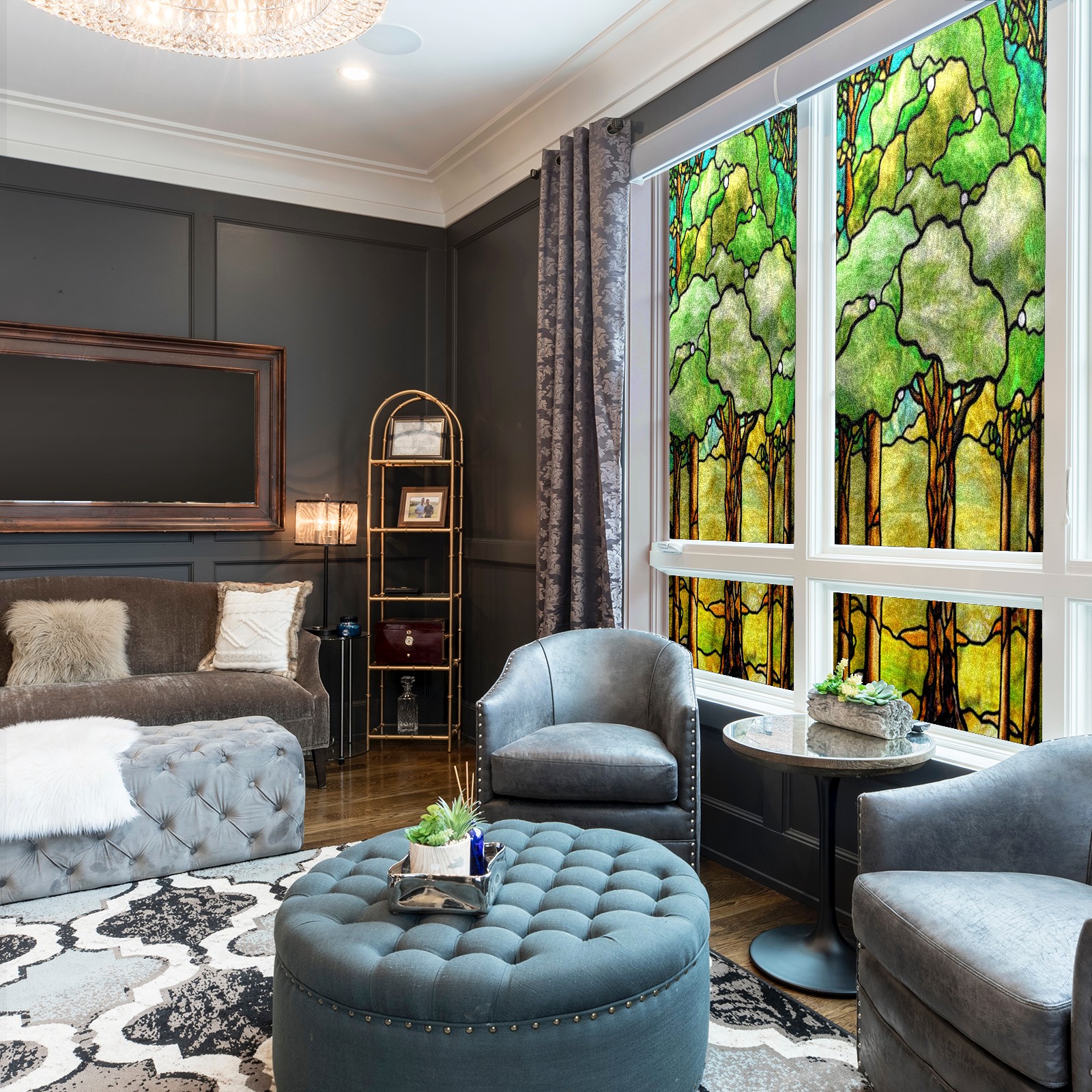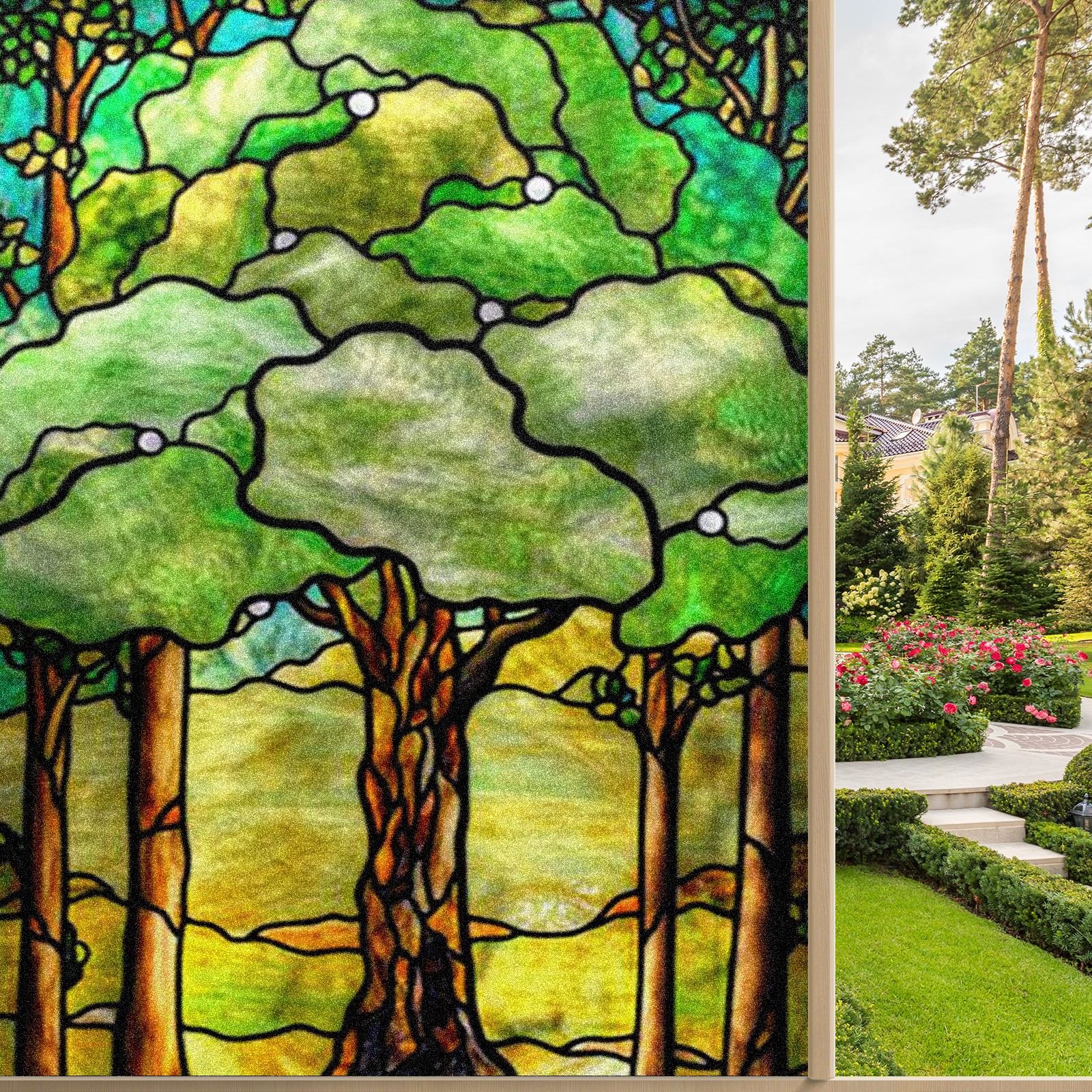 Window Privacy Film Frosted Stained Glass Film Decorative Static Cling for Bathroom Home Office Peel and Stick Window Film Green Trees(17.7x23.6in)