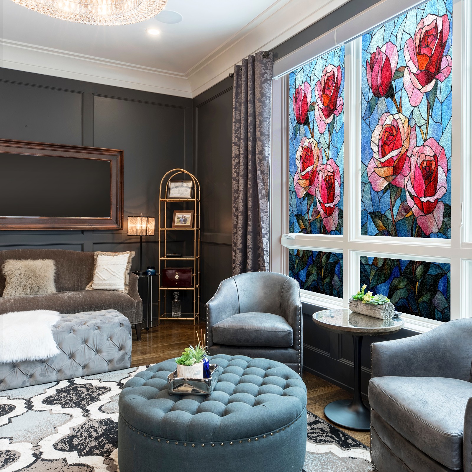 Window Privacy Film Frosted Stained Glass Film Decorative Static Cling for Bathroom Home Office Peel and Stick Window Film Stained Glass Red Rose(17.7x23.6in)