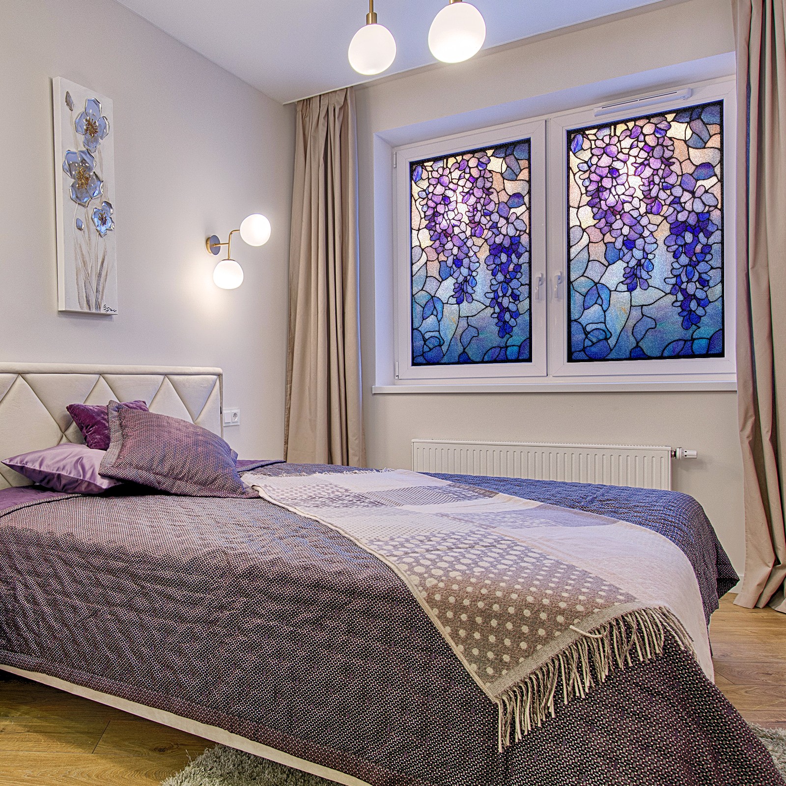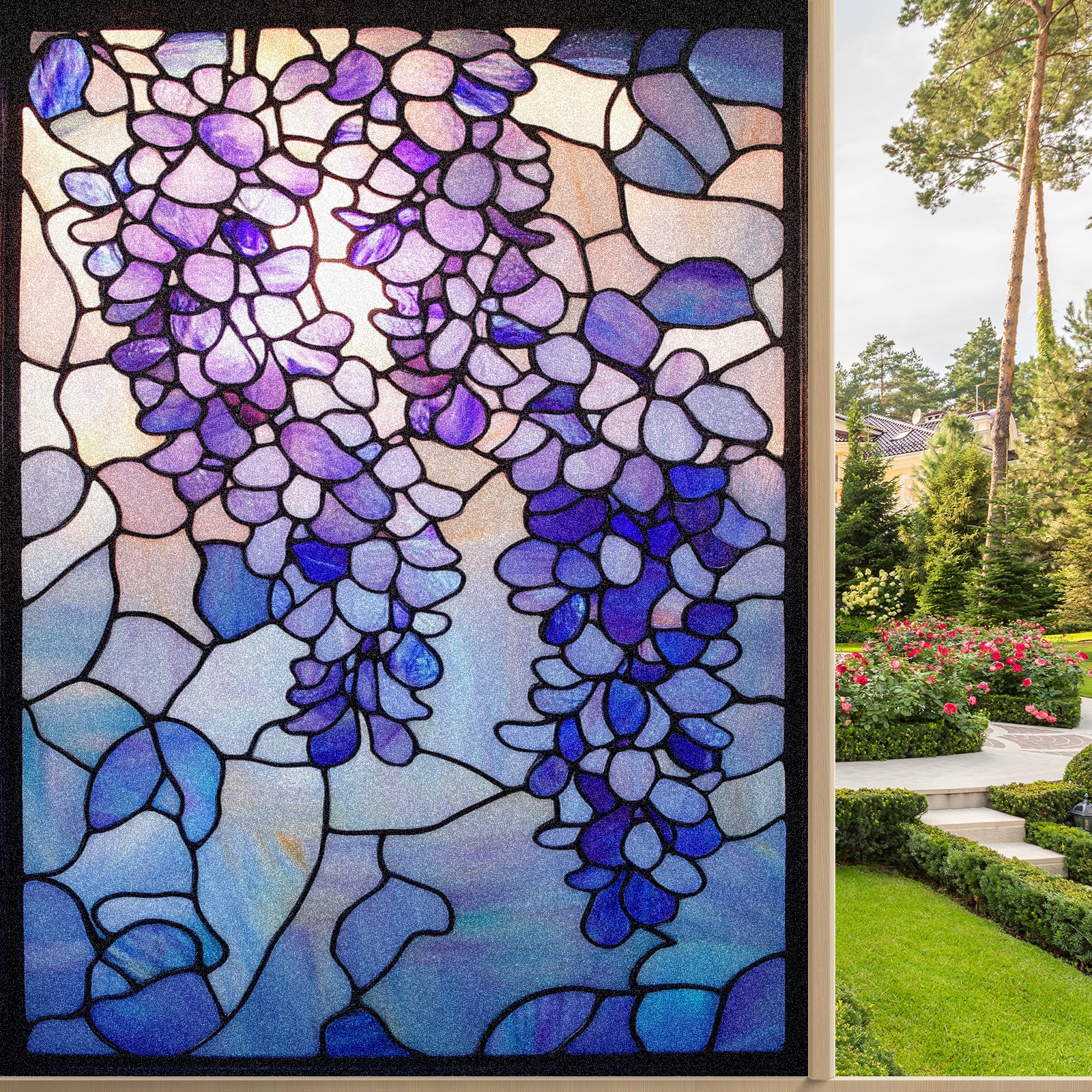 Window Privacy Film Frosted Stained Glass Film Decorative Static Cling for Bathroom Home Office Peel and Stick Window Film Wisteria Flowers(17.7x23.6in)