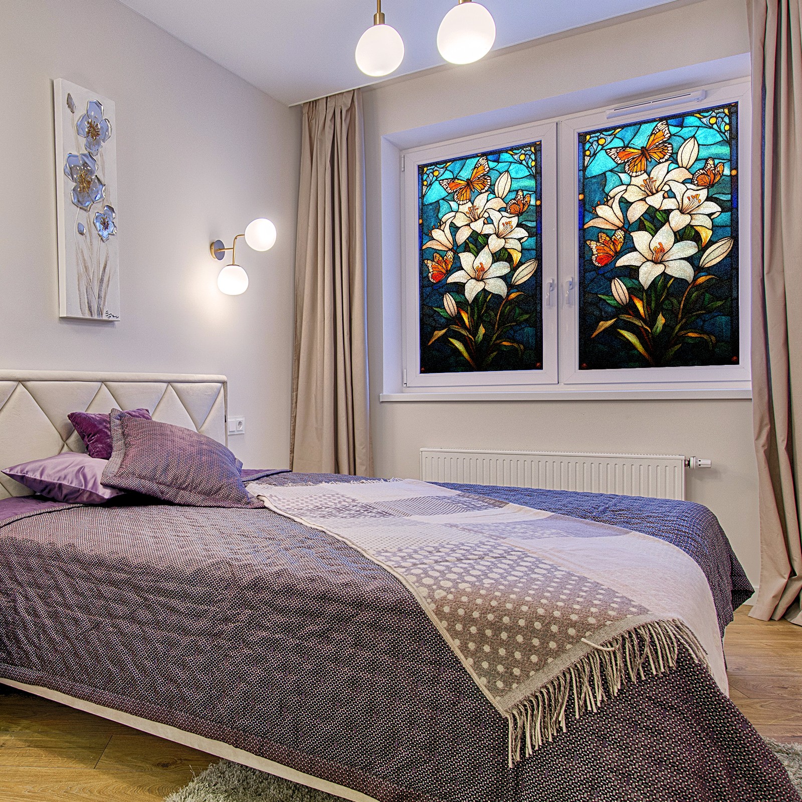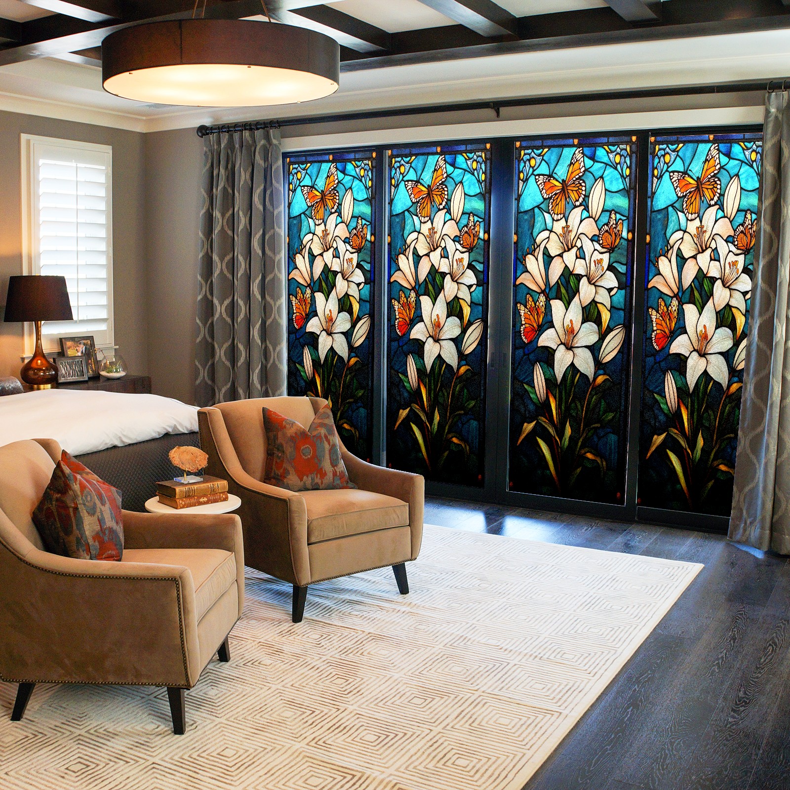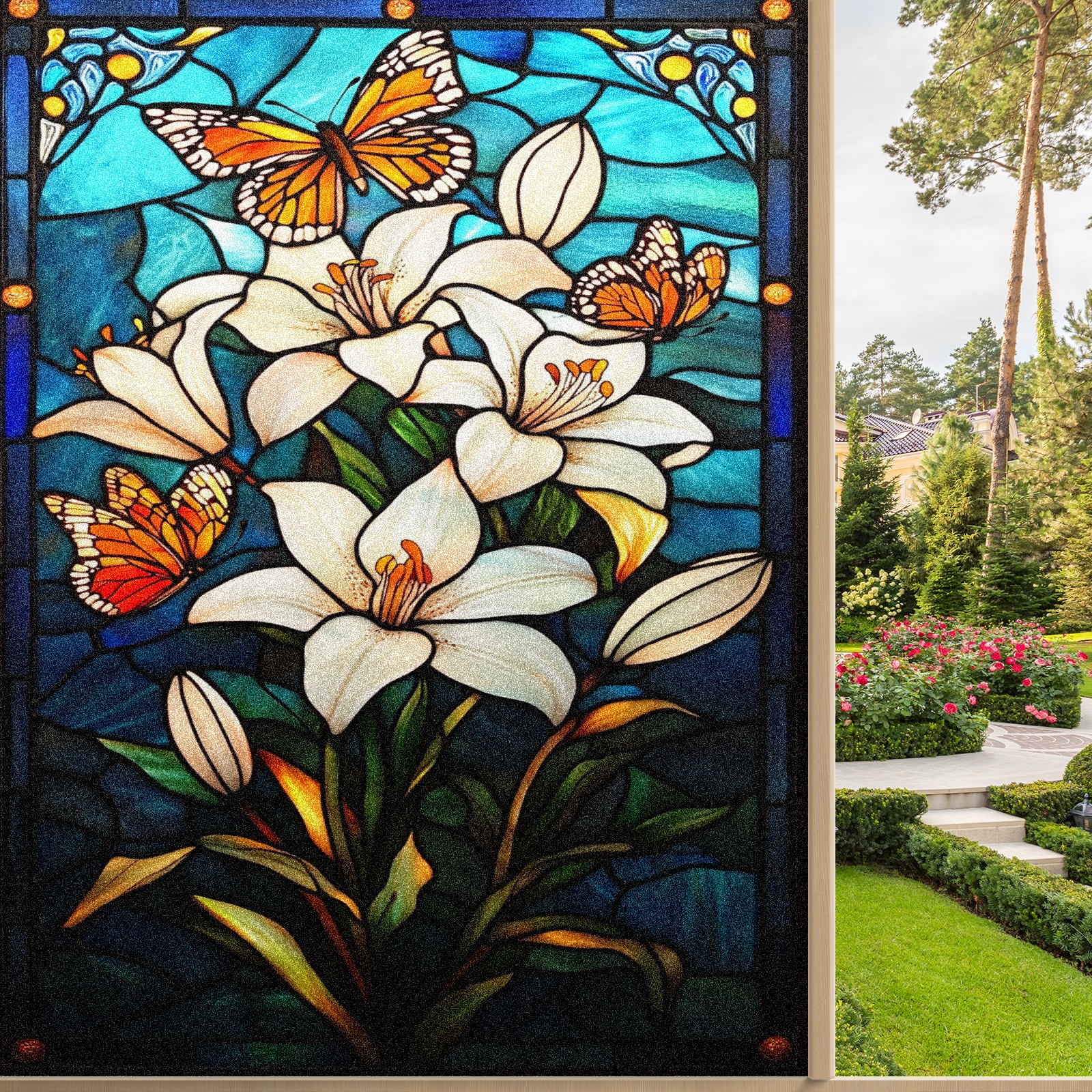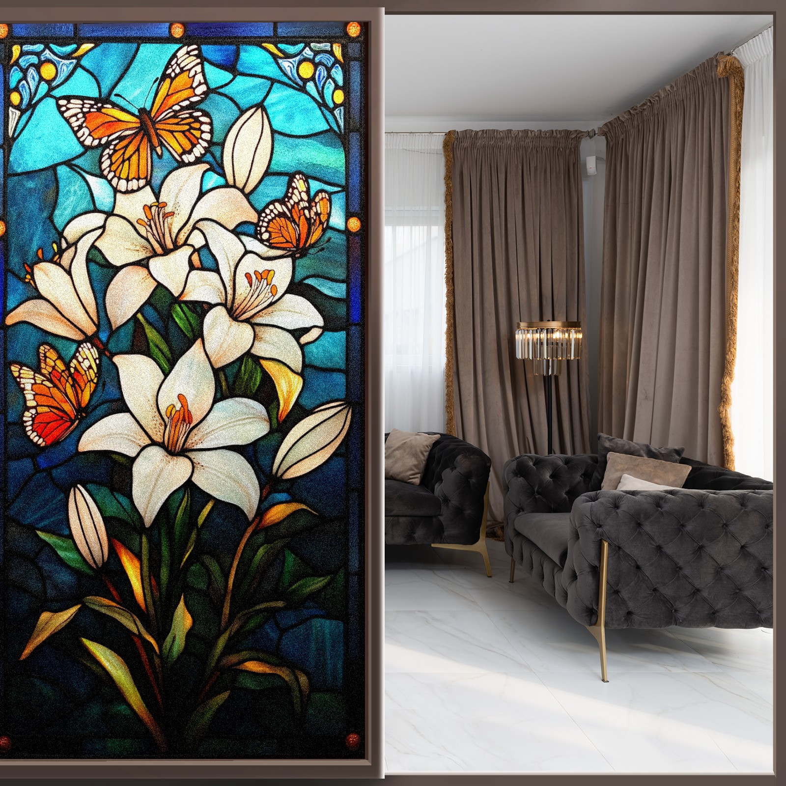 Window Privacy Film Frosted Stained Glass Film Decorative Static Cling for Bathroom Home Office Peel and Stick Window Film Lilies And Butterflies(17.7x23.6in)