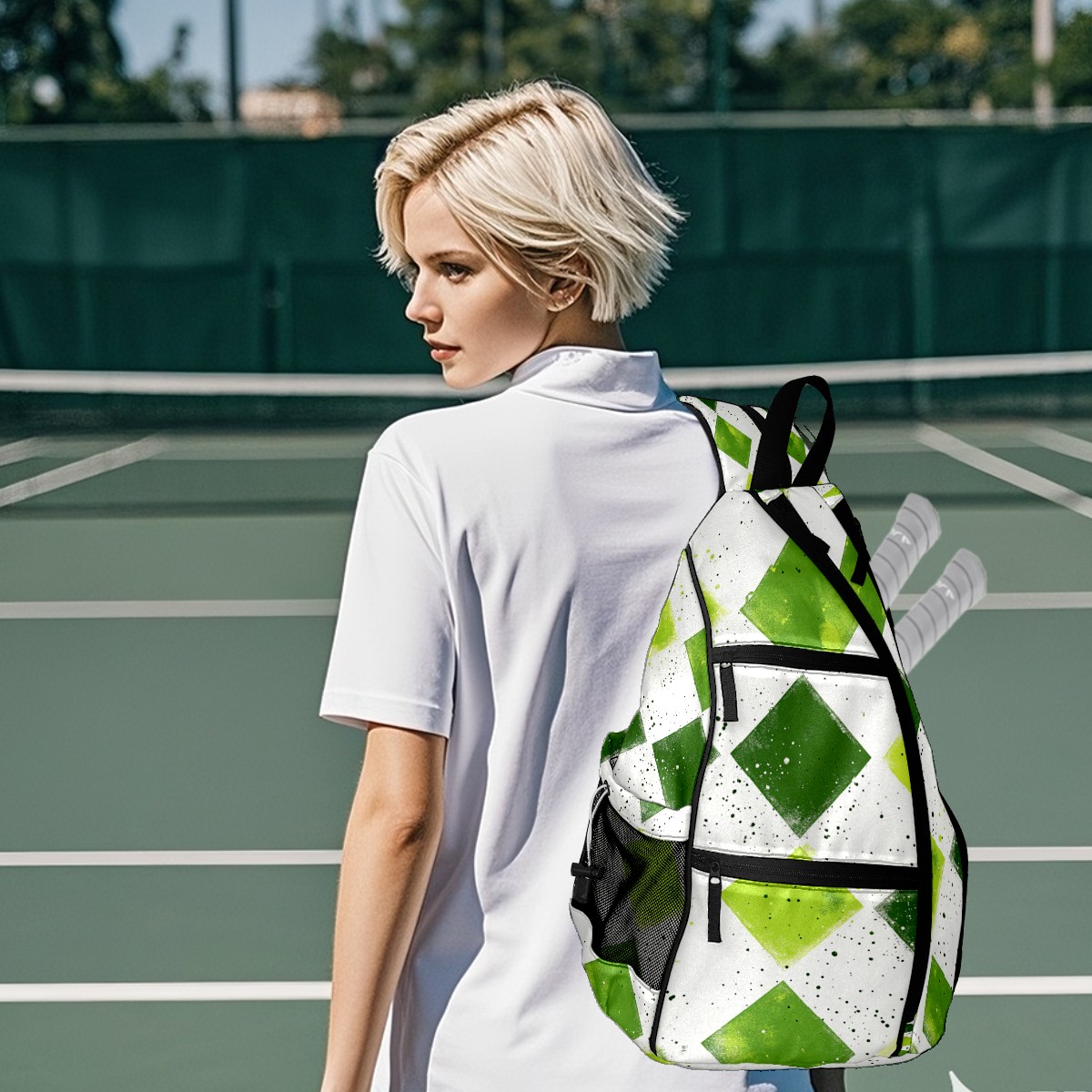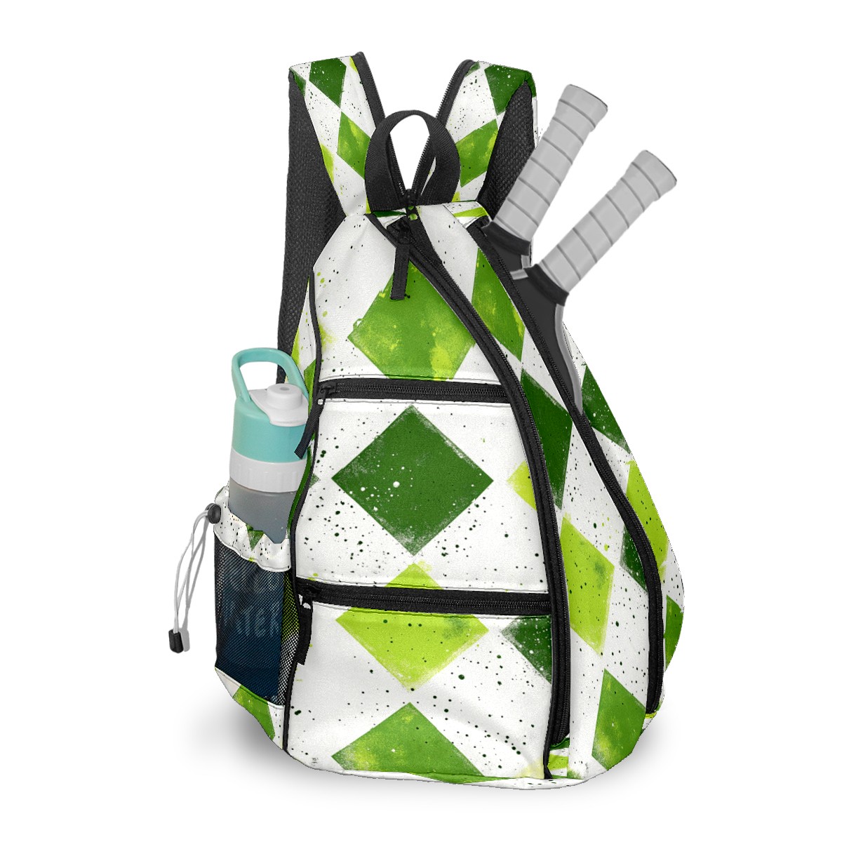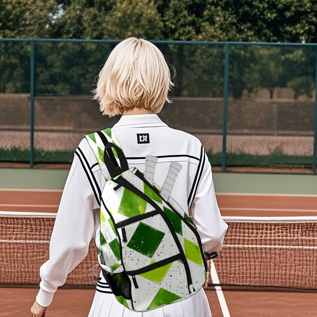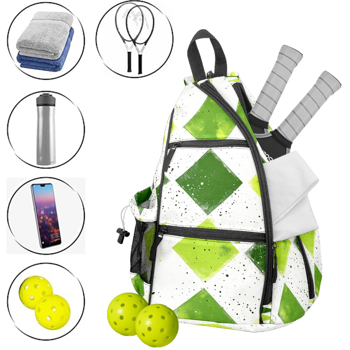 Pickleball Sling Bag for Women and Men - Backpack with Nylon Fabric/Woven Strap/Mesh Pocket/Fence Hook/Adjustable Bag Green Plaid Pattern