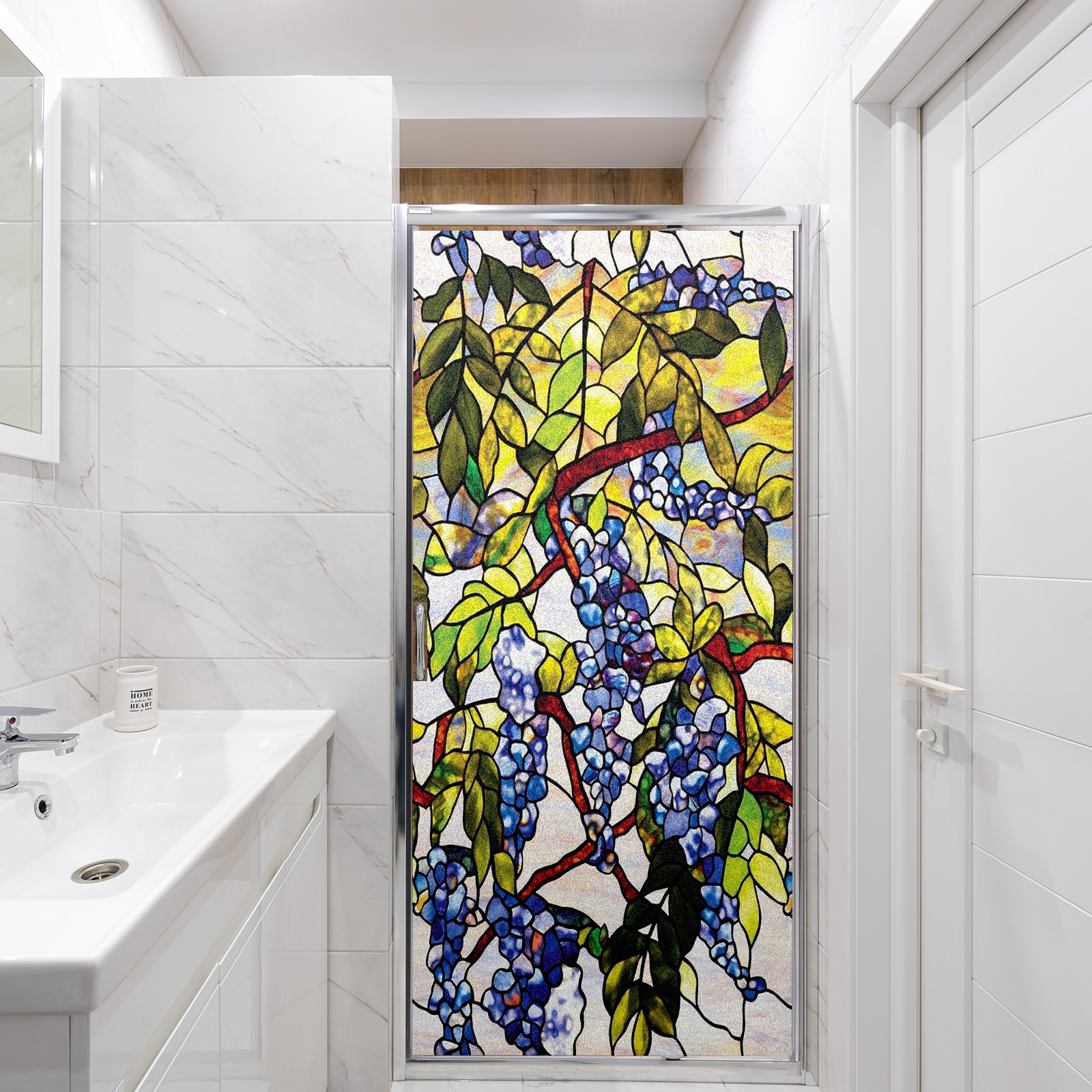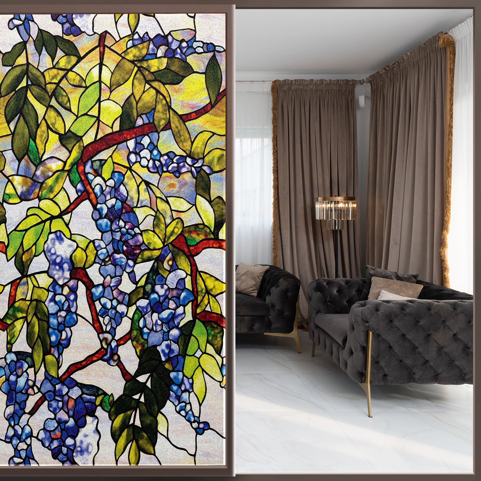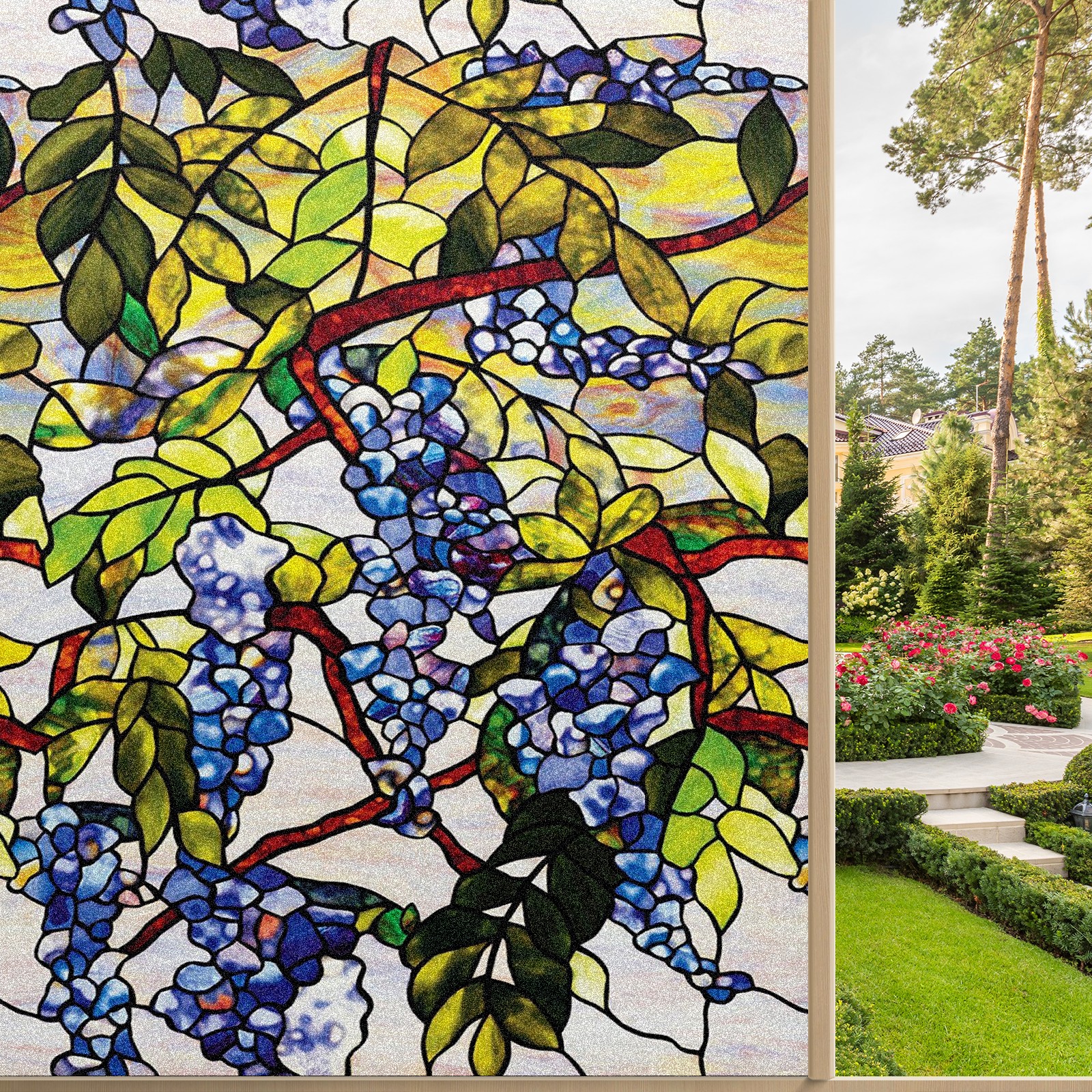 Window Privacy Film Frosted Stained Glass Film Decorative Static Cling for Bathroom Home Office Peel and Stick Window Film Purple Wistera Floral(17.7x23.6in)