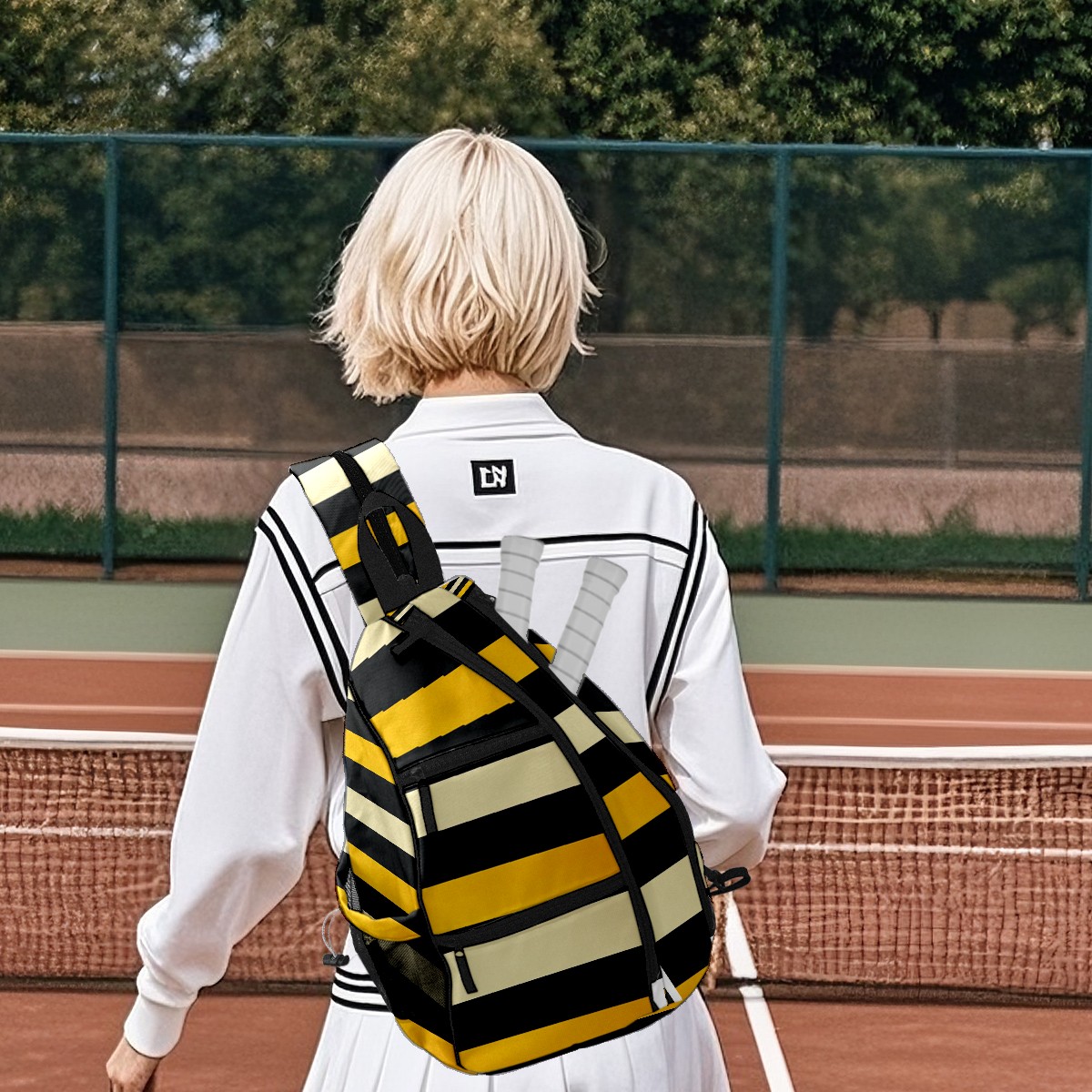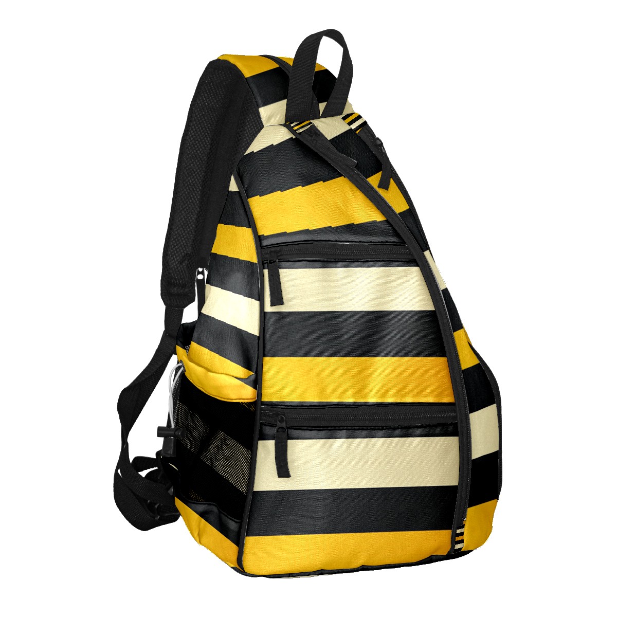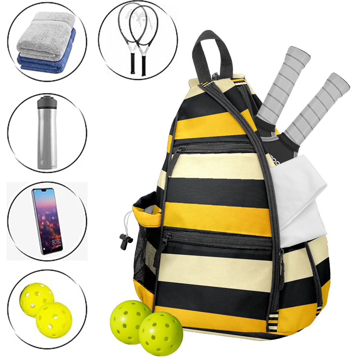 Pickleball Sling Bag for Women and Men - Backpack with Nylon Fabric/Woven Strap/Mesh Pocket/Fence Hook/Adjustable Bag Yellow Black Striped Pattern
