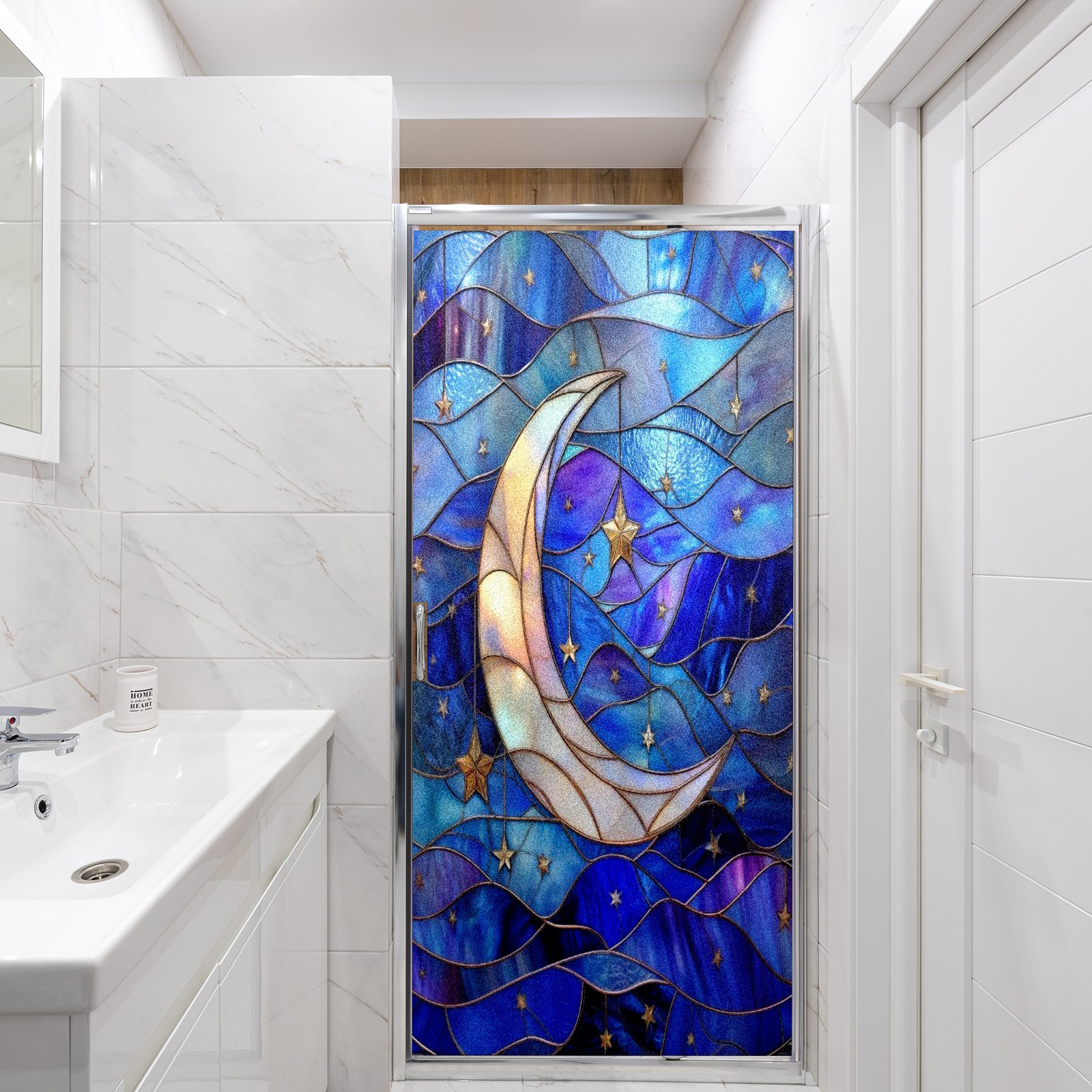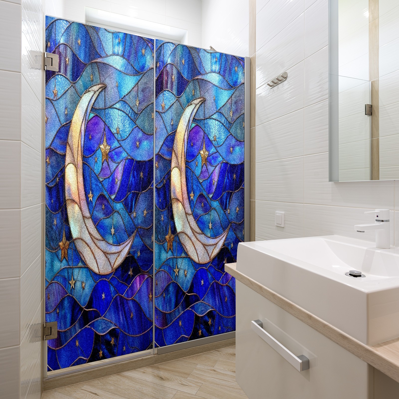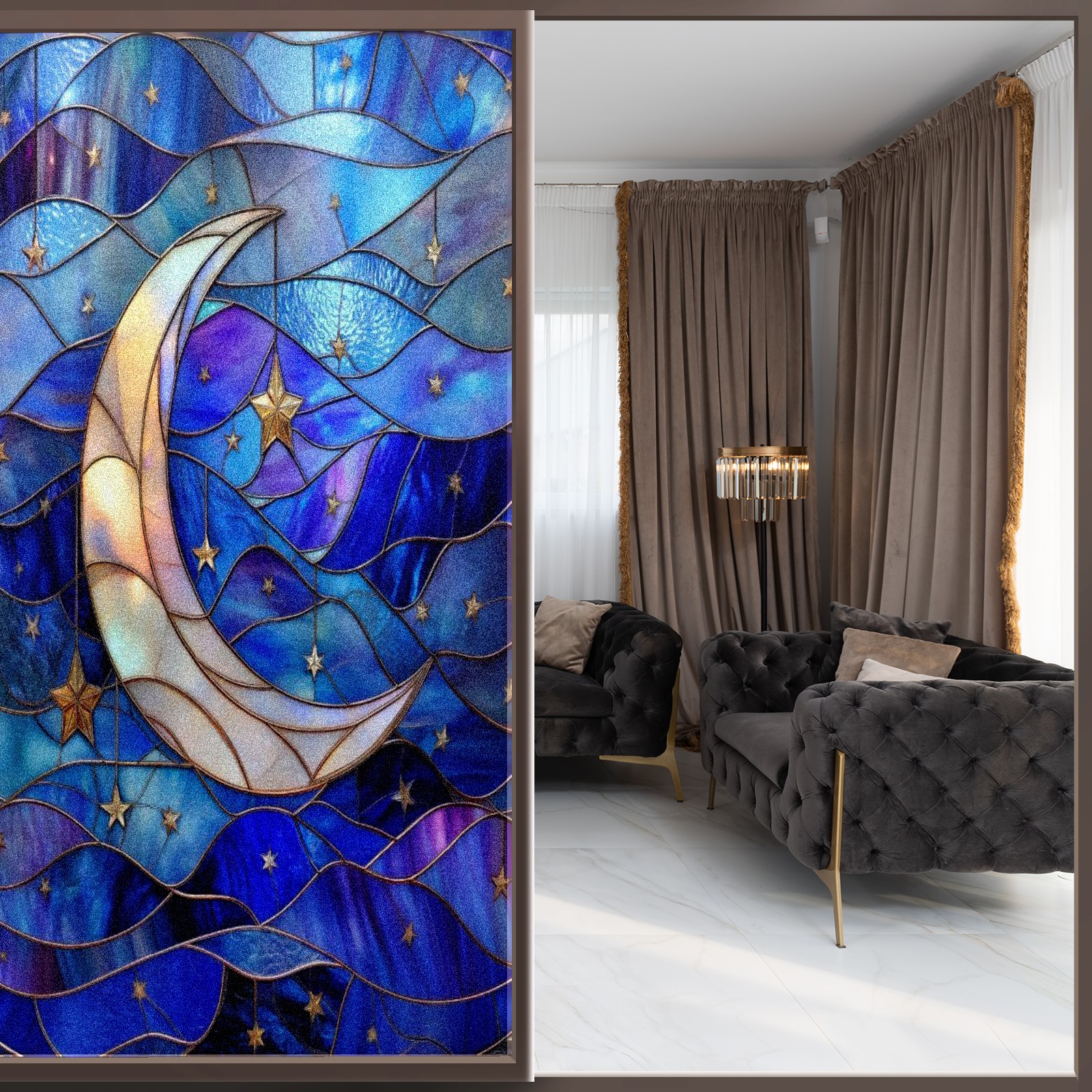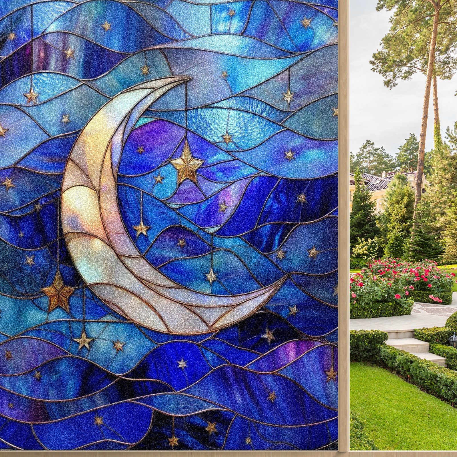 Window Privacy Film Frosted Stained Glass Film Decorative Static Cling for Bathroom Home Office Peel and Stick Window Film Blue Moon Stars(17.7x23.6in)