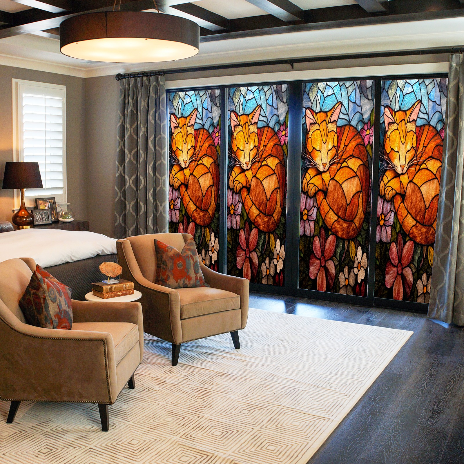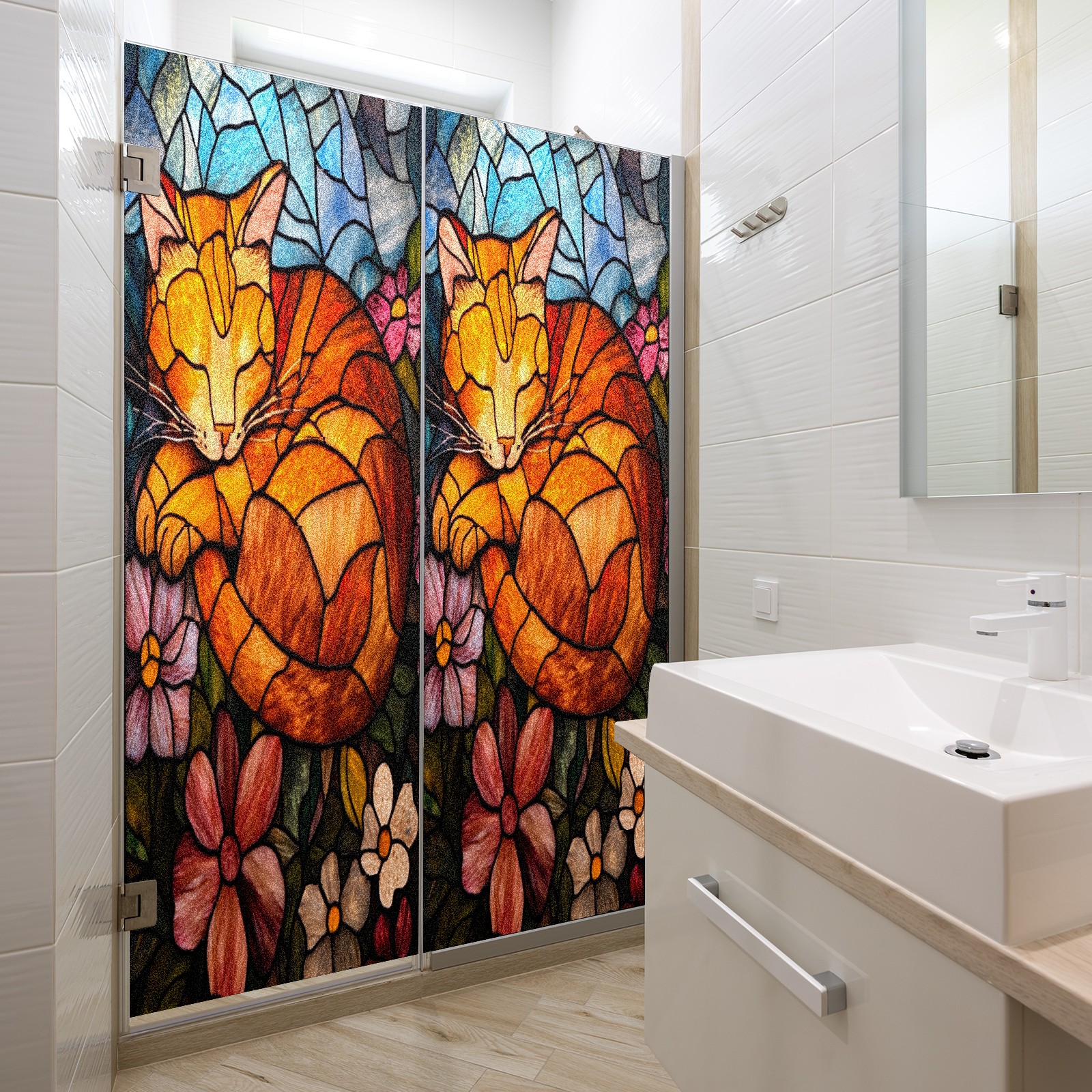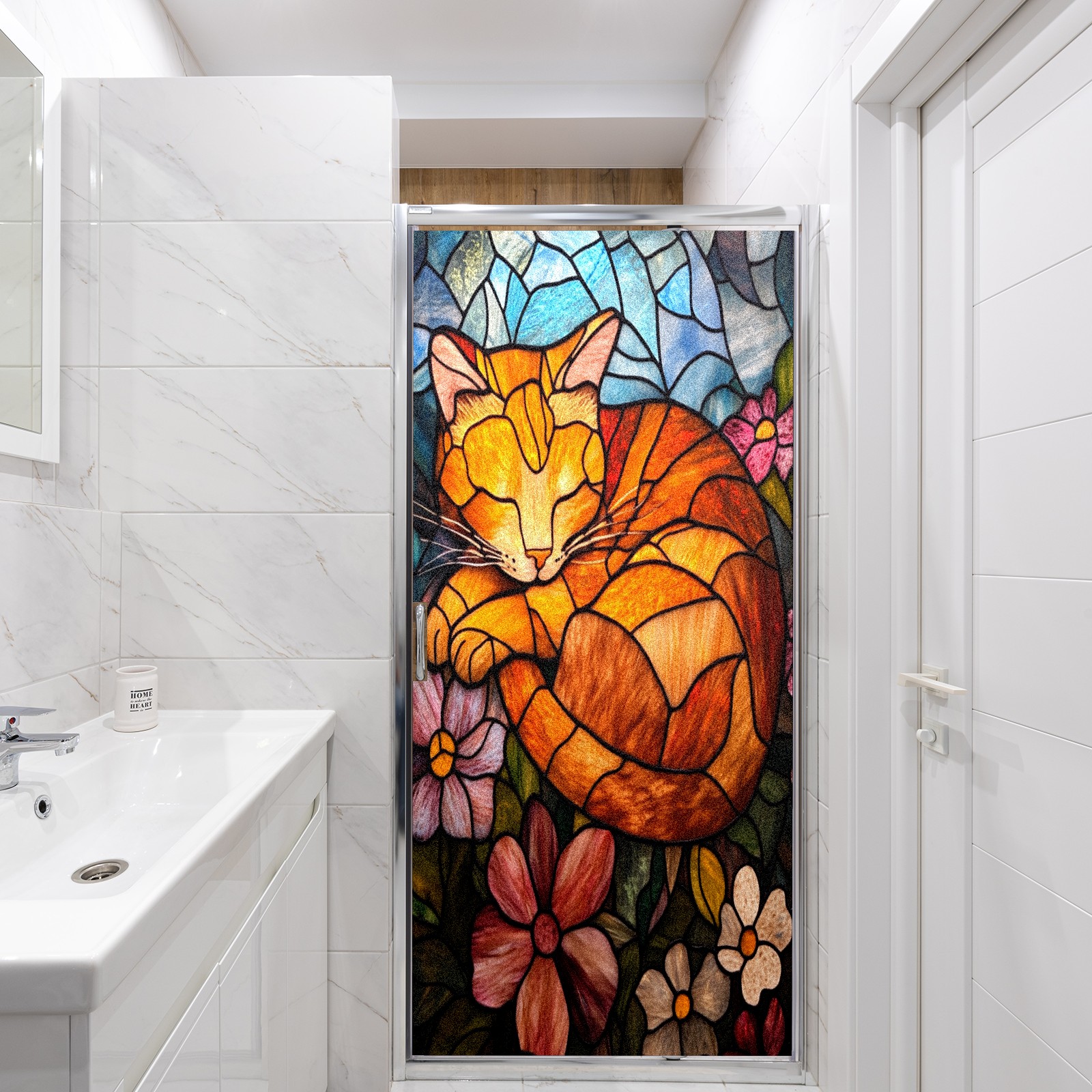 Window Privacy Film Frosted Stained Glass Film Decorative Static Cling for Bathroom Home Office Peel and Stick Window Film Stained Window Sleeping Cat Flowers 1(17.7x23.6in)