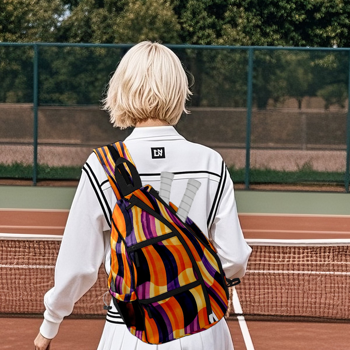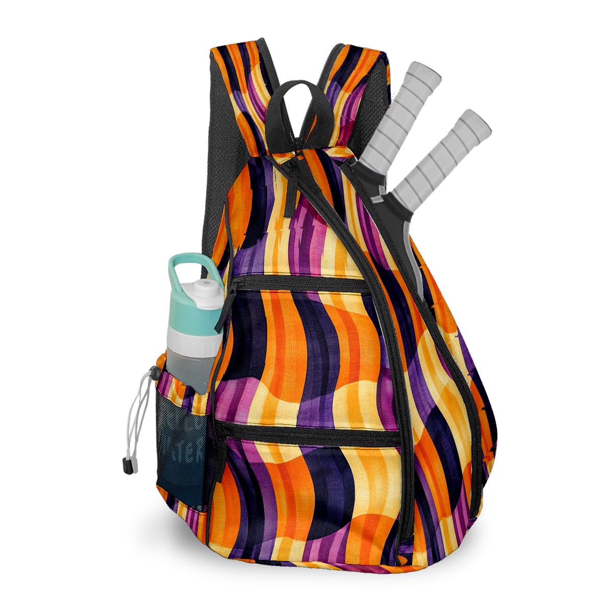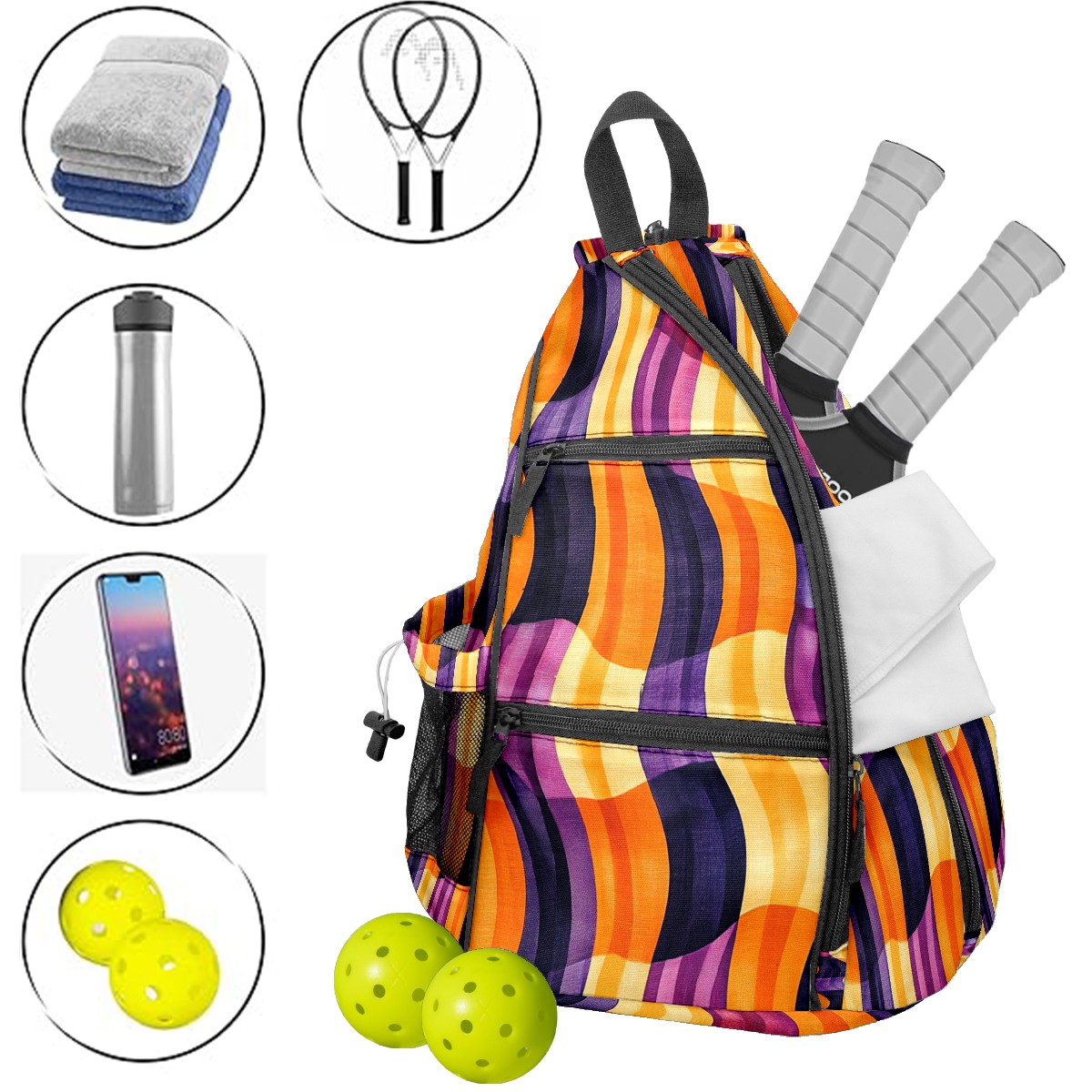Pickleball Sling Bag for Women and Men - Backpack with Nylon Fabric/Woven Strap/Mesh Pocket/Fence Hook/Adjustable Bag Purple Swirling Pattern