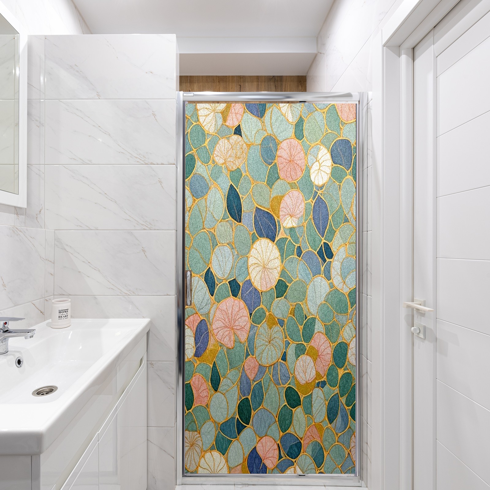 Window Privacy Film Frosted Stained Glass Film Decorative Static Cling for Bathroom Home Office Peel and Stick Window Film Green Gold Leaves Texture(17.7x23.6in)