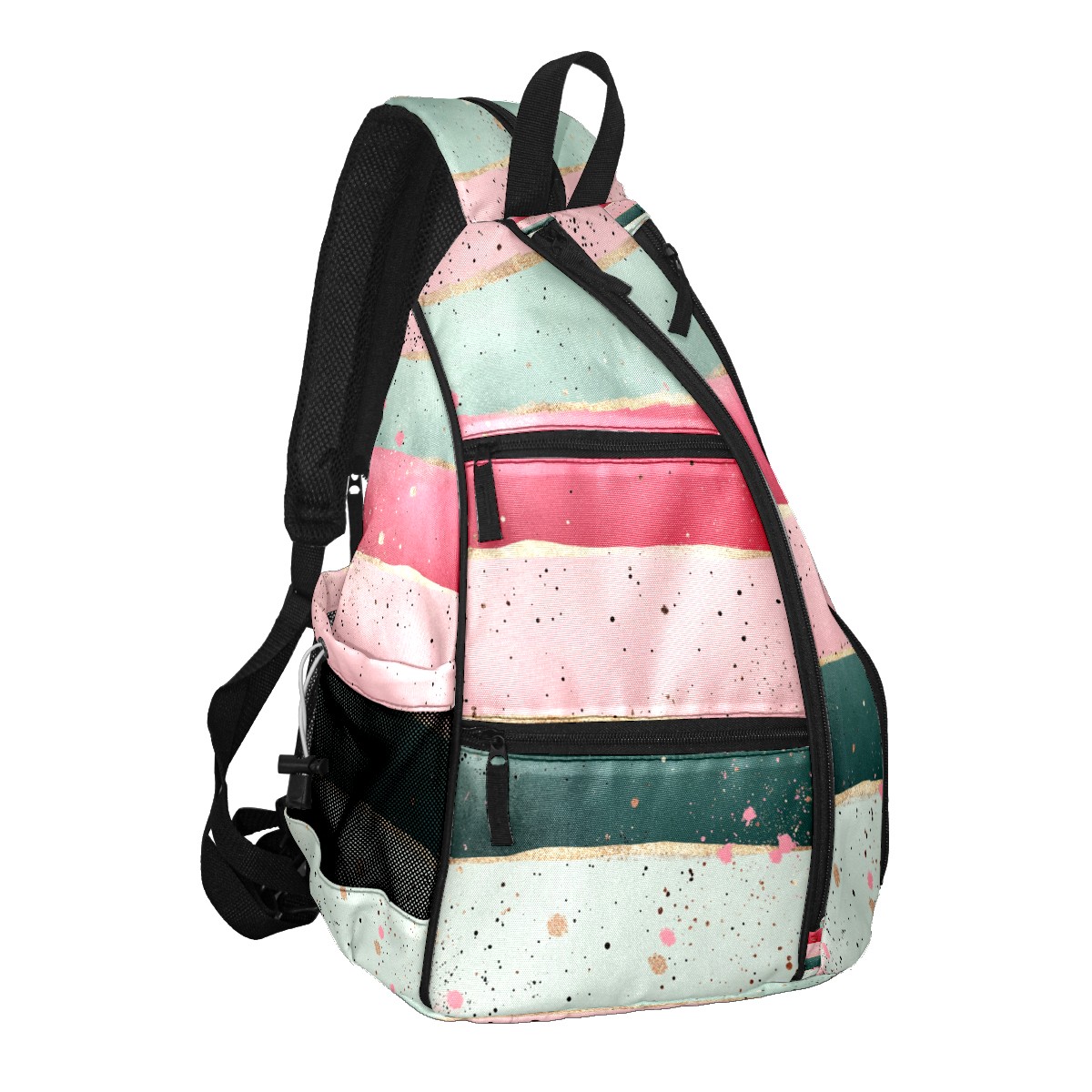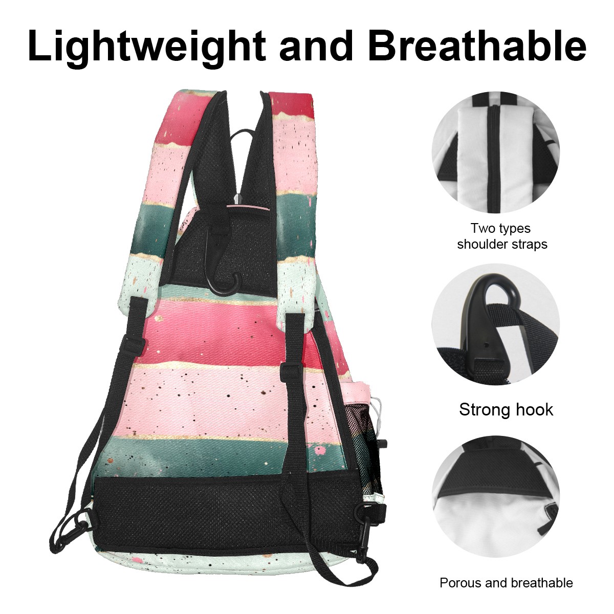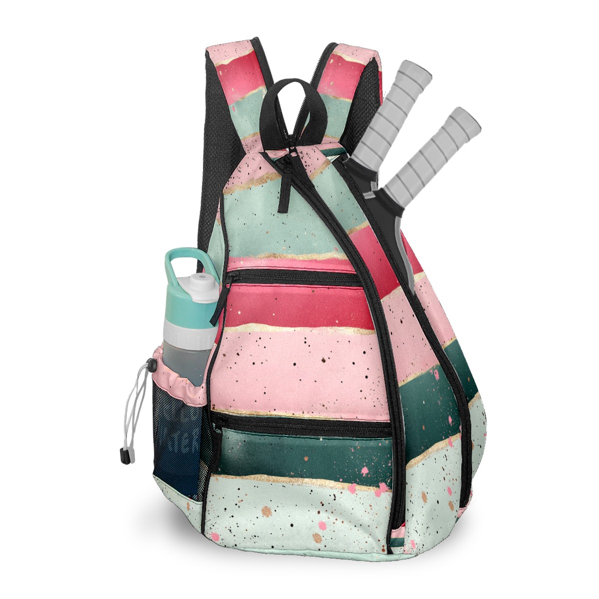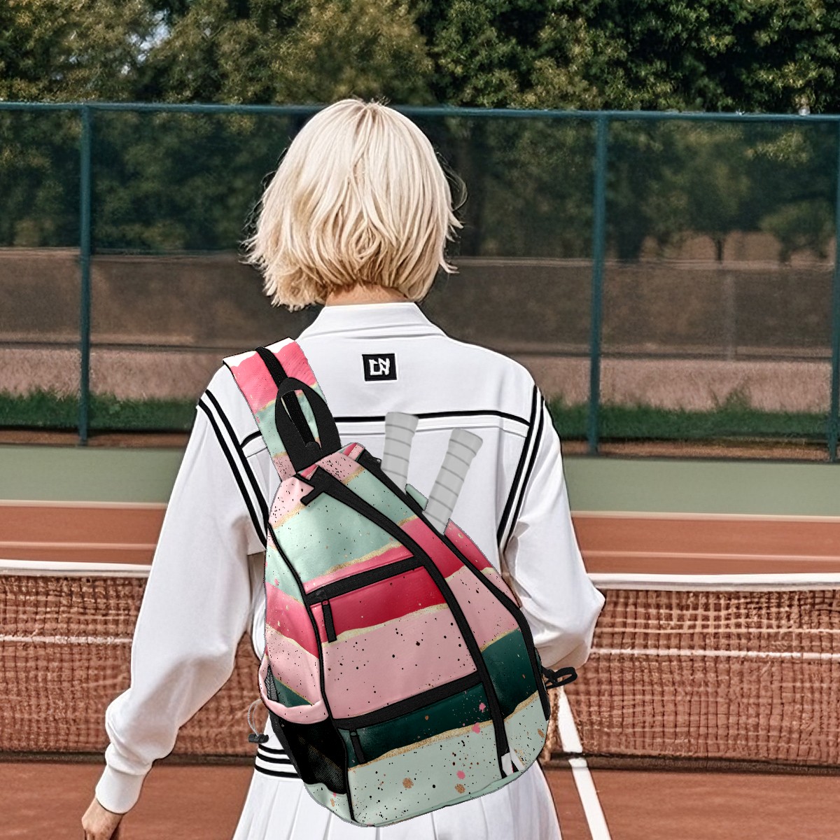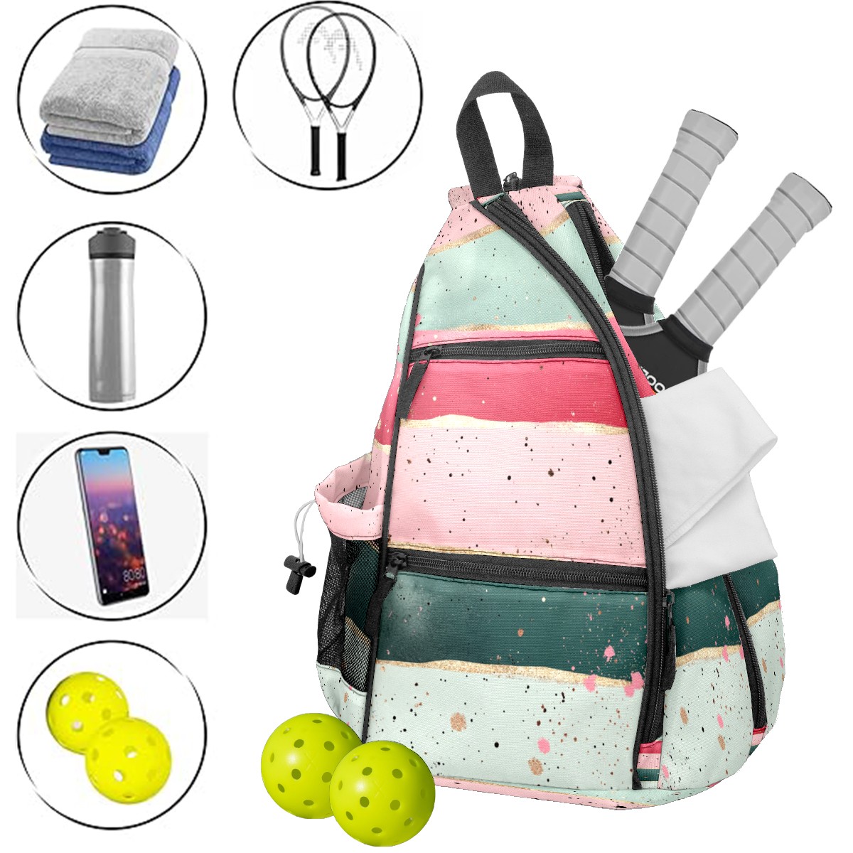 Pickleball Sling Bag for Women and Men - Backpack with Nylon Fabric/Woven Strap/Mesh Pocket/Fence Hook/Adjustable Bag Pink Striped Pattern
