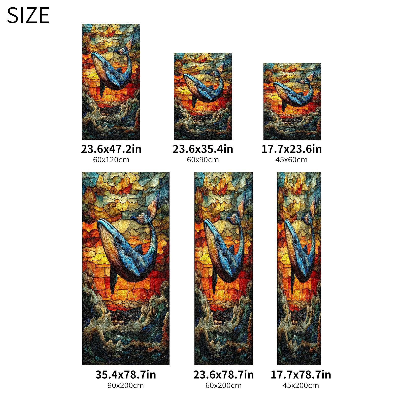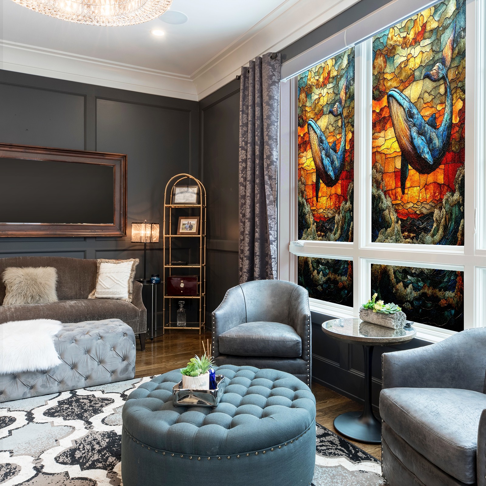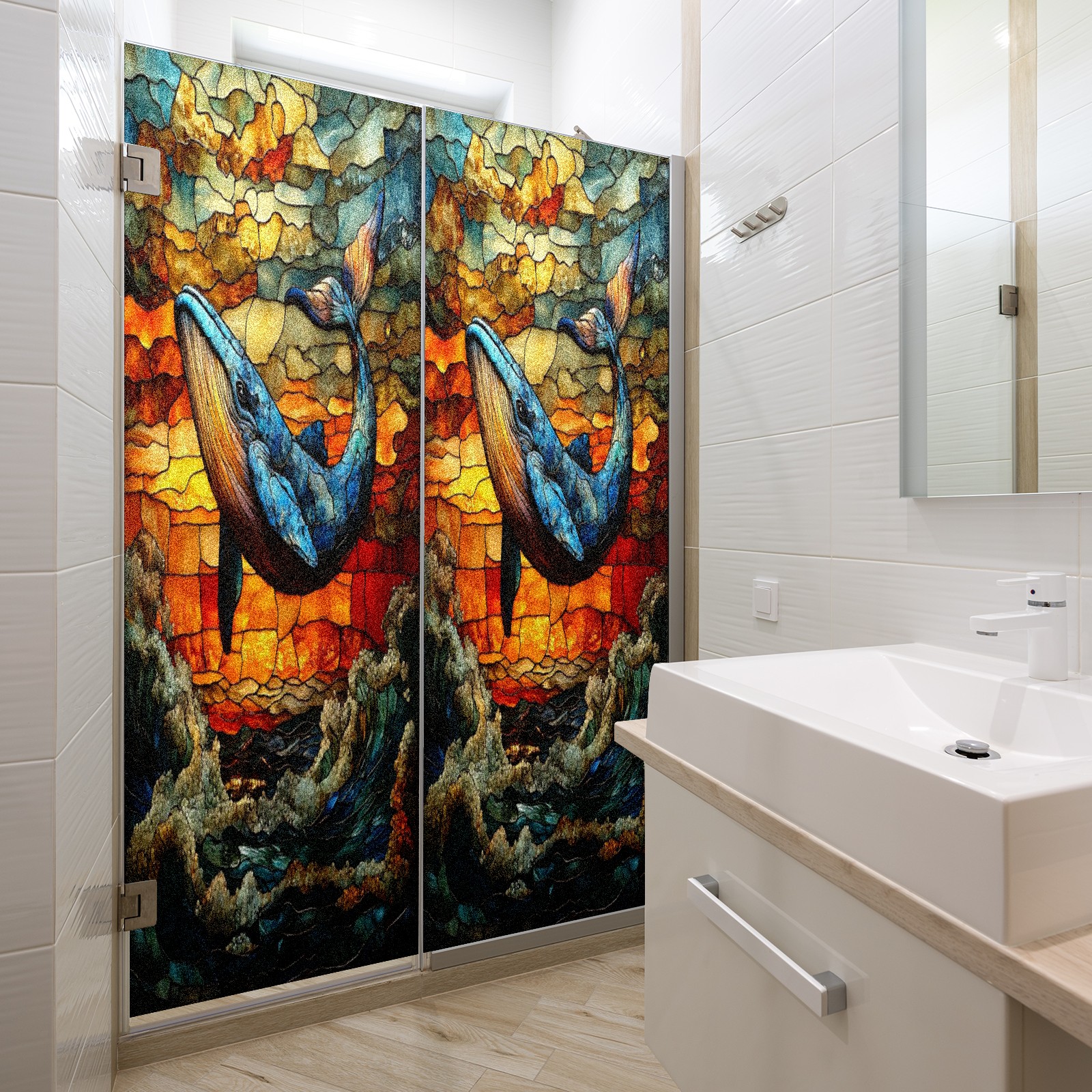 Window Privacy Film Frosted Stained Glass Film Decorative Static Cling for Bathroom Home Office Peel and Stick Window Film Blue Whale Waves(17.7x23.6in)