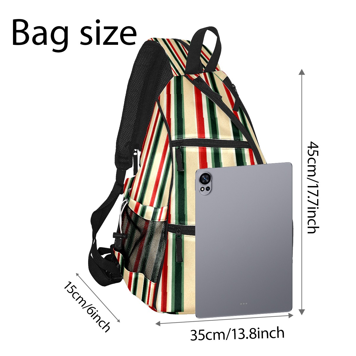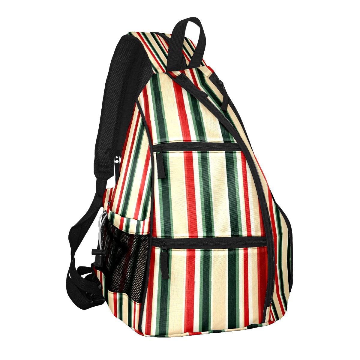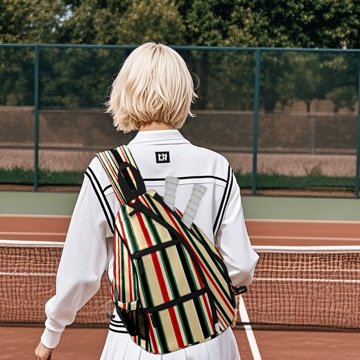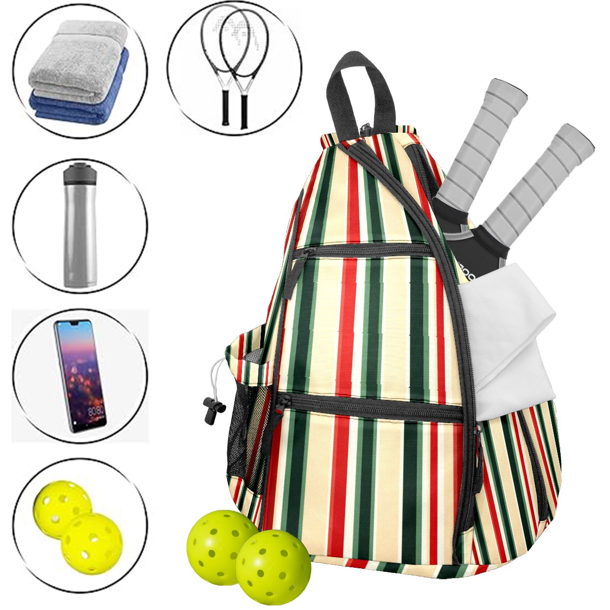 Pickleball Sling Bag for Women and Men - Backpack with Nylon Fabric/Woven Strap/Mesh Pocket/Fence Hook/Adjustable Bag Red Green Striped Pattern
