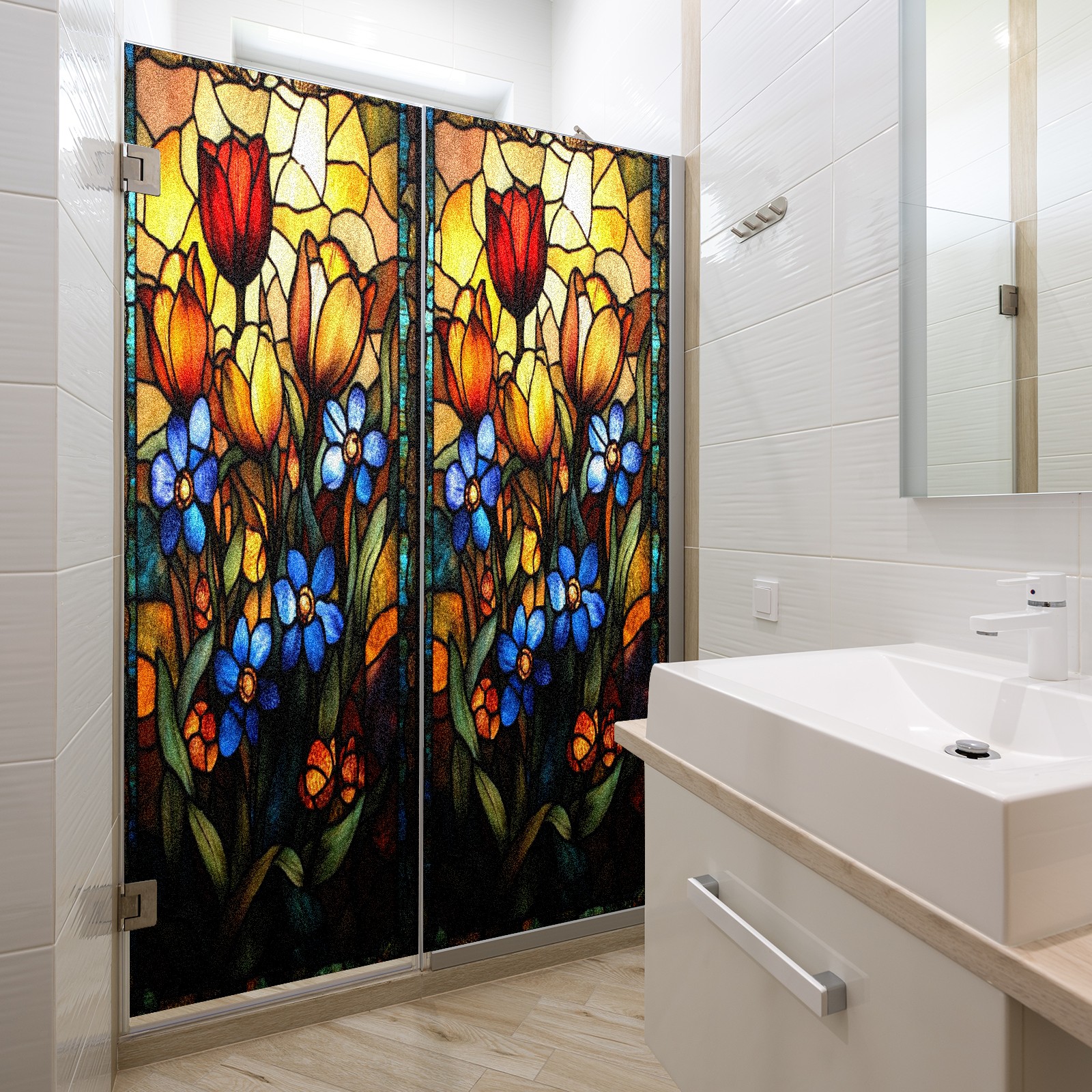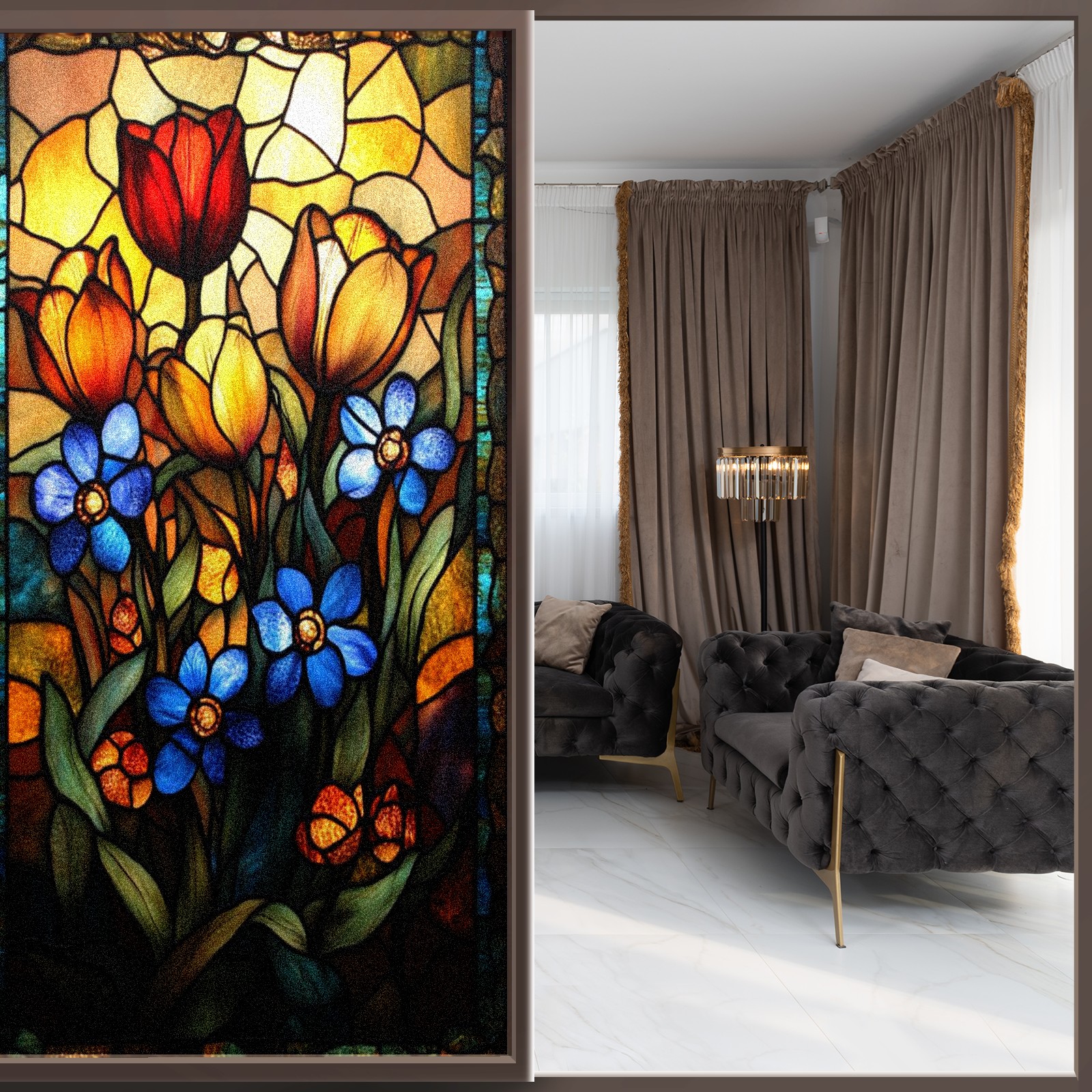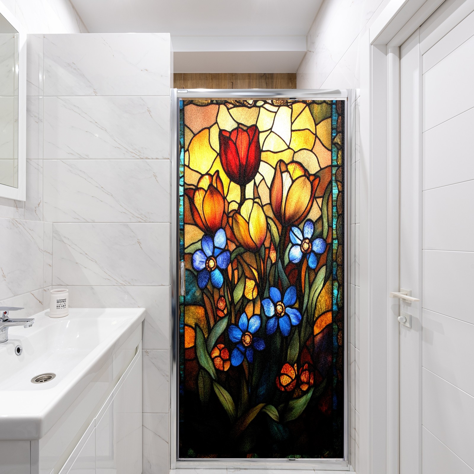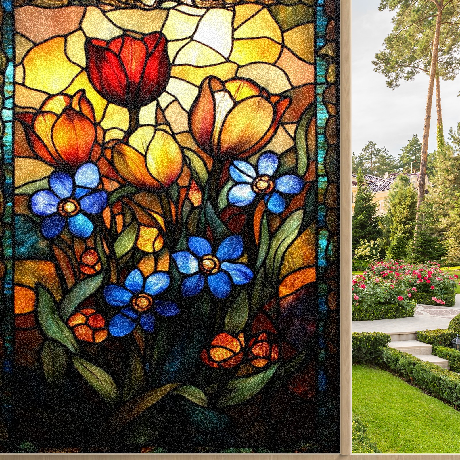 Window Privacy Film Frosted Stained Glass Film Decorative Static Cling for Bathroom Home Office Peel and Stick Window Film Yellow Tulips(17.7x23.6in)
