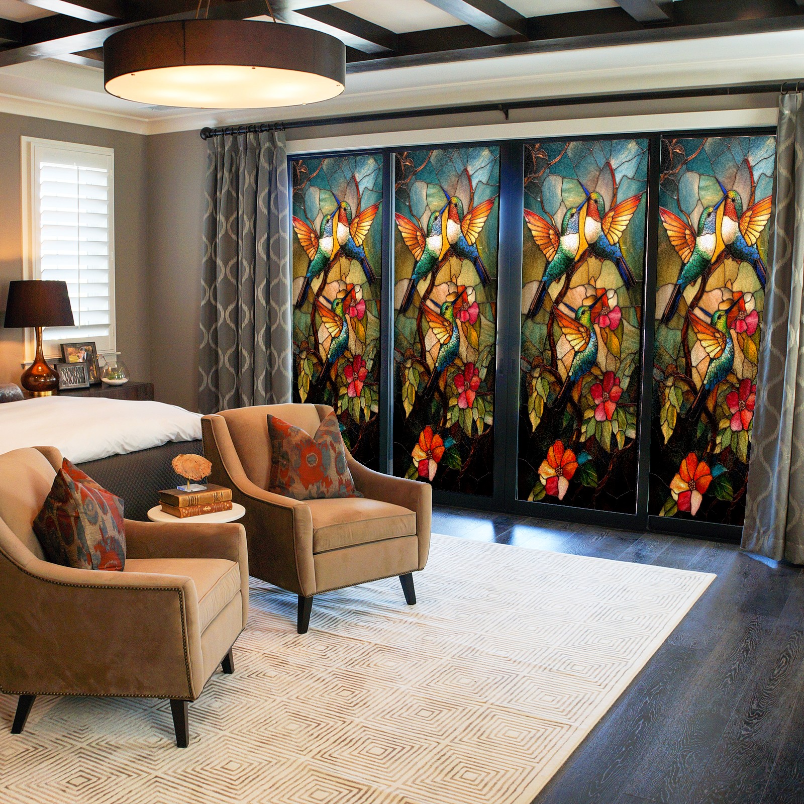 Window Privacy Film Frosted Stained Glass Film Decorative Static Cling for Bathroom Home Office Peel and Stick Window Film Hummingbirds Flowers(17.7x23.6in)