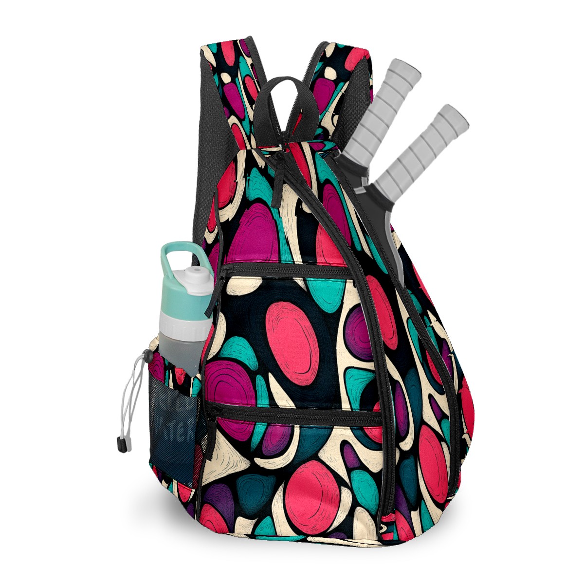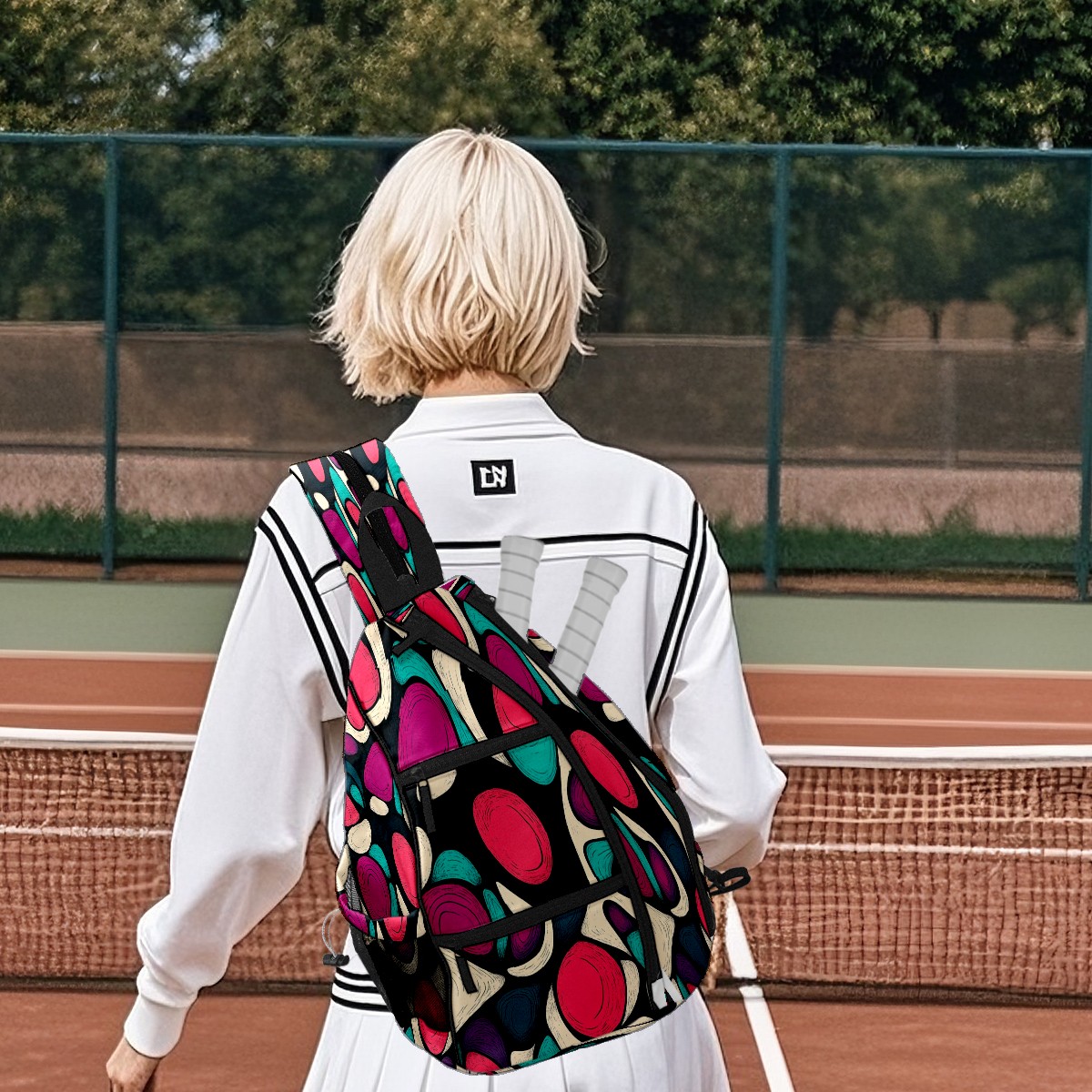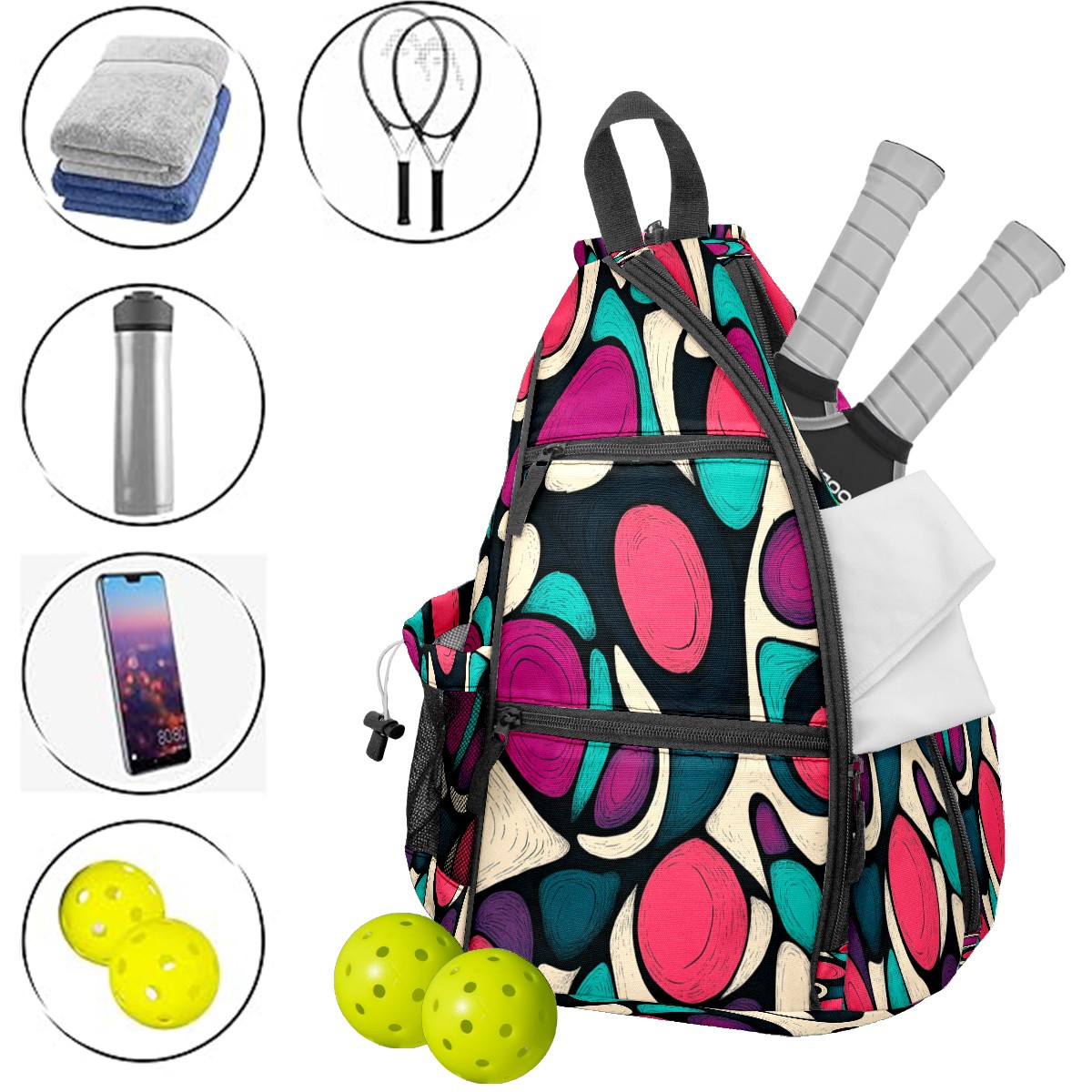 Pickleball Sling Bag for Women and Men - Backpack with Nylon Fabric/Woven Strap/Mesh Pocket/Fence Hook/Adjustable Bag Purple Circle Pattern