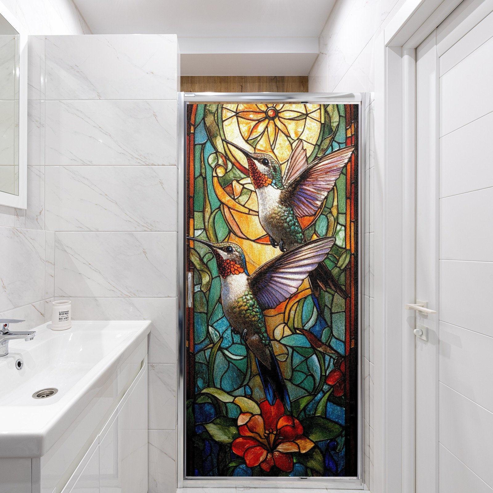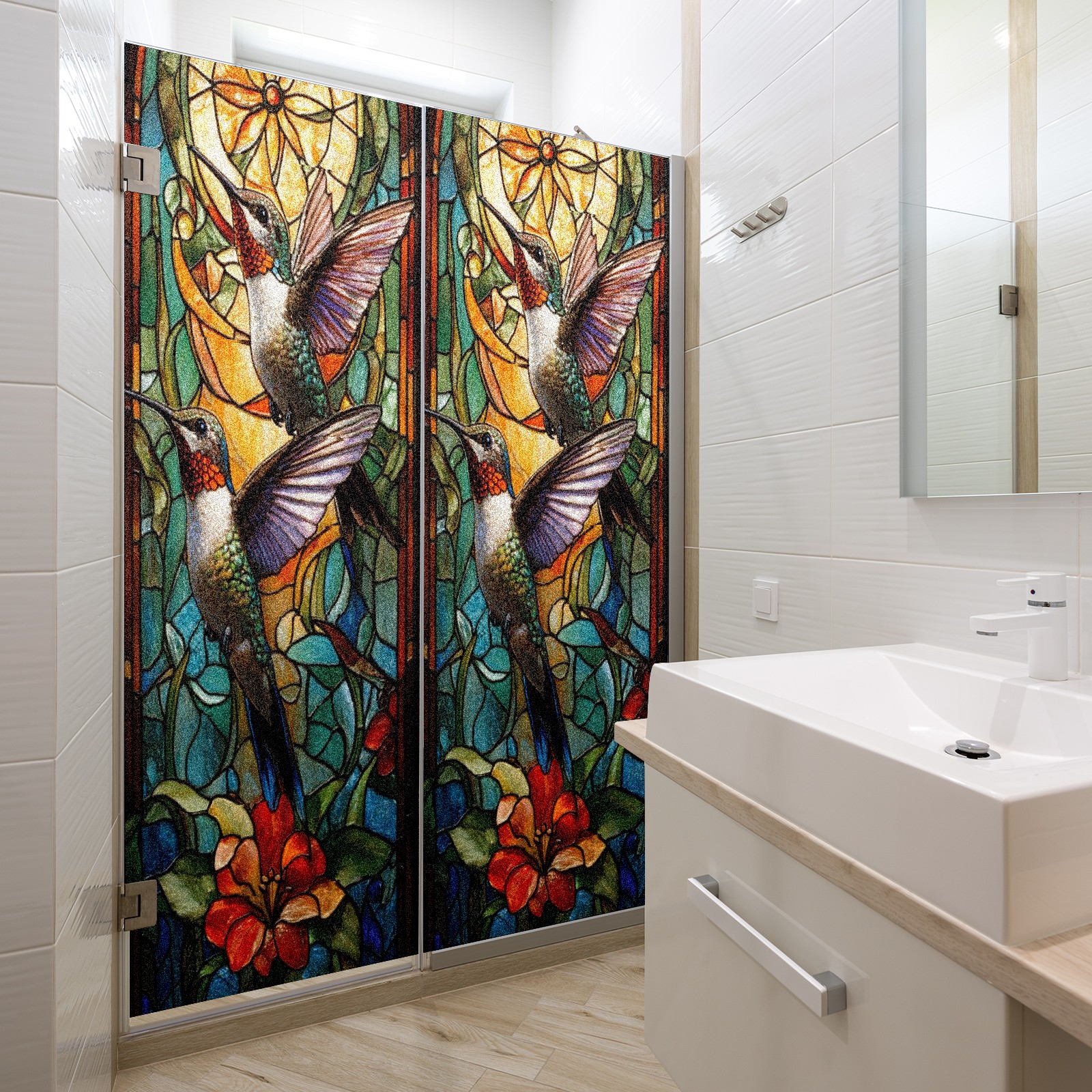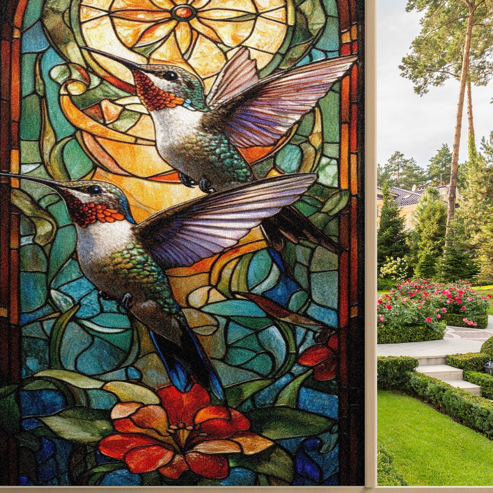 Window Privacy Film Frosted Stained Glass Film Decorative Static Cling for Bathroom Home Office Peel and Stick Window Film Double Hummingbird(17.7x23.6in)